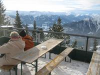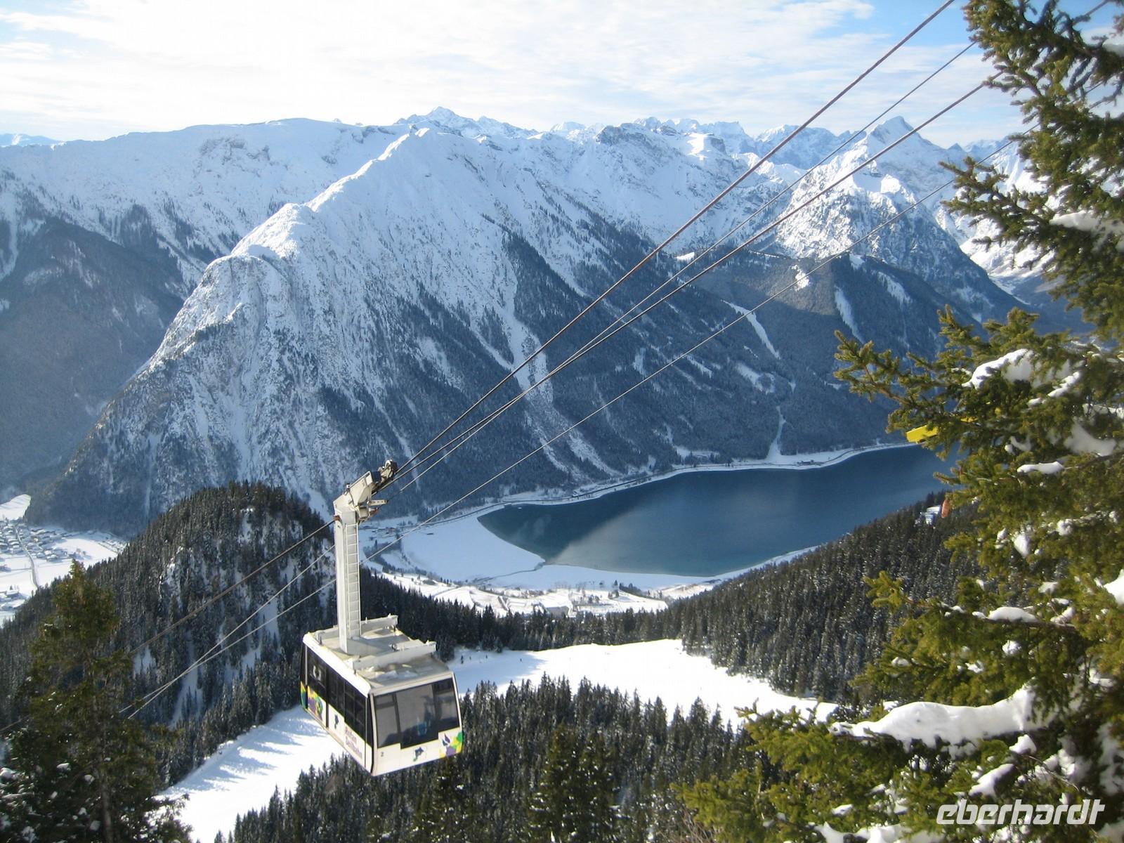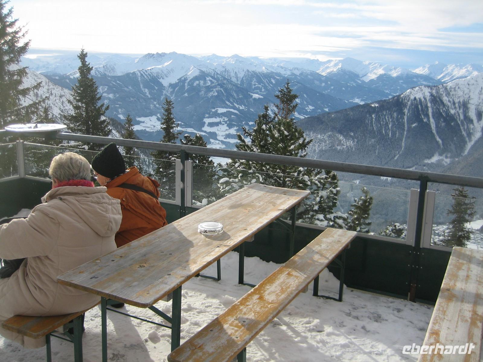 Der sprichwörtliche Höhepunkt unserer Reise steht heute auf dem Programm. Und wie bestellt klart das Wetter heute auch auf. Ohne Umwege machen wir uns auf den Weg zur Talstation der Rofan-Seilbahn in Maurach. Die Auffahrt zur Bergstation in 1840 m Höhe dauert nur 5 Minuten. Oberen angekommen erwartet uns viel Schnee und noch mehr Skifahrer. Etwas orientierungslos begeben wir Fußgänger uns in Getümmel. Nach einigen Schritten offenbart sich uns ein grandioser Blick ins Tal des Achensees.