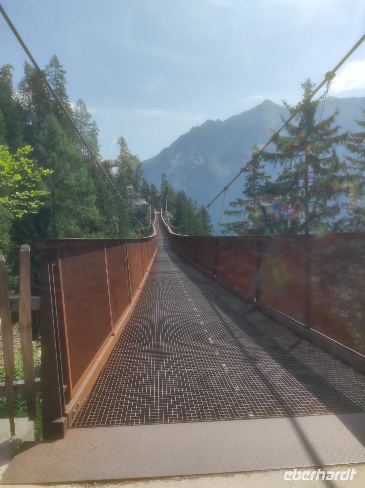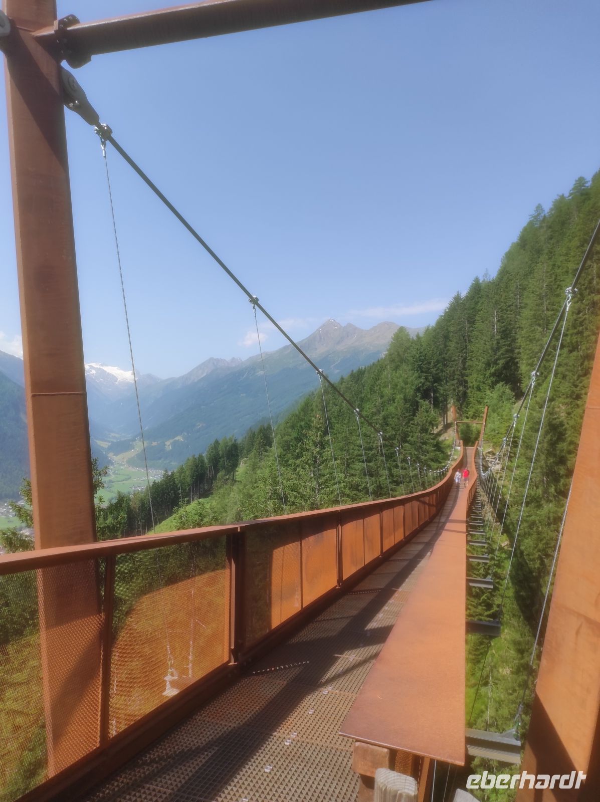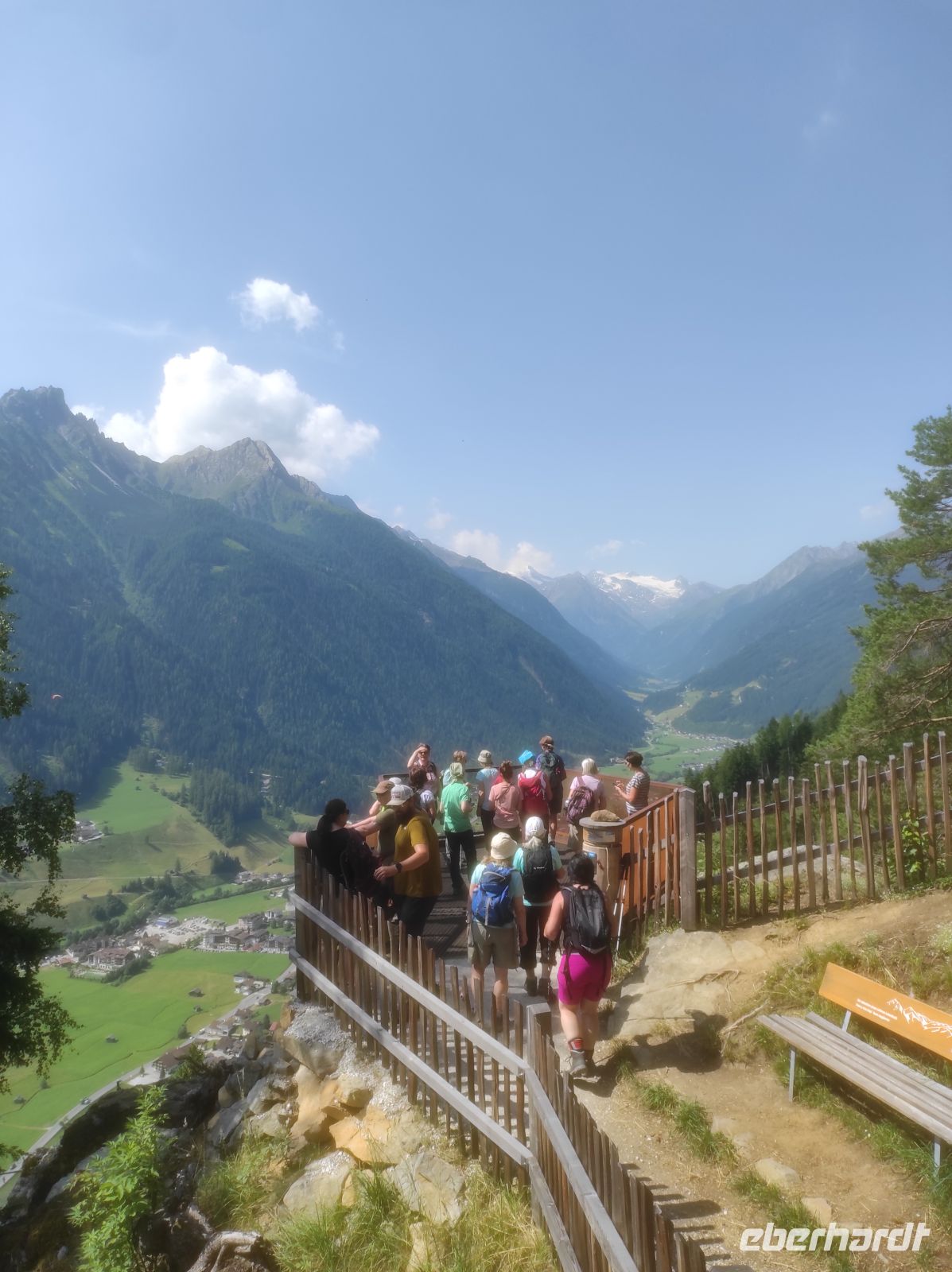 Nach dem Frühstück ging es erneut zu Fuß Richtung Oberkartalm , denn das Wetter verhieß nichts gutes am Nachmkittag, ein heftiges Gewitter war im Anflug und Kevin schaute beobachtete immer wieder die Wolkenformationen, welche Hinweise über einen schnellen Wetterwechsel geben können. So mussten wir umplanem und immer in der Nähe von Fulpmes bleiben, um kurzfristig zu reagieren. Vom Hotel aus ging es entlang des Wanderweges Oberkartalm durch einen Waldweg, der stetig steigend, uns zu einer 70 m langen Hängebrücke führte. Die Überquerung war eine Erlebnis für alle, egal ob Höhenangst oder nicht. Danach führte uns der Weg weiter zum Naturschauspiel Gschmitz, wo man einen schönen Ausichtspunkt hatte und auch mit "Blick ins Tal" schaukeln konnte. Nach einem weiteren Abschnitt wieder runter in Richtung Fulpmes erreichten wir den Gastholf Vergör, wo wir uns noch einmal die lokalen Spezialitäten schmecken ließen.