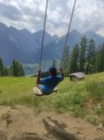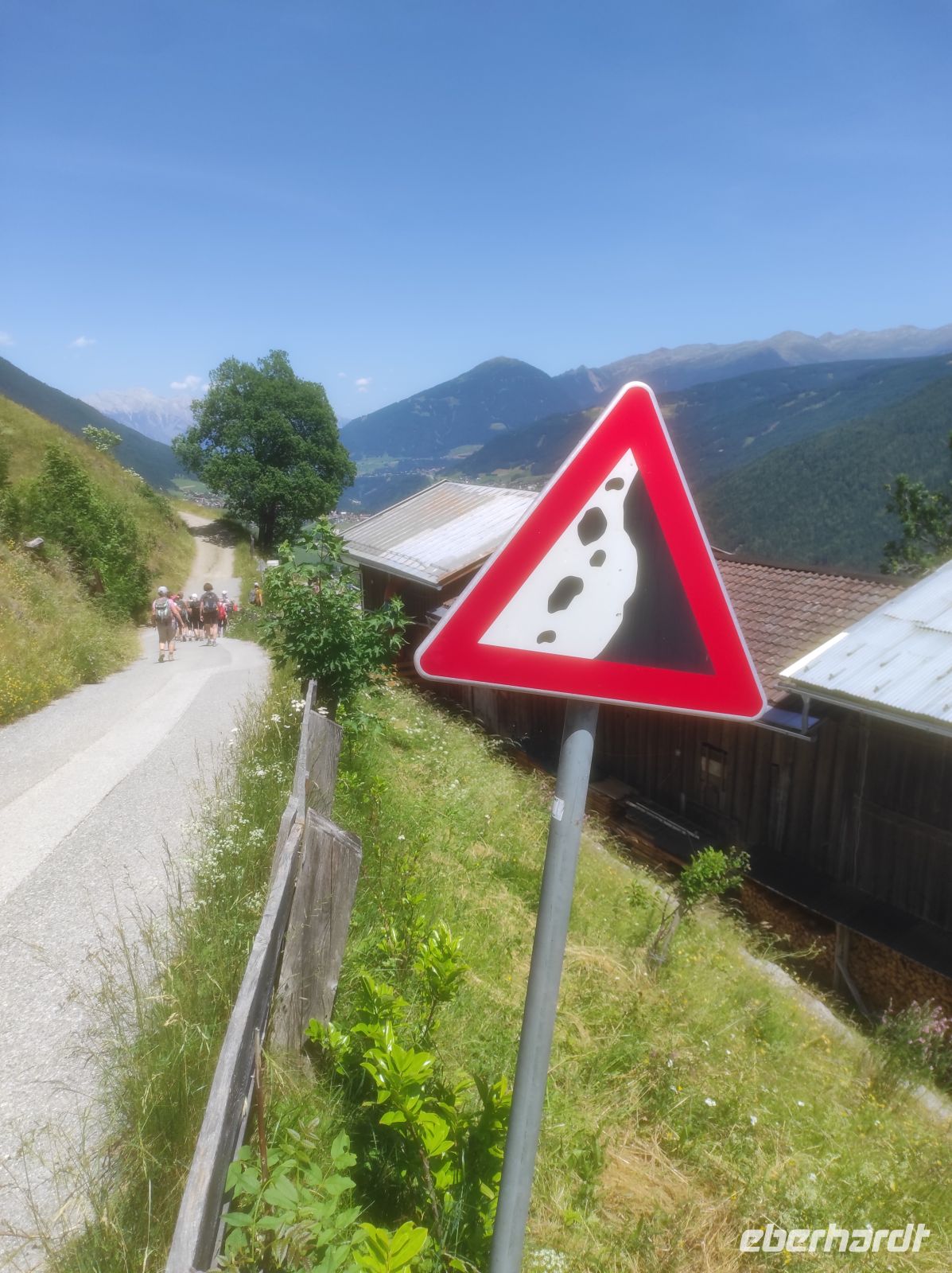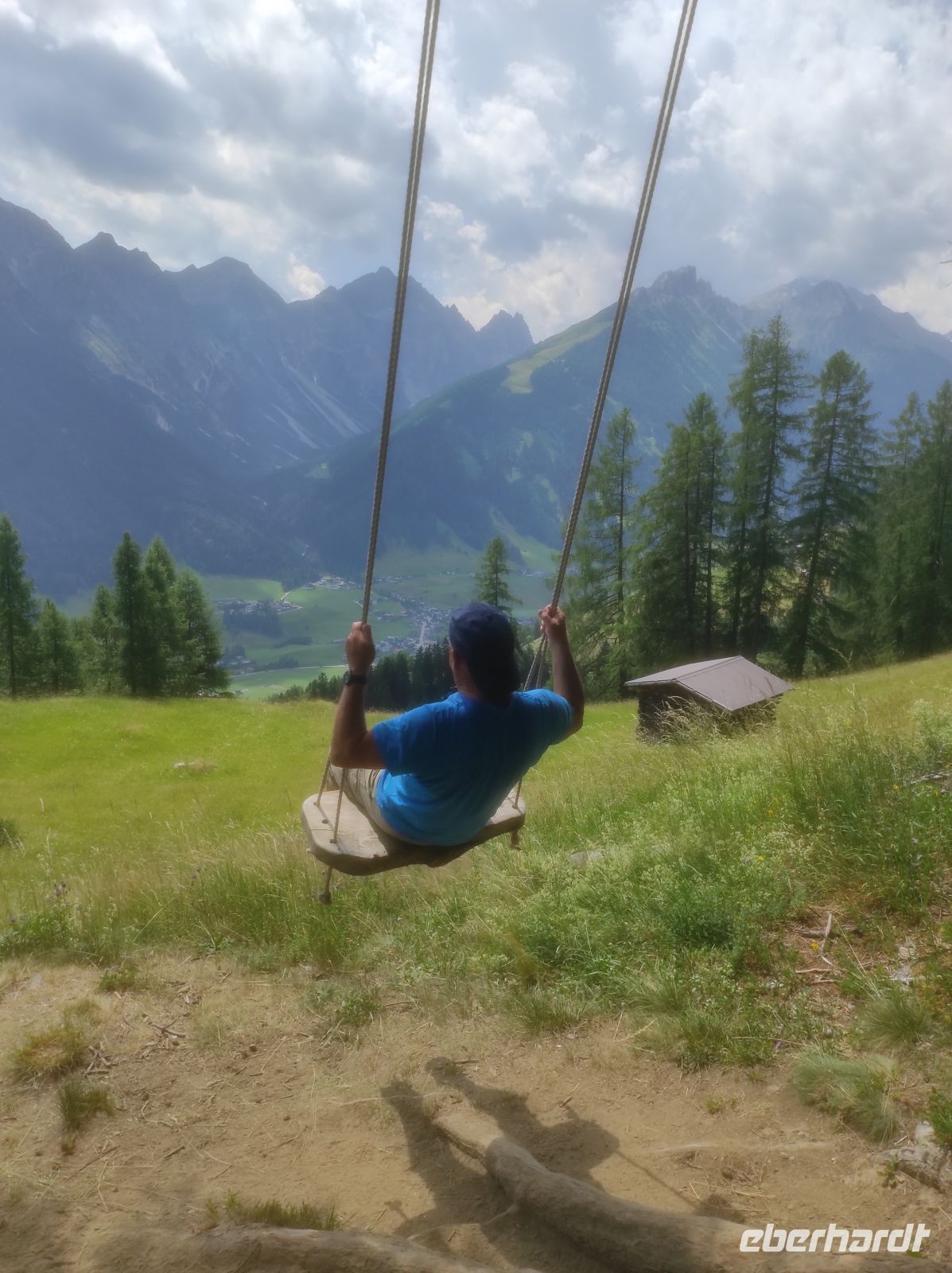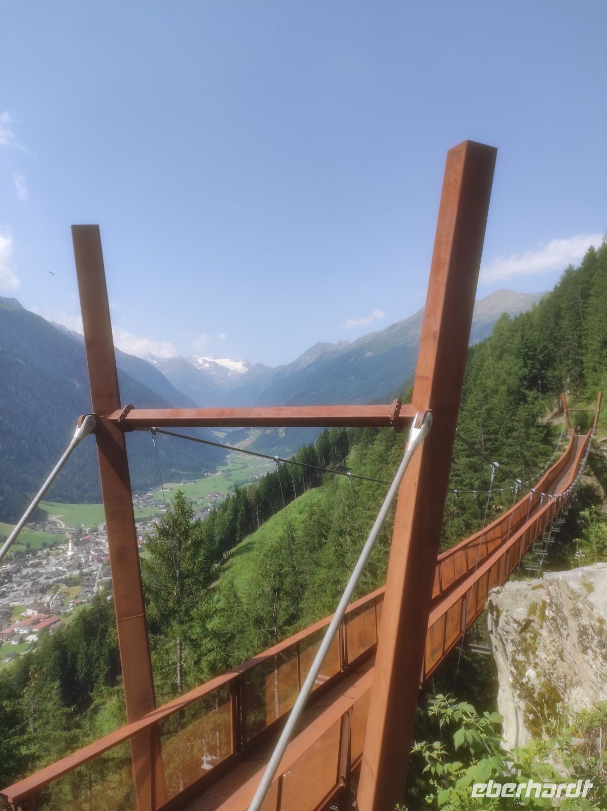 Nach dem Frühstück ging es erneut zu Fuß Richtung Oberkartalm , denn das Wetter verhieß nichts gutes am Nachmkittag, ein heftiges Gewitter war im Anflug und Kevin schaute beobachtete immer wieder die Wolkenformationen, welche Hinweise über einen schnellen Wetterwechsel geben können. So mussten wir umplanem und immer in der Nähe von Fulpmes bleiben, um kurzfristig zu reagieren. Vom Hotel aus ging es entlang des Wanderweges Oberkartalm durch einen Waldweg, der stetig steigend, uns zu einer 70 m langen Hängebrücke führte. Die Überquerung war eine Erlebnis für alle, egal ob Höhenangst oder nicht. Danach führte uns der Weg weiter zum Naturschauspiel Gschmitz, wo man einen schönen Ausichtspunkt hatte und auch mit "Blick ins Tal" schaukeln konnte. Nach einem weiteren Abschnitt wieder runter in Richtung Fulpmes erreichten wir den Gastholf Vergör, wo wir uns noch einmal die lokalen Spezialitäten schmecken ließen.