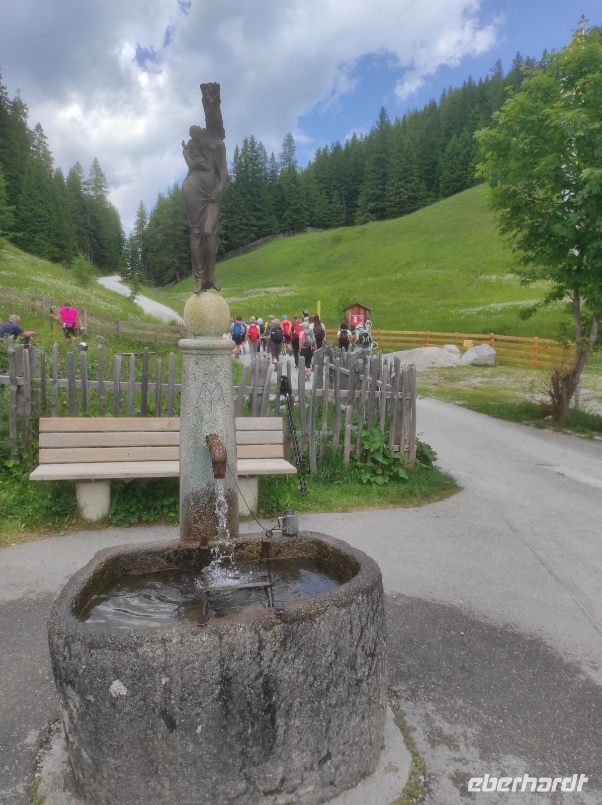 Ein stetig ansteigender Wanderweg führte uns zum heutigen Tagesziel dem Waldraster Jöchel, versehen mit einem Gipfelkreuz und mit 1878 m Höhe dem höchsten Punkt der Wanderung. Ein kurzer Abstieg führte nun endlich zum Tageshighlight Maria Waldrast dem höchten gelegen Kloster Europas. Nun war Pause, man konnte seine Waden erfrischen beim Wasser "treten" oder sich an dem Quellwasser erfrischen.