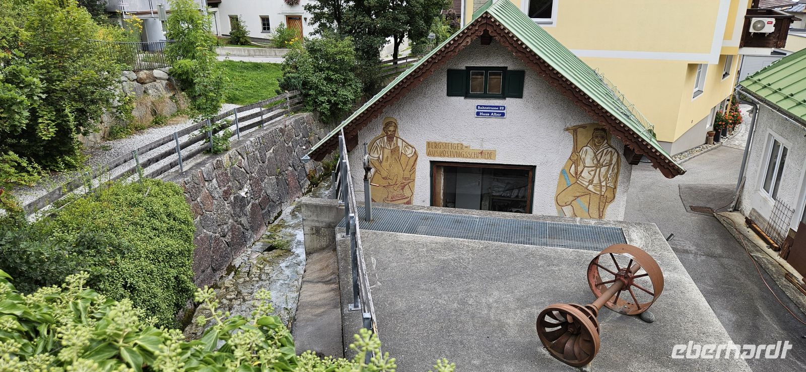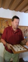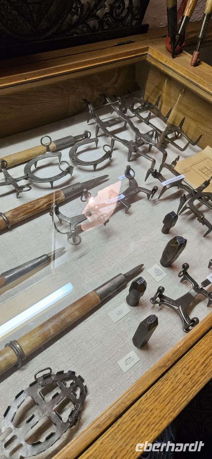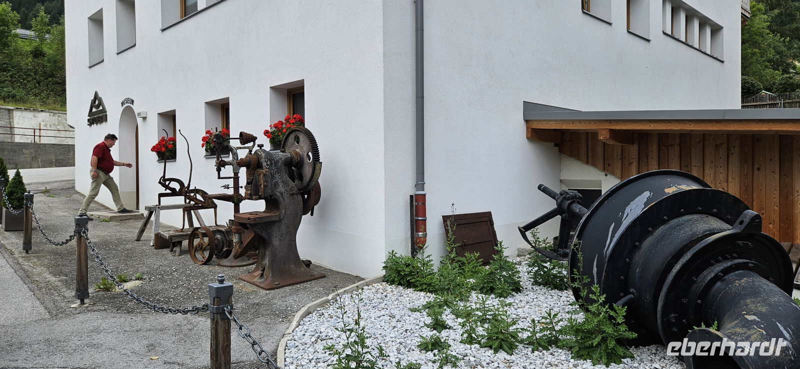 7.30 Uhr gab es wieder Frühstück und 9 Uhr trafen wir uns mit Kevin und seinem Husky Loki auf dem Parkplatz an der Talstation der Bergbahn zum Kreuzjoch. Mit unseren Gästekarten erhielten wir den kostenlosen Zugang zur Seilbahn und fuhren gleich bis ganz hinauf auf 2105 Meter Höhe. Es war traumhaft schönes Wetter, die Sonne schien und wir hatten eine wunderbare Fernsicht von der Aussichtsplattform StuBaiblick. Kevin erklärte uns alle Berge ringsherum und wir machten unzählige Fotos. Dann fuhren wir zurück bis zur Mittelstation und wanderten auf dem Scheibenweg immer bergan bis zum Panorama See. Leider war dort für uns Menschen Baden verboten. Aber Loki schleckte das frische Gebirgswasser genüsslich. Dann wanderten wir weiter bergan bis zu einem weiteren See unter der Seilbahn. Wir kamen vorbei an der Galtalm und ab dort führte unser Weg sehr steil bergab durch den Wald. Schließlich erreichten wir die Vergöl Alm und dort endlich gab es unsere wohl verdiente Mittagspause. Ausgeruht und gut gestärkt wanderten wir nach dem Essen immer bergab auf einem breiten Forstweg bis zur Talstation der Kreuzjoch Bahn. Am Parkplatz informierte uns Kevin zu den Wanderoptionen am nächsten Tag. Dann verabschiedeten wir uns von Kevin und Loki und spazierten zurück zum Hotel. Einige Singles nutzten wieder die Jause im Hotel und heute gab es einen sehr leckeren Schokoladen Kuchen. 16 Uhr trafen wir uns mit Carl Heinz und er führte uns eine Stunde durch Fulpmes. Wir begannen die Besichtigung am Gregor Schlierensauer Platz. Dort steht ein interessantes Denkmal für die Skispringer und auf Tafeln sind die Erfolge vermerkt. Es folgte der Besuch der Kirche mit vielen Informationen zum Bau der Kirchen in Tirol. Im Gebiet der heutigen Schlick 2000 wurde einst Eisenerz abgebaut und in Fulpmes entstanden viele Schmieden am stark wasserführenden Bach. Zuletzt waren 42 Schmiedebetriebe tätig und vor ca.35 Jahren wurde nach und nach alle Schmieden im Dorf geschlossen und diese Produktion in ein modernes Gewerbegebiet am Rande von Fulpmes verlegt. In der Schmiedeindustrie sind heute noch 1000 Menschen beschäftigt. Im Schmiedemuseum zeigte uns Carl Heinz die grosse Palette an schmiedeeisernen Produkten, die einst in Fulpmes gefertigt wurden.