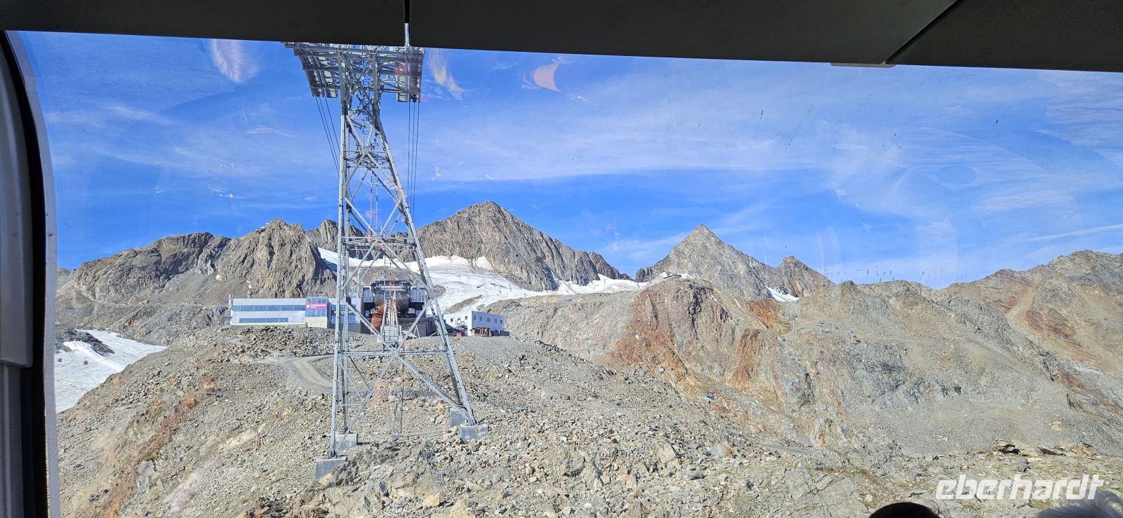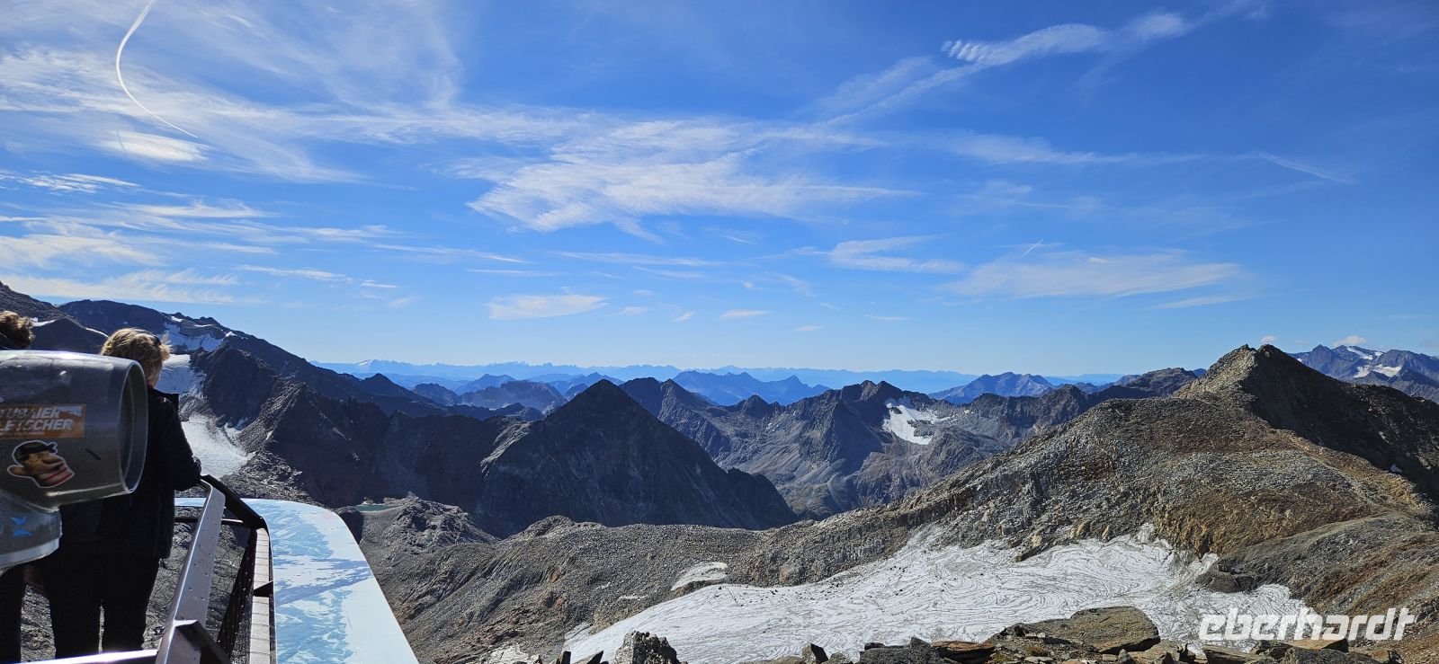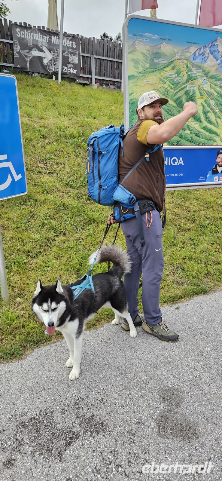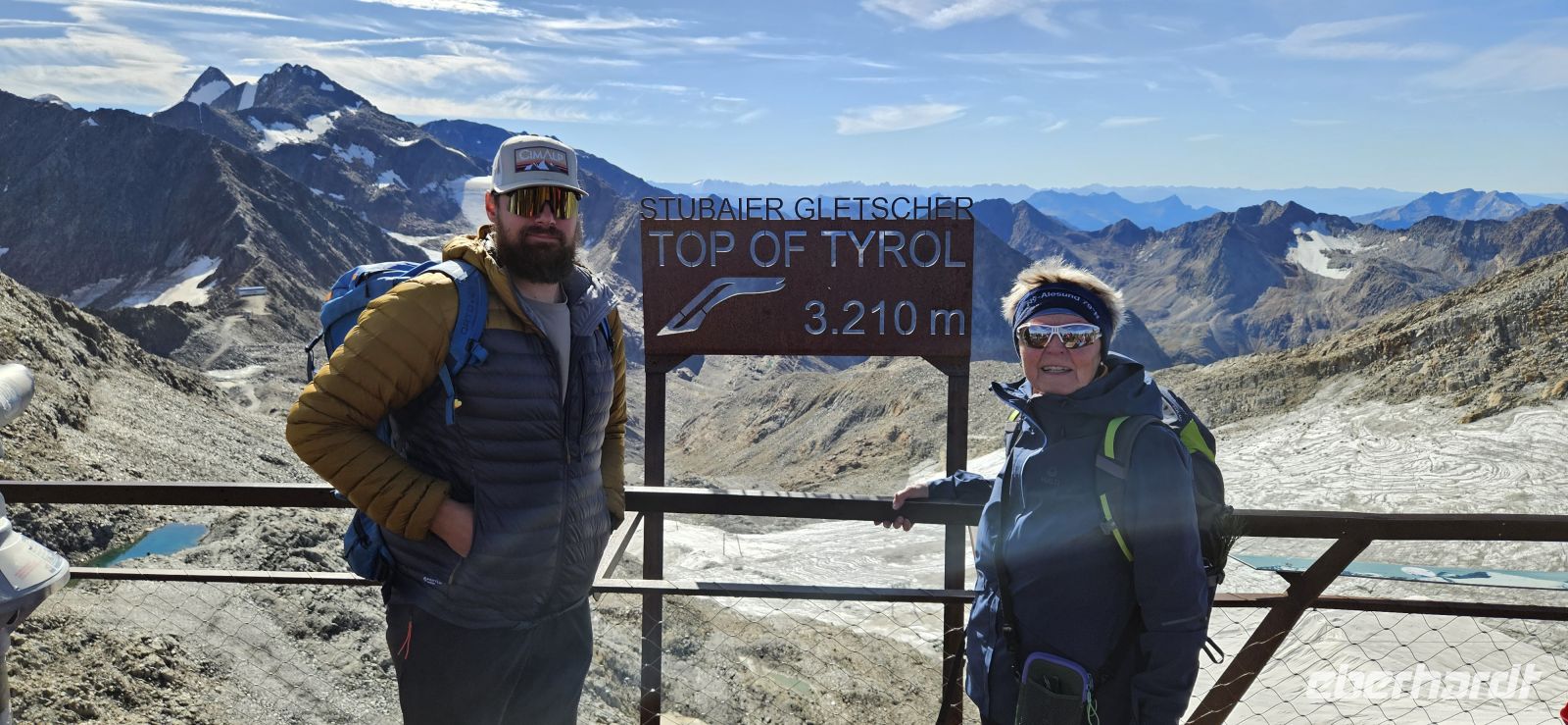 Heute nun war unser letzter Wandertag im Stubaital angebrochen und da gab es eine ganz besondere Überraschung. Mit einem frühen Bus fuhren wir bis zum Talende an der Mutterbergalm. Mit der Stubaier Gletscher Bahn ging es dann vorbei an der Dresdner Hütte bis zur Bergstation Eisgrat auf 2900 m Höhe. Dort konnte man sich gut unterhalten und z.B. das riesjge Mammut bestaunen. Wir fuhren aber mit der nächsten Gondelbahn hinauf zur Schaufelspitze und über eine Eisenleiter stiegen wir hinauf zum Top of Tirol in 3210 m Höhe. Die Luft war dünn dort oben und so gingen wir ganz langsam. Oben auf dem Plateau war die Sicht grandios, hinüber zu den Ötztaler Alpen und nach Südtirol bis hin zur Marmolada, dem Schlern und dem Rosengarten. Jeder liess sich am Schild Top of Tirol 3210 m fotografieren und wir waren einfach nur überwältigt vom Ausblick auf die Bergwelt. Auch die Talfahrt mit der Gondelbahn war nochmal ein Erlebnis und unten im Tal legten wir erst einmal die warme Kleidung ab. Nun begann unsere gemütliche Wanderung auf dem Wilde Wasser Weg immer an der Rüetz entlang. Wir kamen auch wieder am Grawa Wasserfall vorbei und diesmal war er in der Sonne und bot ein wunderschönes Fotomotiv. Ein Stück weiter talwärts am Bach legten wir eine Pause ein und stießen mit einem Zirbenlikör auf unsere schöne Wanderung an. Dann wanderten wir weiter talwärts und unsere Mittagspause war in der Tschangenairalm geplant. Dort herrschte aber mächtiger Andrang und man hatte die Reservierung für unsere Gruppe verschusselt. Nun war guter Rat teuer. Ganz spontan schlug Kevin vor, die Mittagspause in der Bsuchalm zu machen und das bedeutete nochmal eine Wanderung von 40 Minuten immer bergan. Diese Mühe lohnte sich aber, denn 14 Uhr waren kaum noch Gäste auf der Bsuchalm und wir hatten wunderschöne Tische im Freien mit einem traumhaften Rundblick am Talende des Langentals. Unsere bestellten Speisen wurden alle frisch zubereitet und es schmeckte alles sehr gut. Nach eineinhalb Stunden traten wir den Rückweg ins Tal an und erreichten auch gleich einen Bus unten im Tal. In der Ortsmitte Fulpmes stiegen wir aus und verabschiedeten uns sehr herzlich von Kevin, unserem Bergführer. Er hatte uns an 5 Tagen auf unseren Wanderungen geführt, die Touren wurden immer dem Wetter angepasst und wir haben von ihm viel über die Bergwelt Tirols erfahren. An 3 Wanderetappen hatte er seinen Husky Loki dabei und der Hund war ein echter Freund.