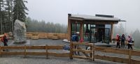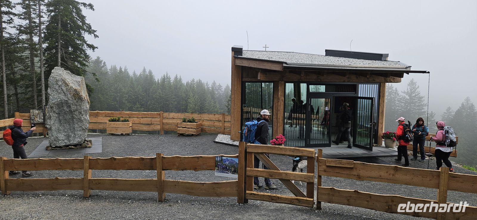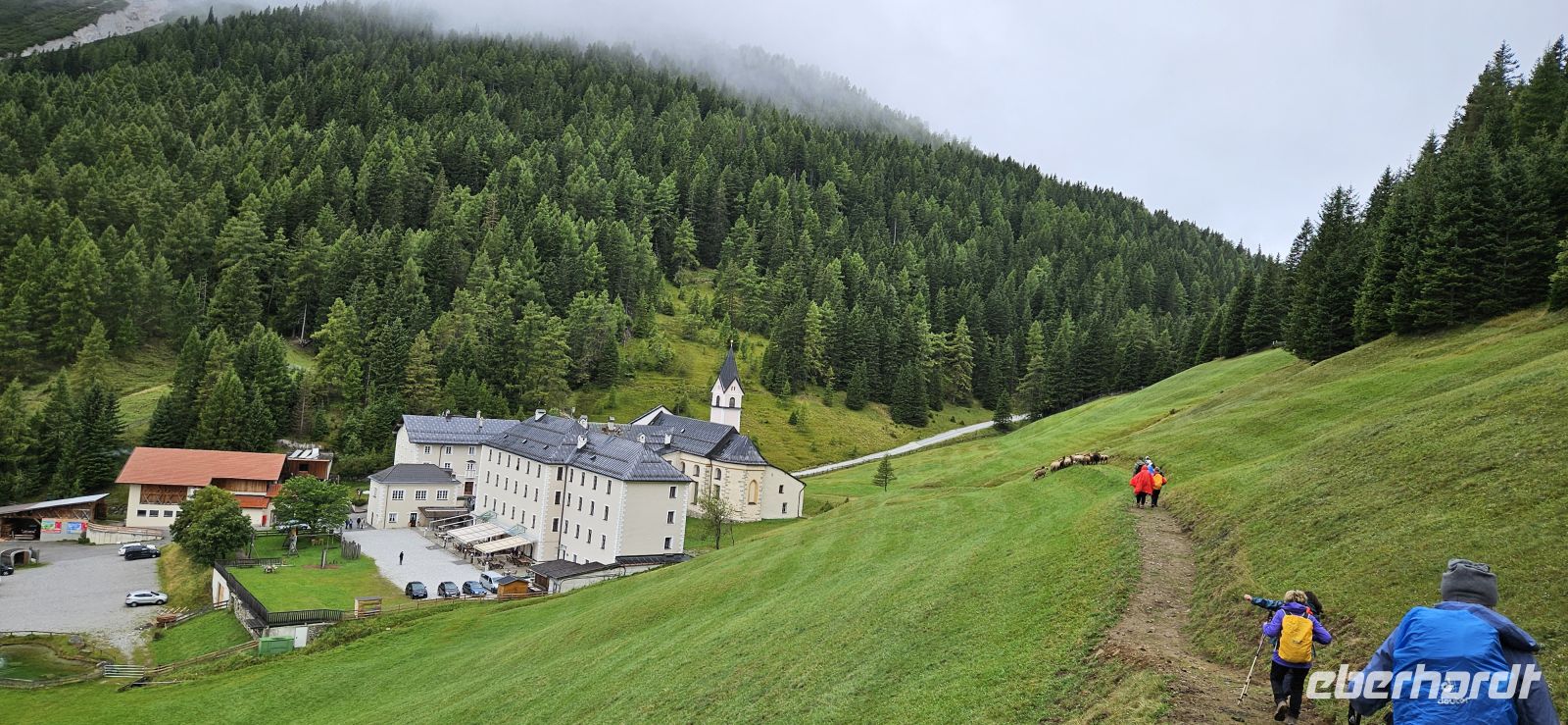 Für heute war Regen vorhergesagt, und deshalb fiel auch erst am Morgen die Entscheidung über unser heutiges Wanderziel. Kevin hatte für unsere Gruppe die Wanderung zum Kloster Maria Waldrast herausgesucht und das war eine sehr gute Entscheidung. Wir fuhren mit dem Bus zur Talstation der Serlesbahn in Mieders und trafen dort Kevin mit Loki. In nur wenigen Minuten erreichten wir die Bergstation Koppeneck auf 1605 Meter Höhe. Leider waren wir in den Wolken und konnten die tolle Aussicht bis nach Innsbruck nicht geniesen. Wir wanderten zunächst zur ganz neuen Bergkapelle mit Serlesblick und waren von der schlichten Architektur beeindruckt. Unser Weg führte weiter mal auf schmalen, mal auf breiten Weg bergauf und bergab und so umrundeten wir das Waldraster Jöchl in einem grossen Bogen und kamen von oben zum Kloster Maria Waldrast zur Mittagspause an. Zum Komplex des Klosters gehören eine Kirche, ein Hotel und natürlich eine traditioneller Gasthof. Wir hatten Glück, denn eine große Wandergruppe verließ gerade den Gasthof und so fanden wir alle sofort Platz und eg gab für uns das Essen recht zügig. Am Brunnen mit dem besonderen Heilwasser füllten wir unsere Wasserflaschen auf und hoffen nun auf Verjüngung!? Zurück zur Bergstation nahmen wir den direkten Weg und machten unterwegs noch einen Stopp, um unser Bergfest zu feiern. Es gab einen Hausschnaps mit Marille und neben dem Bergfest stiessen wir auch noch auf den Geburtstag einer Reiseteilnehmerin an. Beschwingt gingen wir das kurze Stück bis zur Bergstation der Seilbahn. Eine Teilnehmerin entschied sich spontan auf der Sommerrodelbahn ins Tal zu sausen. Wir anderen alle nahmen die Gondeln der Seilbahn zurück ins Tal. Unten kam auch sogleich unser Bus und brachte uns zurück nach Fulpmes.