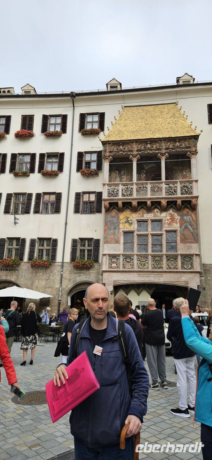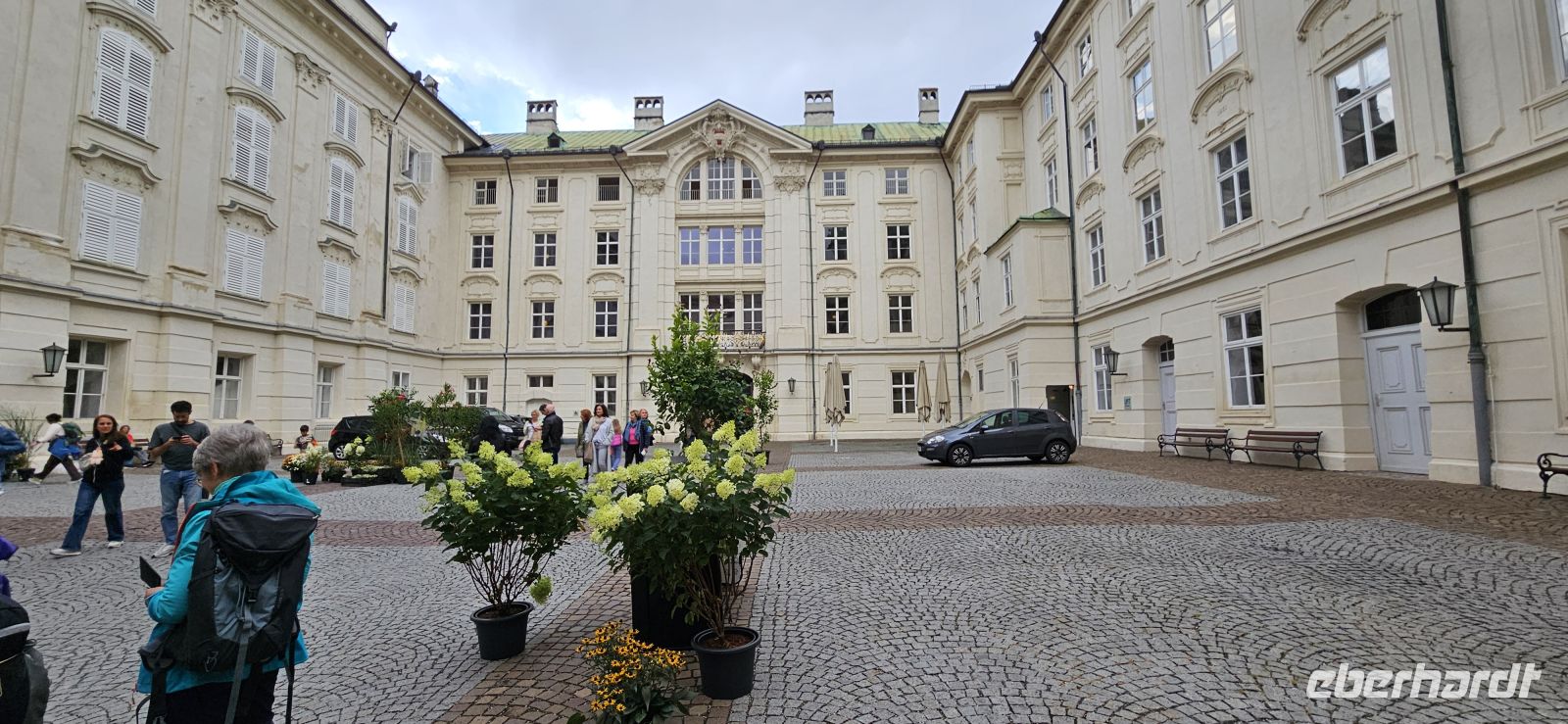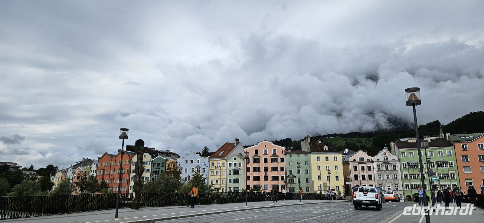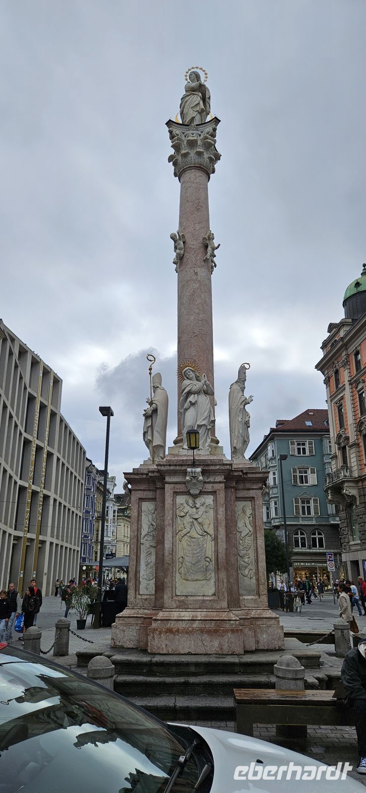 Nach dem Frühstück gingen wir hinunter zur Bushaltestelle und nahmen den Bus 9.15 Uhr nach Innsbruck. 10 Uhr trafen wir uns mit Stadtführer Christian am Bahnhof und wir gingen mit ihm zunächst zur Triumphpforte. Die Pforte wurde anlässlich der Hochzeit von Loepold, Sohn von Maria Teresia, errichtet und am Tag der Hochzeit verstarb der Ehemann Maria Teresias. So hat die Pforte auf der Nordseite traurige Symbole und auf der Südseite die Symbole der Freude. Weiter ging''''''''''''''''''''''''''''''''s zum prächtigen Barockbau des Landtagsgebäudes mit den Symbolen der 4 Stände. Gegenüber liegt das Palais Trapp und das hat als einziges noch den wunderschönen Garten, in dem heute Skulpturen ausgestellt waren. Danach kamen wir am Rathaus vorbei und an der Annasäule. Die heutige Marktgraben Strasse ist dort wo einst der Stadtgraben war und zugleich die Grenze der Altstadt mit der Stadtmauer. Das Kaffeehaus Munding mit dem großen Bildnis des Hl.Christopherus wurde uns wegen der besten heissen Schokolade empfohlen. Dort begannen auch die vielen Stände für das Strassenweinfest, welches am 05. und 6.9.25 stattfand. Weiter gingen wir zur Innbrücke und zum Traditionsgasthaus Goldener Adler und von da war es nicht mehr weit bis zum Goldenen Dachl. Zwei Brautpaare hatten sich gerade in diesem traditionellen Haus das Ja Wort gegeben und wir erfuhren, dass Kaiser Maximillian zweimal verheiratet war und die zweite Frau aus Mailand eine hohe Summe Mitgift in die Ehe brachte. Es folgte die Besichtigung des Domes und der Hofburg und an der Hofkirche beschrieb uns Christian sehr anschaulich das im Inneren befidliche Grab von Kaiser Maximillian mit den 28 Mannln. Zurück am Goldene Dachl endete der Stadtrundgang und nun gab es Freizeit fürs Mittagessen und Bummeln. 13.30 Uhr trafen wir uns wieder und da hatte der Himmel bereits alle Schleusen geöffnet und es regnete stark. Beim Tomaselli, dem besten Eisladen von Innsbruck, gab es für jeden ein Eis seiner Wahl. Da kein Ende des Regens in Sicht war, gingen wir zurück zum Bahnhof und fuhren mit dem Bus nach Fulpmes. Der geplante Besuch der Bergisel Schanze wurde auf den nächsten Tag verlegt.