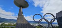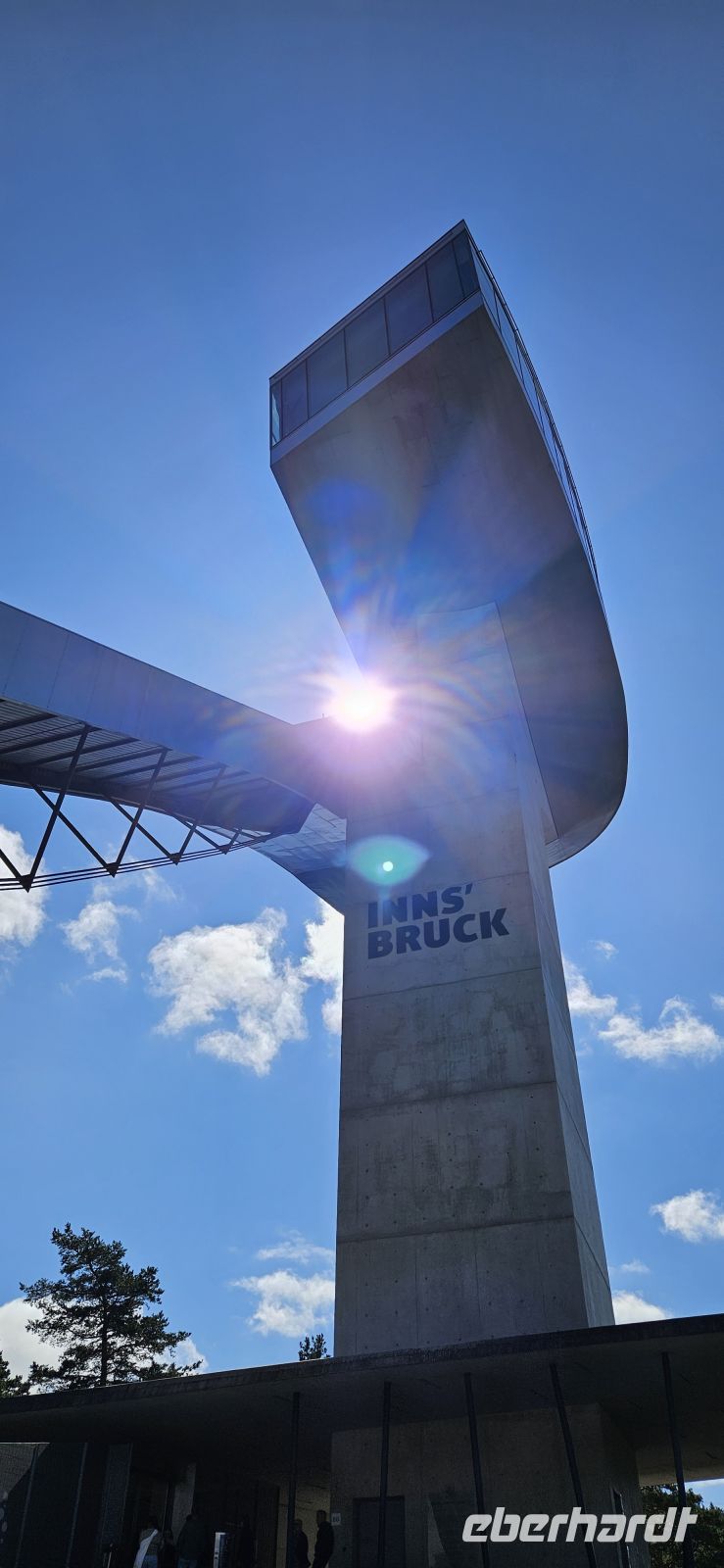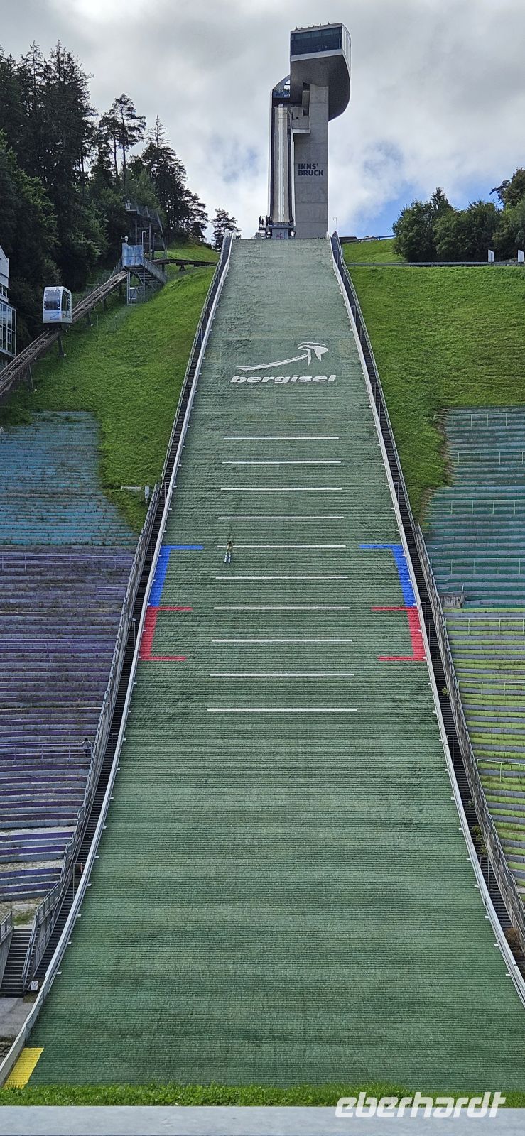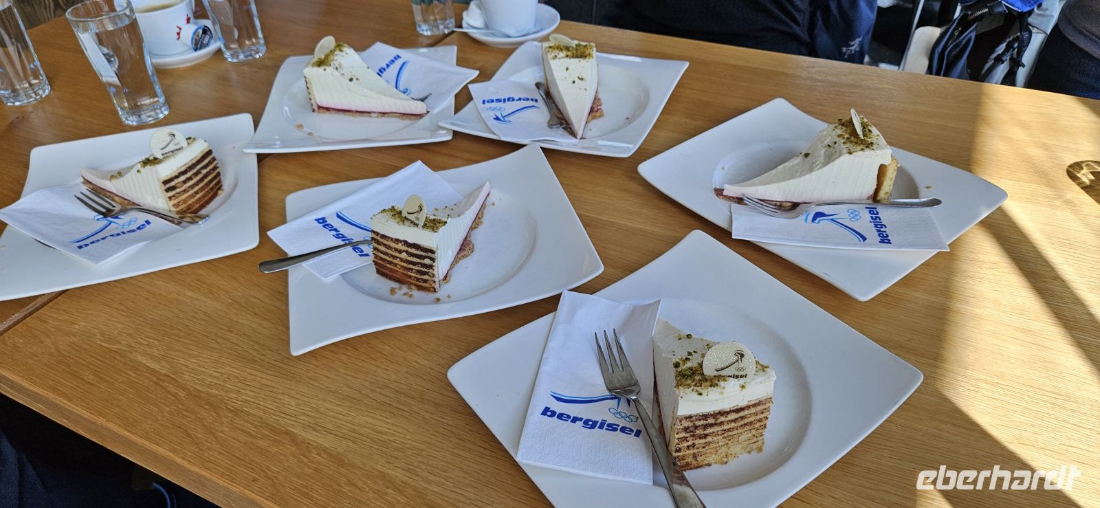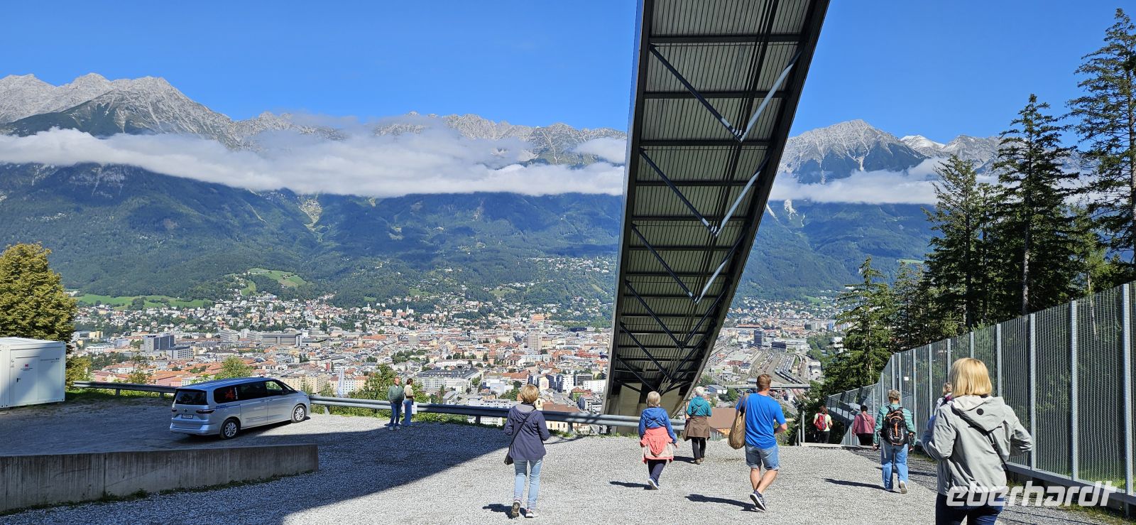 Wir konnten entspannt frühstücken, die Koffer waren gepackt und wurden im Alten Posthaus abgestellt. Mit dem Bus fuhren wir noch einmal Richtung Innsbruck, stiegen aber bereits an der Kirche Wilten aus. Von dort führte ein gemütlicher Weg hinauf zum Bergisel und dort gingen wir vorbei am Andreas Hofer Denkmal zur Bergisel Schanze. Mit unserer Stubai Super Card zahlten wir einen ermässigten Eintritt. Zunächst begaben wir uns hinauf zur Aussicht hinter dem Auslauf bei den olympischne Ringen. Dort hatte wir die gesamte Schanze im Blick und sahen, wie sich gerade ein Sportler zum Sprung fertig machte. Wir konnten seinen Sprung genau verfolgen und dann stand er plötzlich am Auslauf direkt vor uns. Zu unserer Überraschung war er auch bereit, mit unserer Gruppe ein Foto zu machen. Er, Martin Nagiller, war der Teamleiter des Jumping Teams Bergisel Schanze und hin und wieder kann man ihn selbst auch springen sehen. Mit ihm und einem weiteren deutschen Skispringer fuhren wir dann hinauf zum Schanzenturm. Wir besuchten die obere Plattform und waren begeistert von der Aussicht auf Innsbruck, die Nordkette und ins Inntal bis zum Kaisergebirge. Dann entschieden wir uns spontan, im Cafe einzukehren und die Bergisel Torte in Form der Sprungschanze zu probieren. Die Torte schmeckte sehr gut und inzwischen hatten sich auch die letzten Wolken aufgelöst und die Aussicht war noch besser. Nur schwer trennten wir uns von diesem Aussichtsplatz und fuhren mit dem Lift wieder hinunter. Auf gleichem Weg spazierten wir zurück zur Bushaltestelle und fuhren nach Fulpmes zum Hotel. Ganz pünktlich holten uns die Taxis der Firma Schöpf ab und brachten uns zum Eberhardt Bus in Schönberg. Der Bus war nur halbvoll und so konnte jeder auf der Rückfahrt eine Sitzbank für sich in Anspruch nehmen. Wir kamen gut voran auf der Heimfahrt und erreichten unsere Ausstiegsorte fast pünktlich.