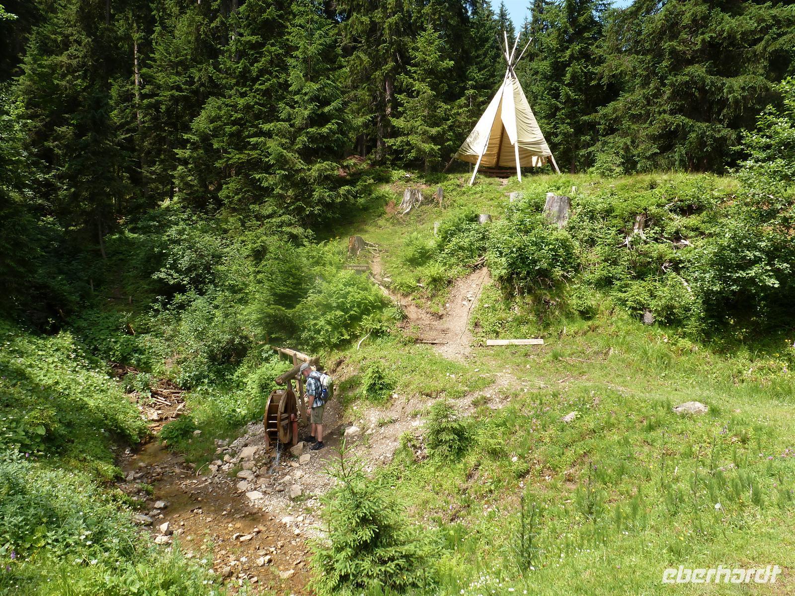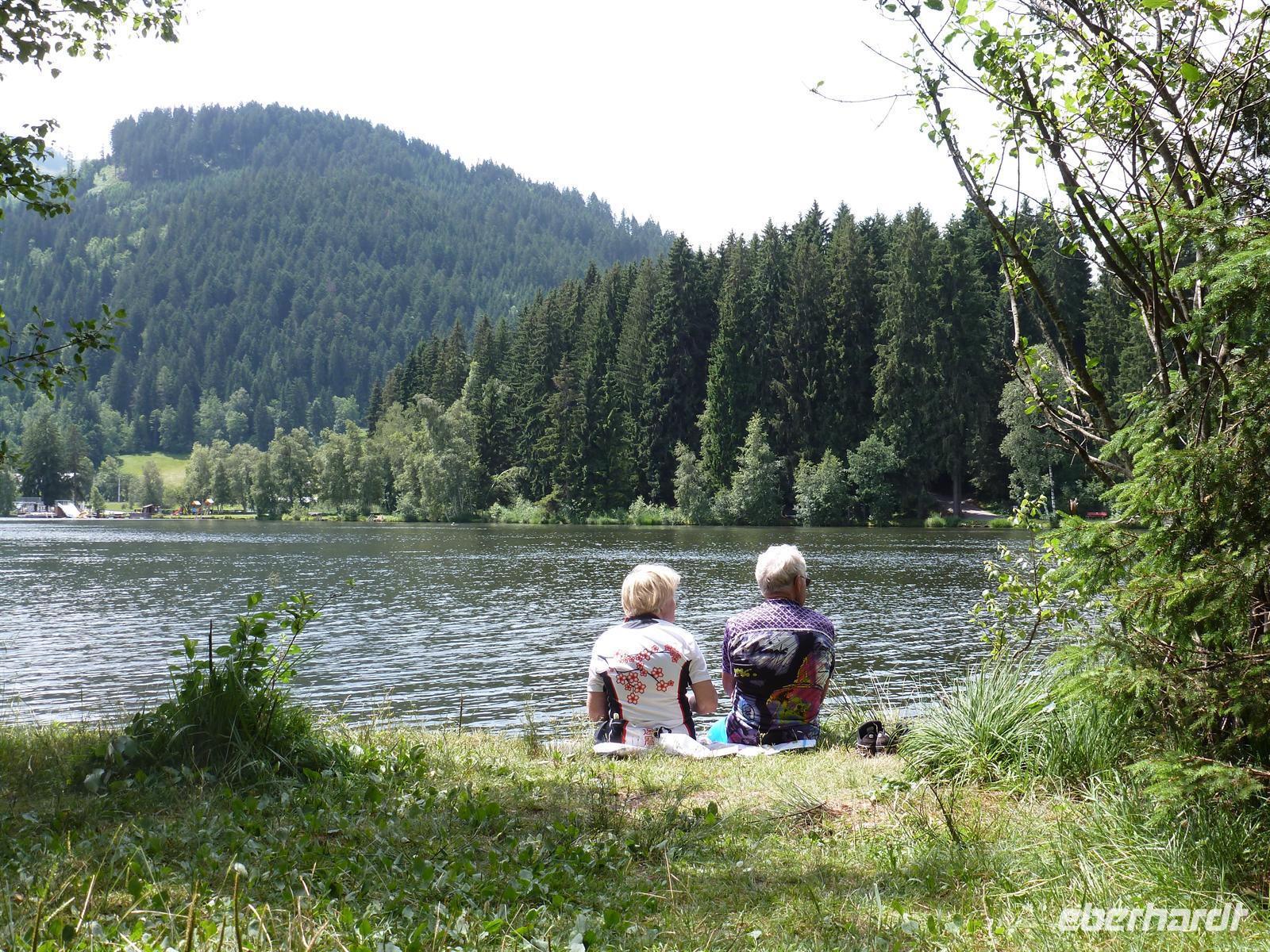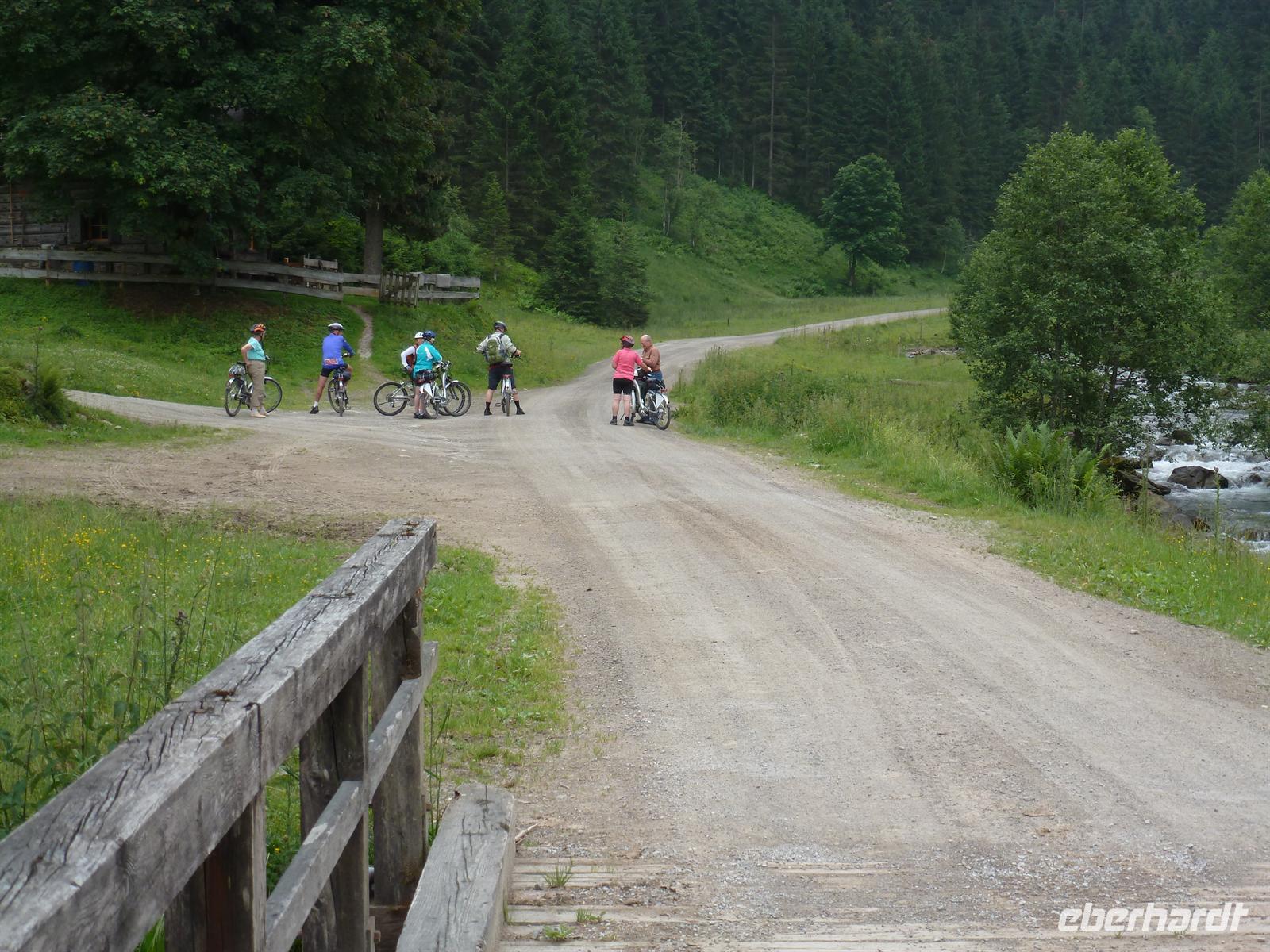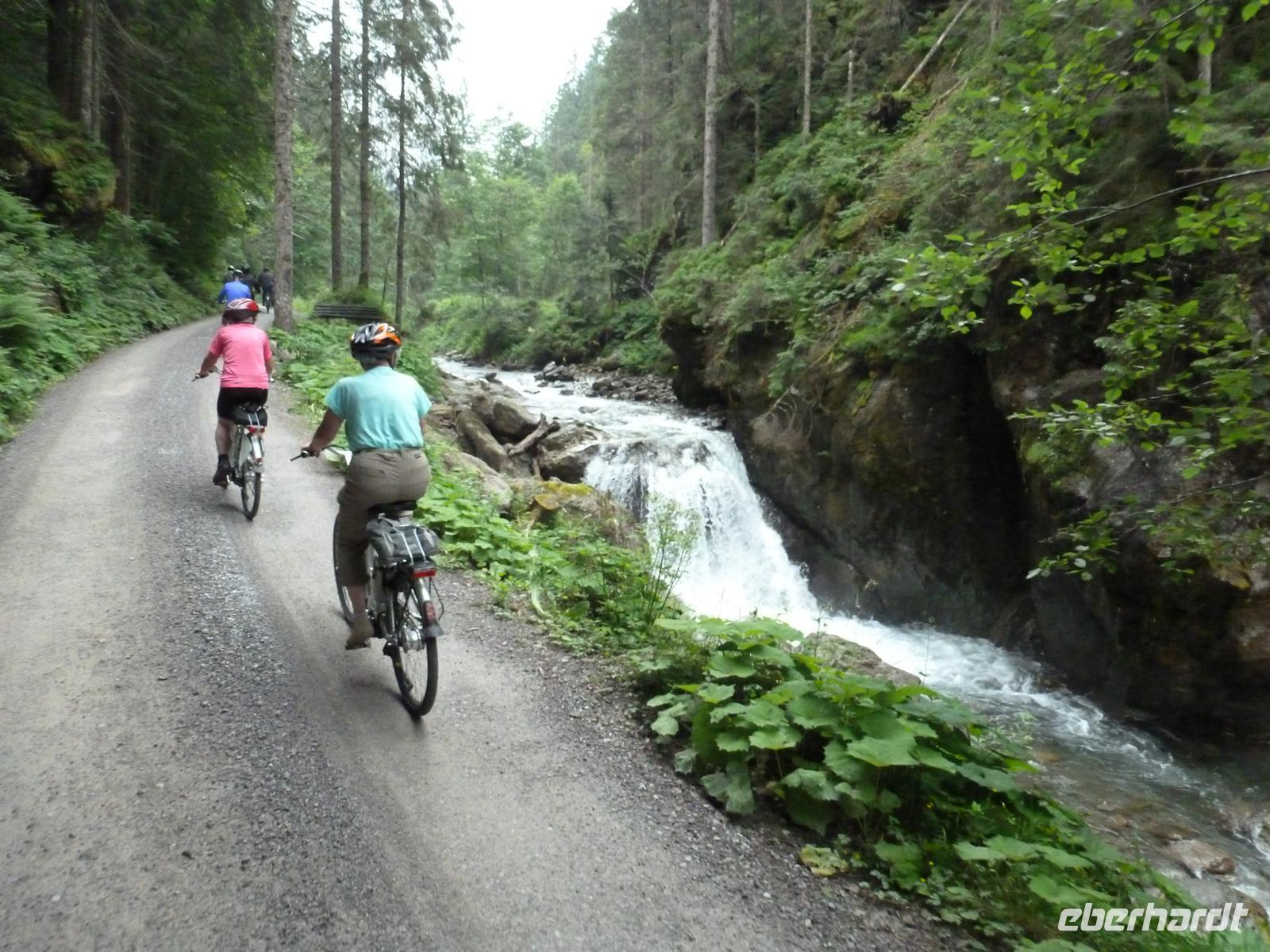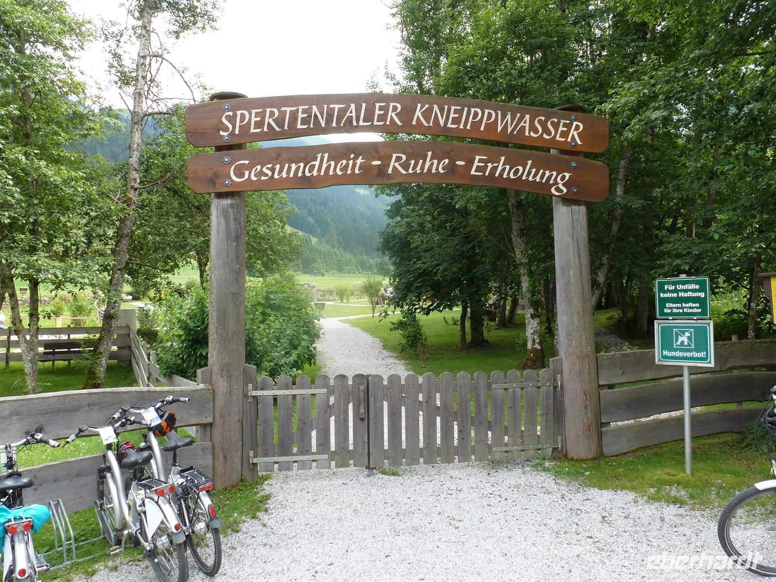 Ein weiteres Seitental des Brixentals war heute unser Ziel. Wir fuhren wieder in Richtung Kirchberg und dann bogen wir in ein romantisches Seitental nach Aschau ab. Wir fuhren immer am Fluß zwischen der Bergwelt weiter ins Tal, bis wir vorbei am Kasplatzl in Richtung Labalm kamen - dort schalteten wir unseren „High-Speed“ für das Elektrorad ein und fuhren einen wirklich steilen Berg zur Almhütte locker und einfach hoch -die E-bikes sind echt super, diesen Berg hätten wir sonst NIE geschafft, aber so war es überhaupt nicht anstrengend. Oben angekommen belohnte uns ein wahnsinnig toller Blick auf den Rettenstein und eine schöne Sitzecke der Alm mitten im Garten mit Weitblick auf die Berge! Nach dieser Rast fuhren wir immer bergab durch dieses wunderschöne Tal zur Kneipanlage Aschau. Das war ein Spaß, einfach draußen mitten in der Natur gab es diese sehr gepflegte Kneipanlage - wir wateten durchs kalte Wasser, genossen unser Picknick und waren glückglich! Dann ging es weiter durch Kirchberg zurück nach Westendorf, wo wir ach 42km Radtour am Nachmittag den lokalen Handwerkermarkt zu Fuß besuchten und das Dorfleben erkundeten. Schließlich rundete ein tolles Abendessen im Hotel den Tag ab!
