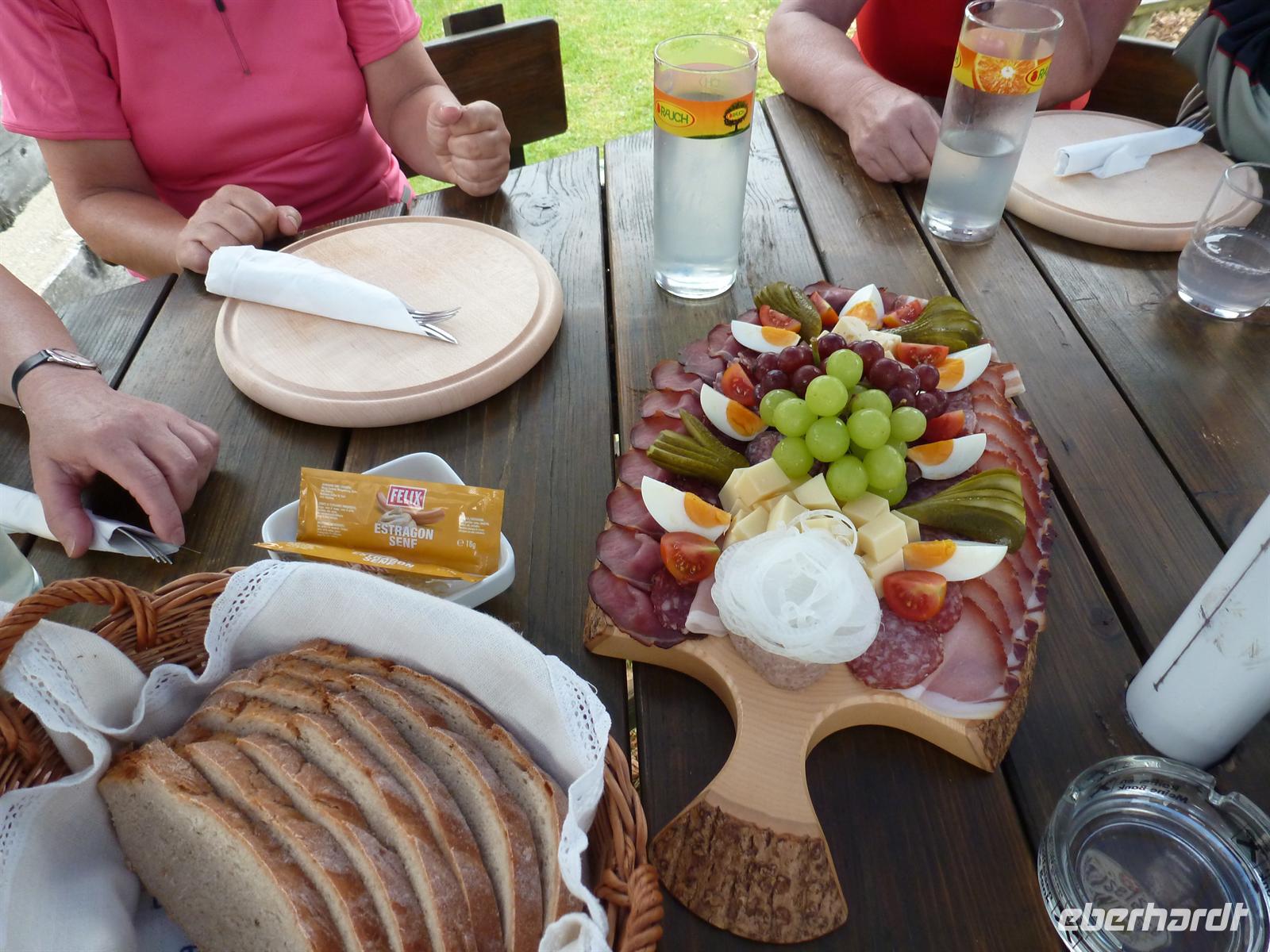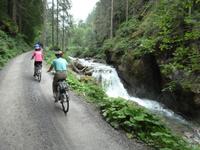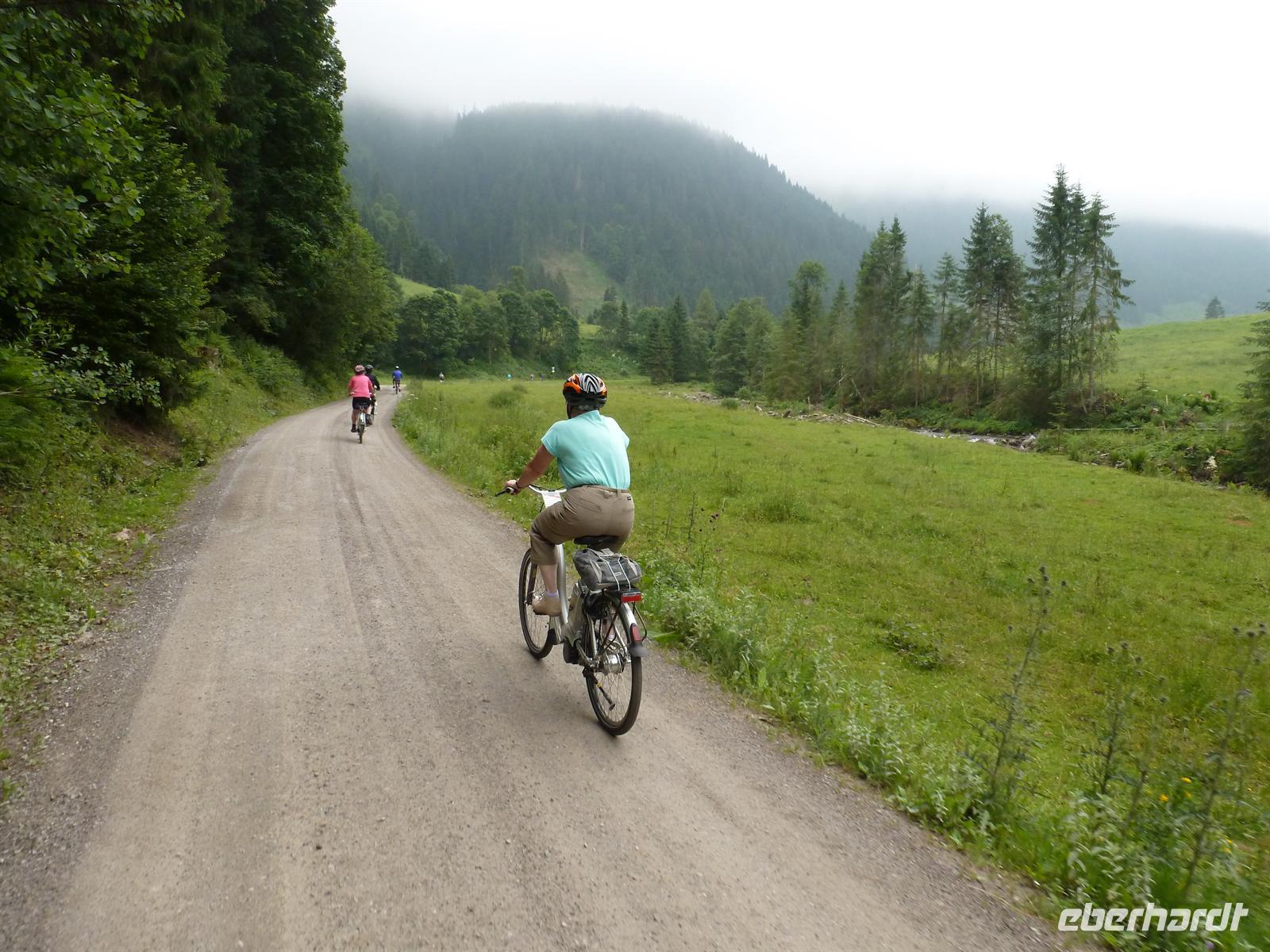 Nach dem leckeren Frühstück machten wir uns wieder auf unsere Sattel und fuhren heute in die andere Richtung - erst über kleine hübsche Straßen an Westendorf vorbei in ein wirklich romantisches Tal. Das Bächlein Windau fließt umgeben von Almhängen durch dieses Tal - und der Radweg führte uns immer weiter rein in diese herrliche Landschaft. Unser erster Stopp war die Käsalm Straubing. Der Anstieg zur Alm war ziemlich steil, darum sind einige Gäste mit Rosi hochgeradelt und einige mit mir hochgewandert - oben angekommen erwartete uns eine traumhafte Alm mit einer Hütte und einer leckeren Jausenplatte - hausgemachter Käse, Speck und Wurst - dazu ein leckeres Bier oder Hollunderwasser - besser konnte es uns nicht gehen inmitten dieser tollen Bergwelt! Aber dann mussten wir auch weiter ins Tal hinein - es ging immer leicht bergauf, aber mit unseren E-bikes kein Problem. Wir haben sogar die sportlichen Mountainbiker überholt, und dann ohne viel Anstrengung! Schließlich sind wir in der Gamskogelhütte angekommen! Dort wurden wir mit einem typisch tiroler Kaiserschmarren begrüßt - hmmm war das lecker! Nun kam doch ein bisschen Regen, aber wir hatten ja gute Kleidung! Und so fuhren wieder aus dem Tal hinaus - nun immer bergab durch diese traumhafte Natur…schließlich sind wir am Nachmittag nach circa 35km wieder in unserem Gasthof angekommen und alle haben den Tag gemütlich ausklingen lassen!