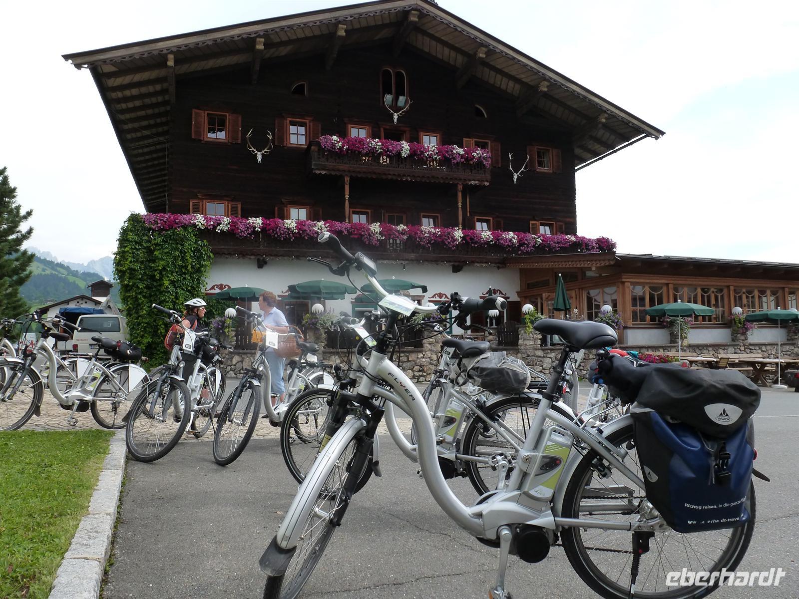 Unsere Eberhardt Radgäste sind heute mit dem Eberhardt Tirolbus ins wunderschöne Brixental angereist. Am Nachmittag haben Sie den 3* Gasthof Aschenwald erreicht und wurden dort von mir begrüßt. Nach dieser Busfahrt waren alle glücklich, gleich Ihre Zimmer zu beziehen, bevor wir uns alle vor dem Abendessen getroffen haben, um unsere Radl für die nächsten Tage in Augenschein zu nehmen. Max, der Tourismusdirektor der Kitzbüheler Alpen, hat uns die „E-bikes“ oder „Pedelecs“ - so werden Elektroräder auch genannt, vorgestellt und alles genau erklärt. Nach einer kleinen Proberunde haben alle diese tollen Räder mit Rückenwind schon mal getestet, bevor wir morgen unsere erste Tour starten wollten. Schließlich hat uns ein lecker Abendessen erwartet und am Abend haben einige das EM-Finalspiel in der Hotelbar gemeinsam geschaut.