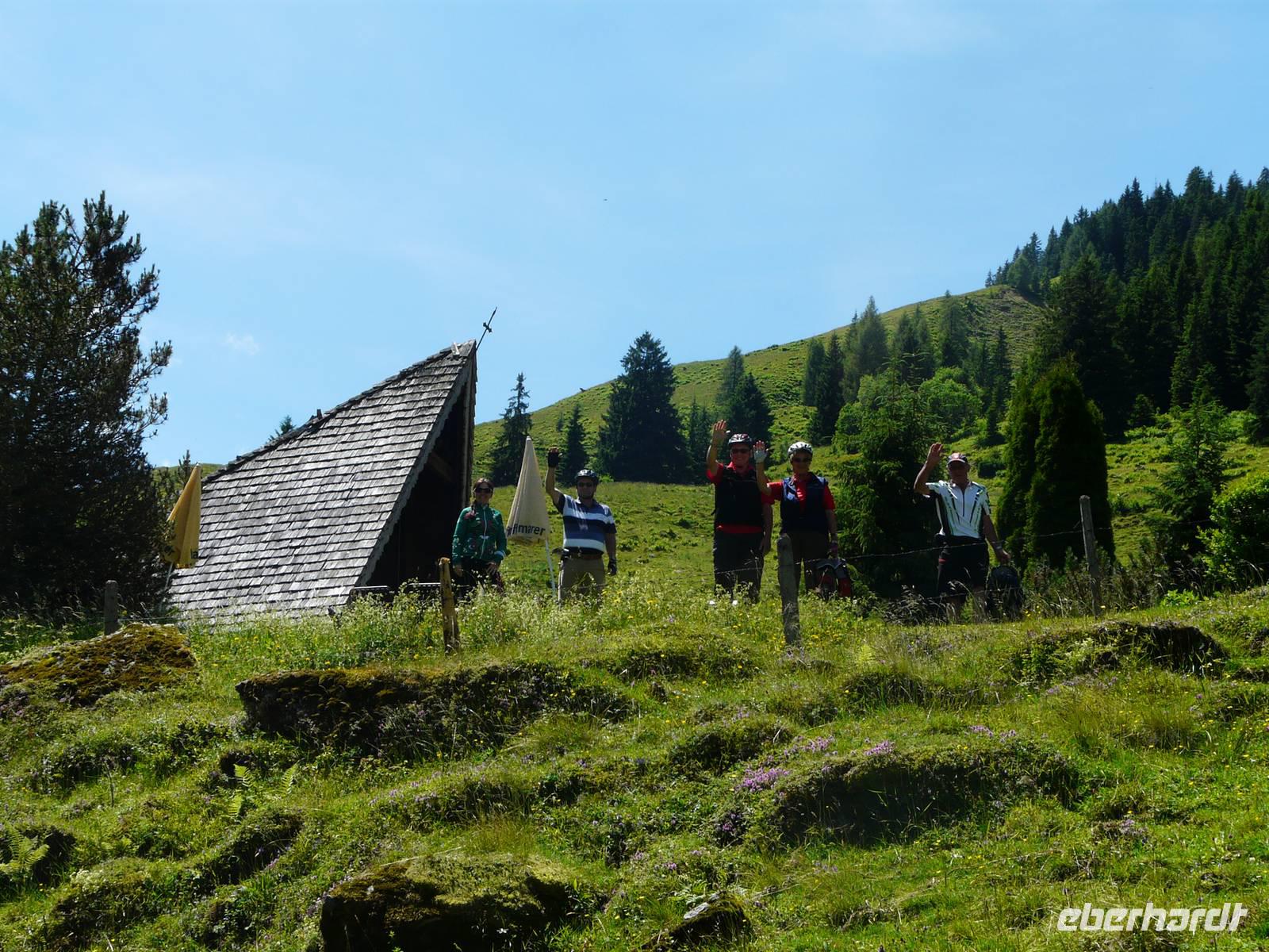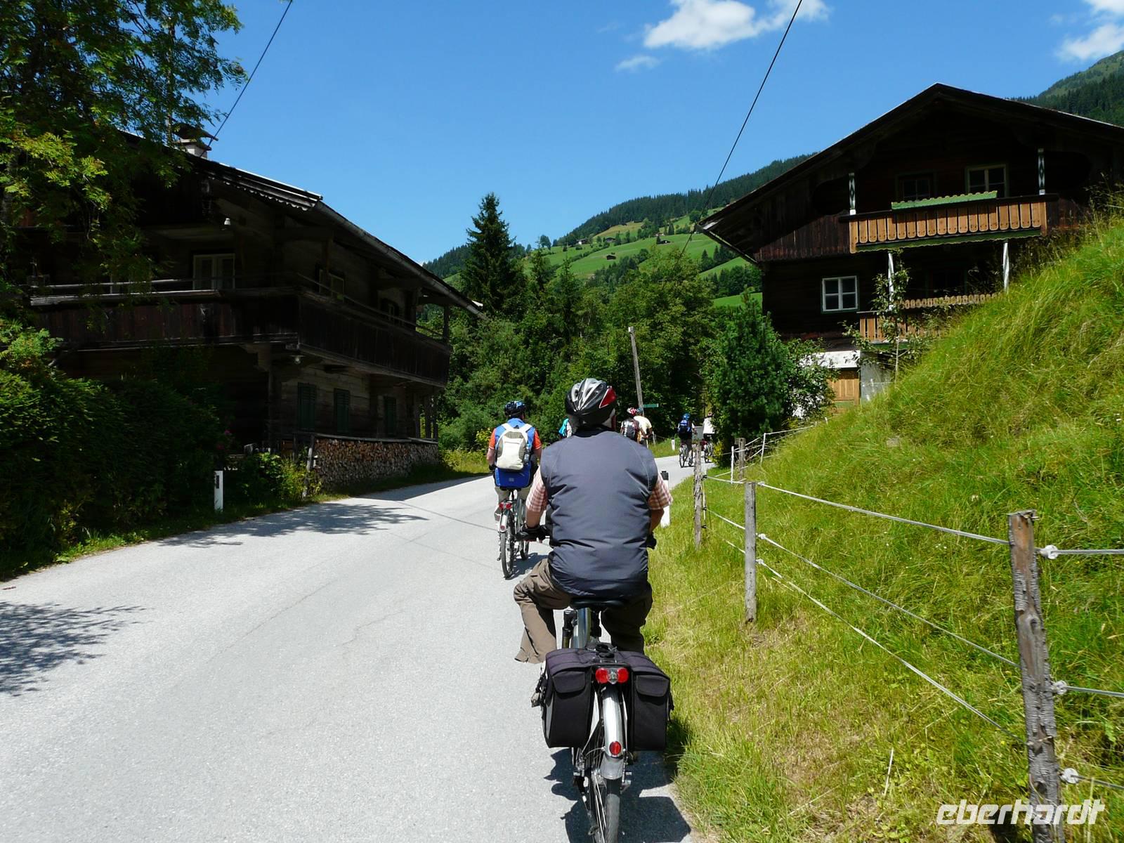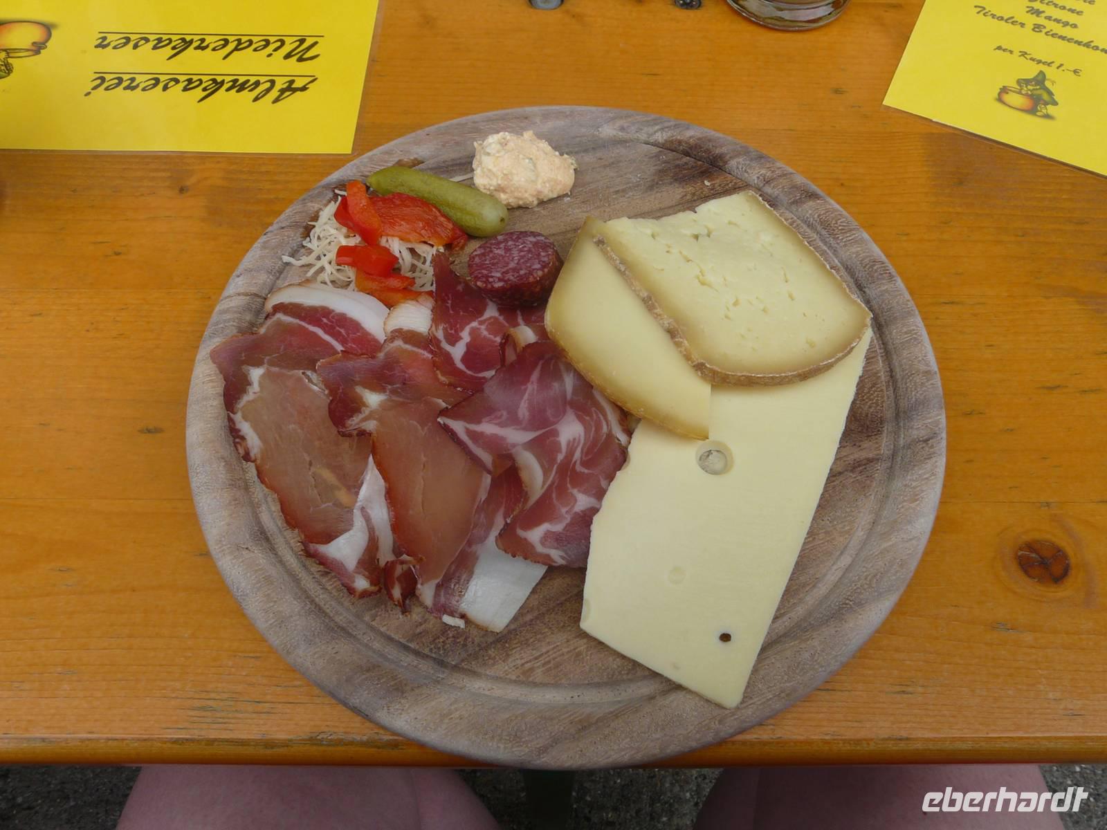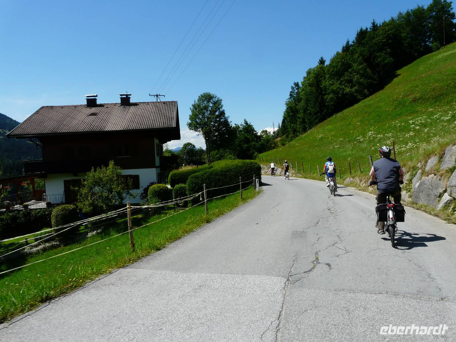 Nun steht die erste „richtige" Etappe an. Nachdem wir uns gestern gemütlich eingeradelt haben, geht es heute schon etwas mehr zur Sache und dementsprechend auch zeitiger los. Unser Weg führt wieder zuerst durch die Unterführung und dann den steilen Berg hin zum Radweg hinauf. Hinter Westendorf biegen wir auf einen ruhigen Waldweg ein und radeln eine ganze Zeit lang eher unbemerkt bergan. Der Weg hinunter zum Lendwirt ist dann ein guter Bremstest, schließlich geht es ordentlich bergab! Nun folgen wir immer weiter der Windauer Ache, natürlich entgegen der Fließrichtung, und biegen an einer Weggabelung zu unserem ersten kleinen Tagesziel, der Gamskogelhütte, ab. Mittlerweile hat sich auch das Landschaftsbild gewechselt, den Wald und die Windauer Ache haben wir hinter uns gelassen und durchfahren nun die saftig grünen Almwiesen bergan - mit „HIGH" absolut kein Problem. Oben angekommen genehmigen wir uns bei strahlendem Sonnenschein eine kleine Erfrischung, frische Buttermilch, eine Holunderschorle oder einfach ein kühles Bier. Wer mag, kann an der Gamskogelhütte nun auch schon seinen Akku wechseln, schließlich gehört die Hütte zu einem großen Netz von „Ladestationen", welche sich immer häufiger in Tirol finden lassen. Den langen Weg hinab braucht allerdings niemand auch nur ein bisschen Strom, es geht gemütlich bergab und wir können die Räder laufen lassen. Doch wie es immer so ist in den Bergen - der nächste Anstieg kommt bestimmt. Und was für einer - bei der Auffahrt zur Käsealm Straubing ist wohl jeder über die Unterstützung durch den Akku froh. Selbst mit „HIGH", der größtmöglichen Unterstützung, kommen wir nur langsam nach oben. Aber - und auch das ist das Schöne in den Bergen - oben angekommen wartet auch immer eine kleine Belohnung. Und so ist es natürlich auch für uns. Die Käsealm ist ganz romantisch eingebettet in die Bergwelt. Hinter den grünen Almwiesen türmen sich die mächtigen Berge auf und das sommerliche Wetter lädt einfach zum Verweilen ein. Als wir uns von der kleinen Anstrengung erholen, wird Großes aufgetischt. Wer heute eine kleine feine Brettljause erwartet hat, wird eines Besseren belehrt. Auf unsere Tische wird jeweils ein großes Brettl gestellt, mit allem, was das Herz begehrt. Es gibt mehrere Käsesorten, Speck, Kaminwurzen garniert mit Weintrauben, Tomaten, Zwiebeln und Gewürzgurken. Kurz gesagt ein fantastischer Anblick. Und so dauert es natürlich eine ganze Weile bis wir überhaupt dran denken weiterzufahren - das Wetter ist zu schön, das Essen zu gut und erst der Wein... . Aber natürlich müssen wir auch wieder zurück und so machen wir uns (wenn auch nun etwas schwerfällig) auf den Heimweg. In Westendorf angekommen verabschieden wir uns von Sabine, schlendern noch etwas durch den Ort. Einige von uns trinken noch einen Kaffee beim örtlichen Konditor. Spätestens zum Abendessen im Aschenwald treffen wir wieder alle zusammen und lassen uns erneut bestens umsorgen.