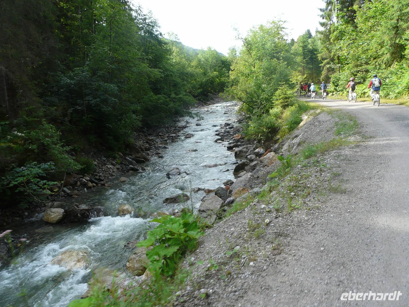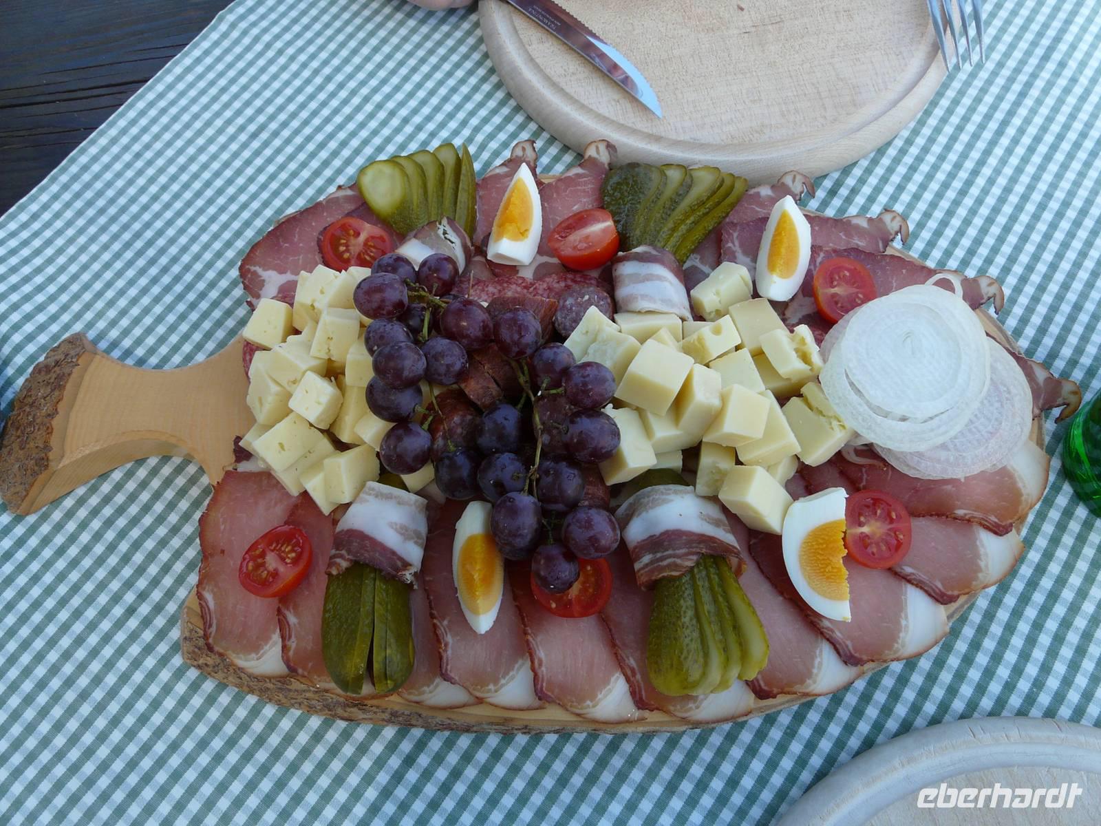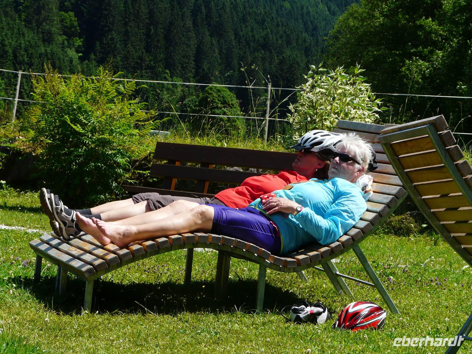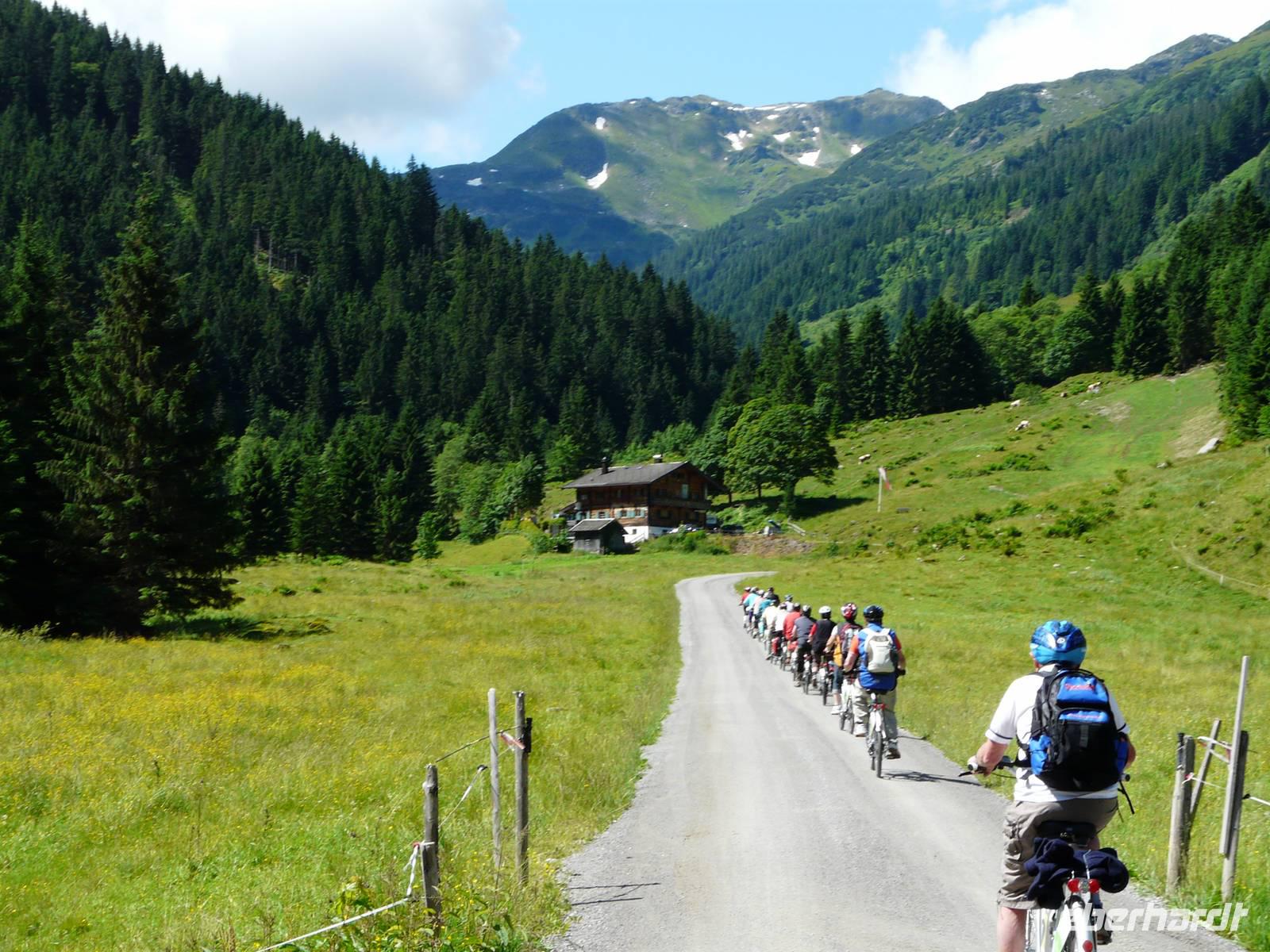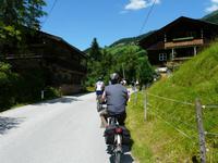 Nun steht die erste „richtige" Etappe an. Nachdem wir uns gestern gemütlich eingeradelt haben, geht es heute schon etwas mehr zur Sache und dementsprechend auch zeitiger los. Unser Weg führt wieder zuerst durch die Unterführung und dann den steilen Berg hin zum Radweg hinauf. Hinter Westendorf biegen wir auf einen ruhigen Waldweg ein und radeln eine ganze Zeit lang eher unbemerkt bergan. Der Weg hinunter zum Lendwirt ist dann ein guter Bremstest, schließlich geht es ordentlich bergab! Nun folgen wir immer weiter der Windauer Ache, natürlich entgegen der Fließrichtung, und biegen an einer Weggabelung zu unserem ersten kleinen Tagesziel, der Gamskogelhütte, ab. Mittlerweile hat sich auch das Landschaftsbild gewechselt, den Wald und die Windauer Ache haben wir hinter uns gelassen und durchfahren nun die saftig grünen Almwiesen bergan - mit „HIGH" absolut kein Problem. Oben angekommen genehmigen wir uns bei strahlendem Sonnenschein eine kleine Erfrischung, frische Buttermilch, eine Holunderschorle oder einfach ein kühles Bier. Wer mag, kann an der Gamskogelhütte nun auch schon seinen Akku wechseln, schließlich gehört die Hütte zu einem großen Netz von „Ladestationen", welche sich immer häufiger in Tirol finden lassen. Den langen Weg hinab braucht allerdings niemand auch nur ein bisschen Strom, es geht gemütlich bergab und wir können die Räder laufen lassen. Doch wie es immer so ist in den Bergen - der nächste Anstieg kommt bestimmt. Und was für einer - bei der Auffahrt zur Käsealm Straubing ist wohl jeder über die Unterstützung durch den Akku froh. Selbst mit „HIGH", der größtmöglichen Unterstützung, kommen wir nur langsam nach oben. Aber - und auch das ist das Schöne in den Bergen - oben angekommen wartet auch immer eine kleine Belohnung. Und so ist es natürlich auch für uns. Die Käsealm ist ganz romantisch eingebettet in die Bergwelt. Hinter den grünen Almwiesen türmen sich die mächtigen Berge auf und das sommerliche Wetter lädt einfach zum Verweilen ein. Als wir uns von der kleinen Anstrengung erholen, wird Großes aufgetischt. Wer heute eine kleine feine Brettljause erwartet hat, wird eines Besseren belehrt. Auf unsere Tische wird jeweils ein großes Brettl gestellt, mit allem, was das Herz begehrt. Es gibt mehrere Käsesorten, Speck, Kaminwurzen garniert mit Weintrauben, Tomaten, Zwiebeln und Gewürzgurken. Kurz gesagt ein fantastischer Anblick. Und so dauert es natürlich eine ganze Weile bis wir überhaupt dran denken weiterzufahren - das Wetter ist zu schön, das Essen zu gut und erst der Wein... . Aber natürlich müssen wir auch wieder zurück und so machen wir uns (wenn auch nun etwas schwerfällig) auf den Heimweg. In Westendorf angekommen verabschieden wir uns von Sabine, schlendern noch etwas durch den Ort. Einige von uns trinken noch einen Kaffee beim örtlichen Konditor. Spätestens zum Abendessen im Aschenwald treffen wir wieder alle zusammen und lassen uns erneut bestens umsorgen.