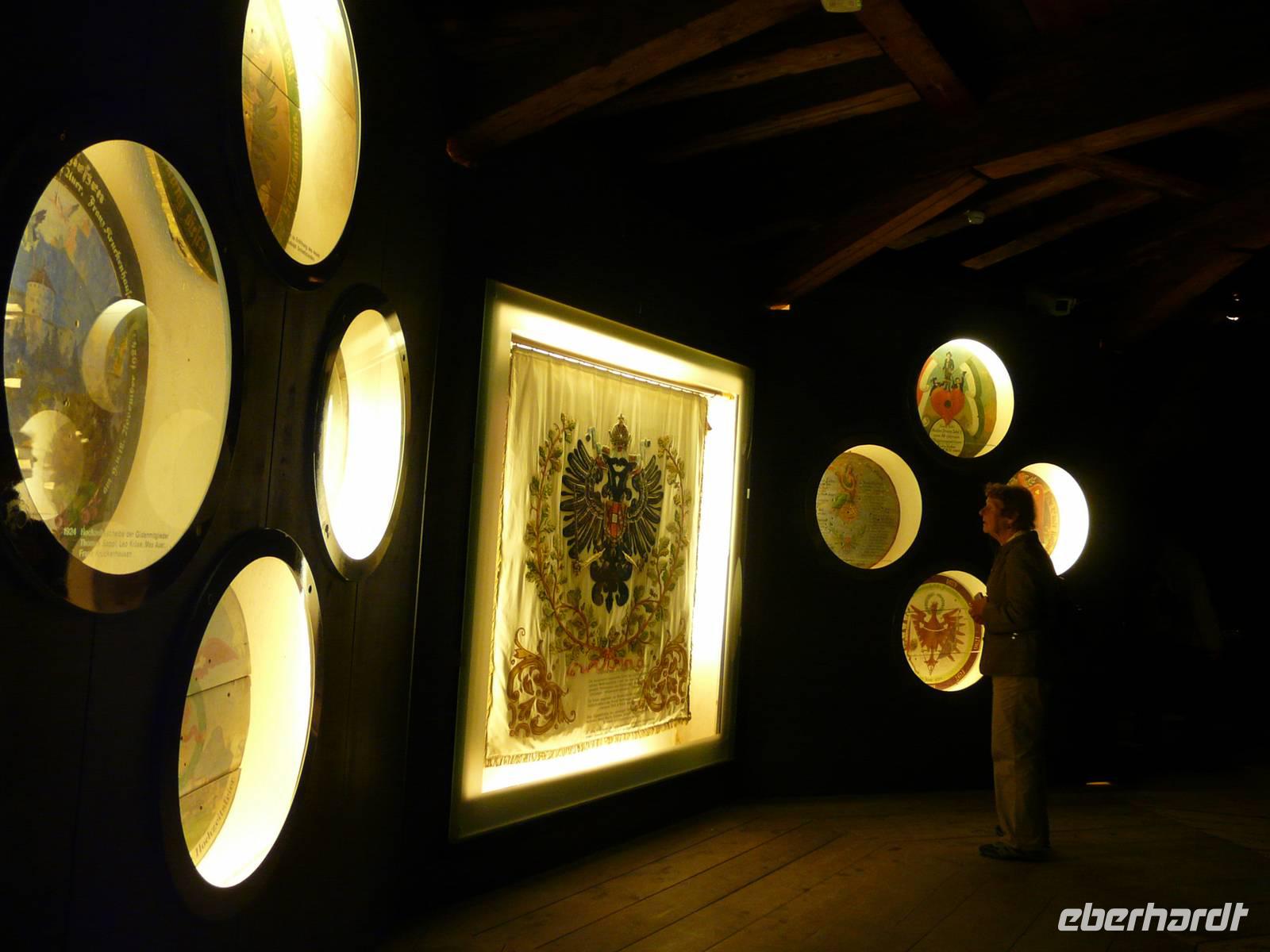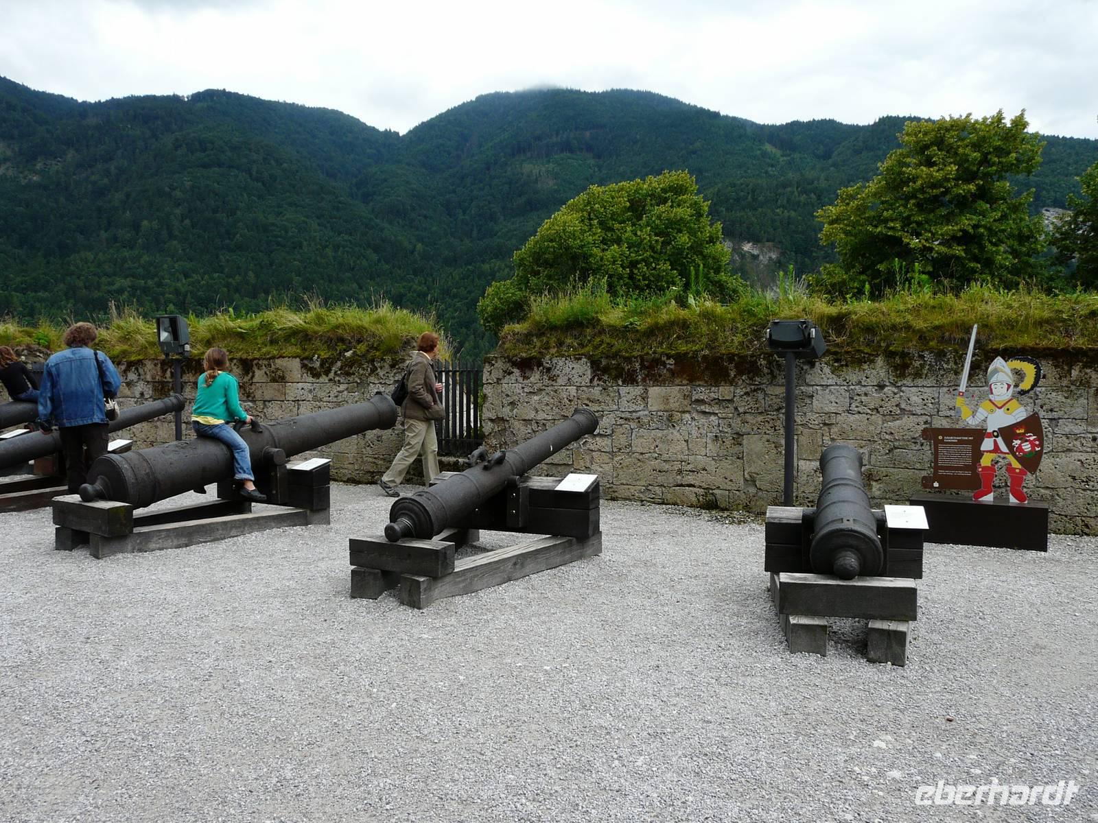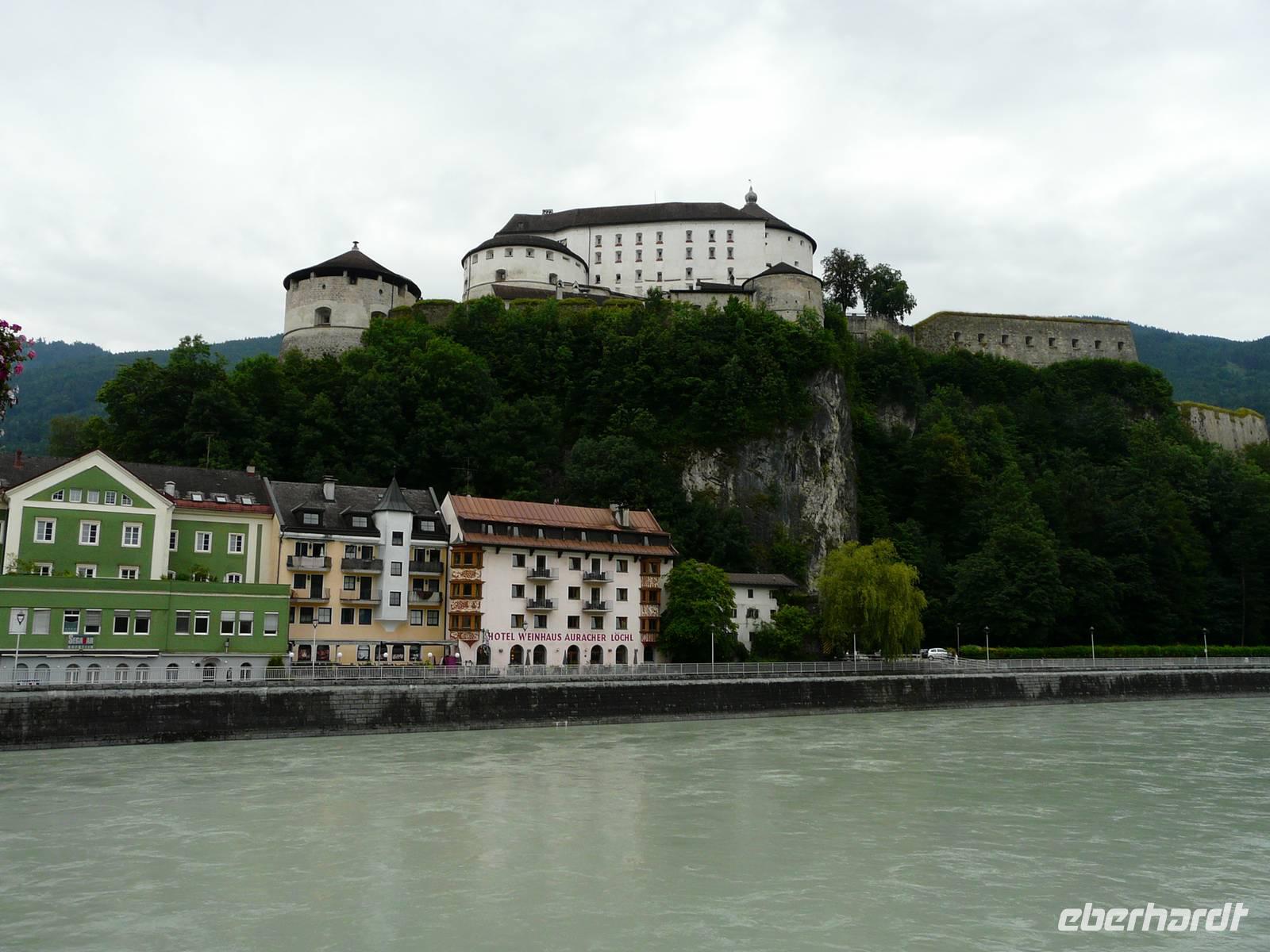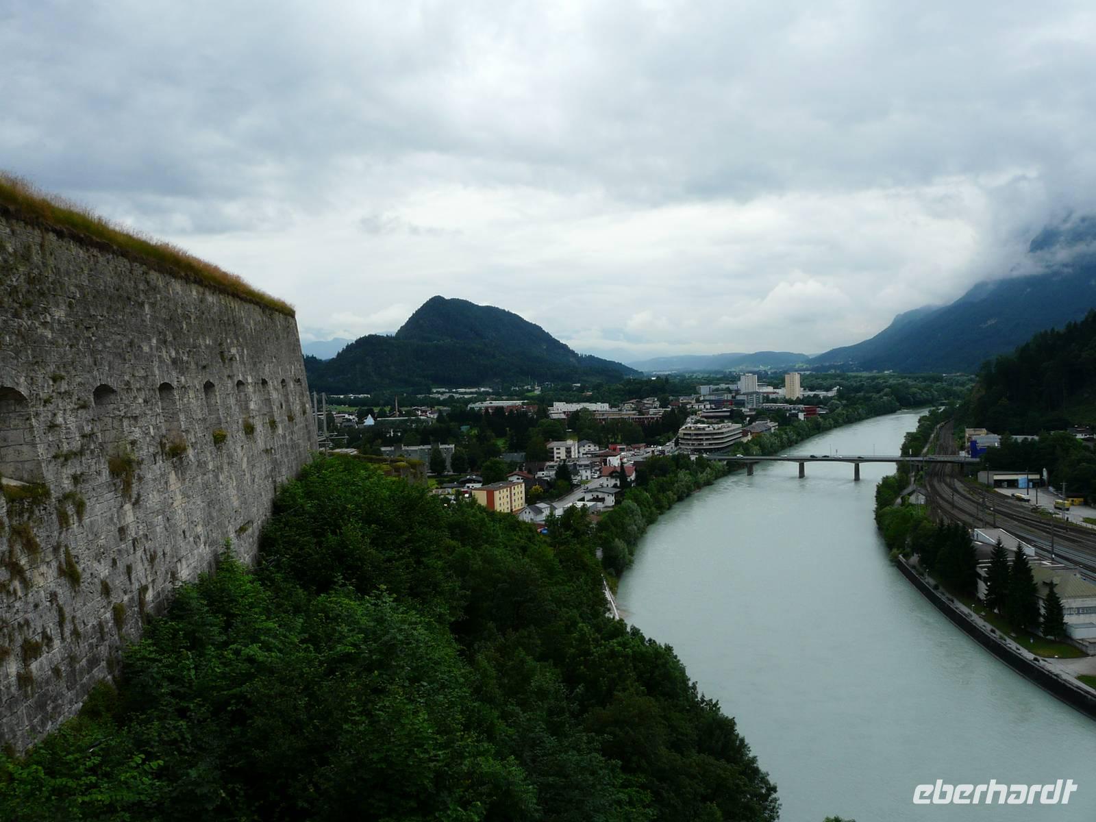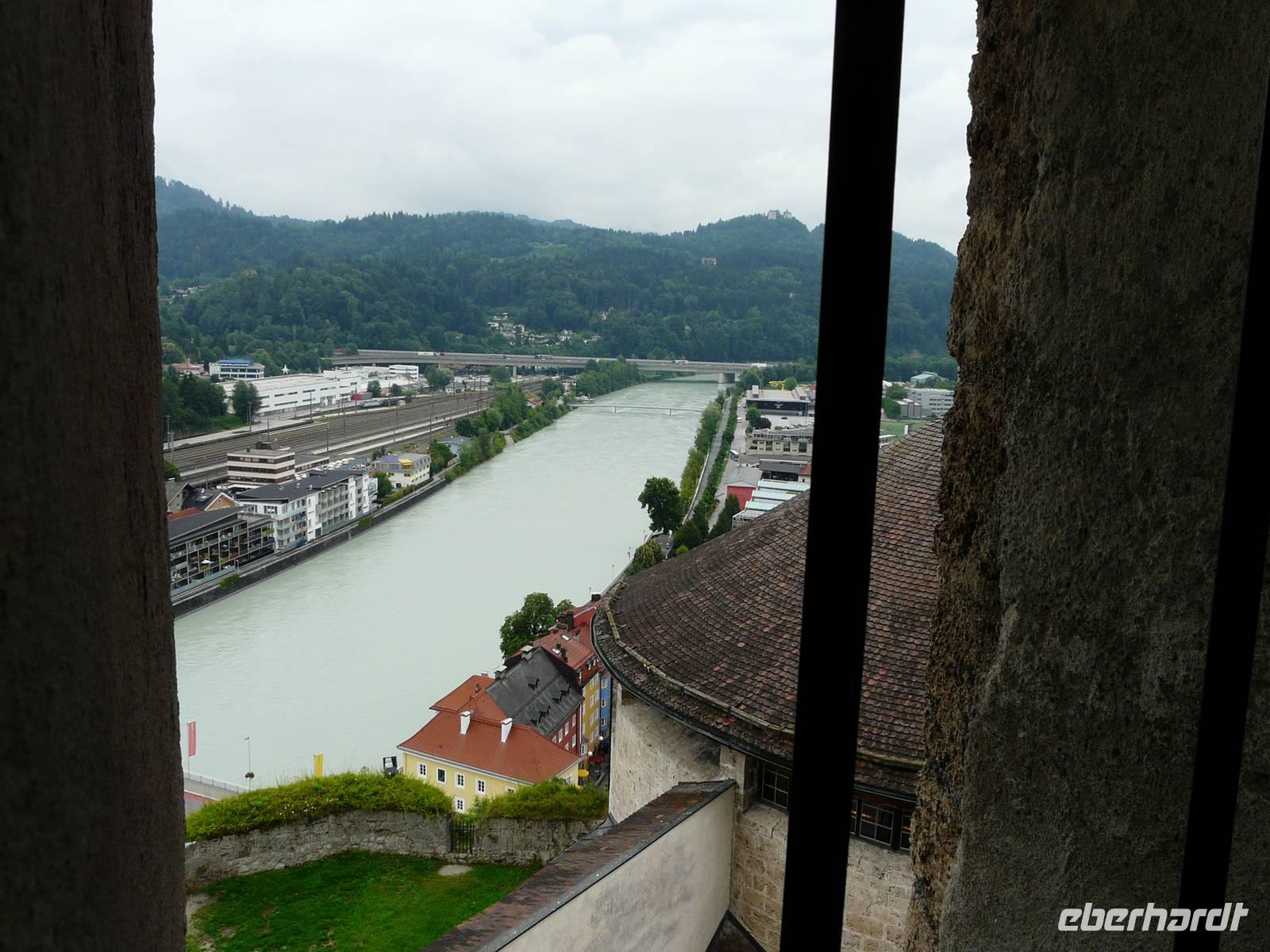 Das Wetter ist wie erwartet - es regnet. Glücklicherweise haben wir uns mehrere Alternativen offen gelassen und so entscheiden wir uns am Morgen für einen Ausflug nach Kufstein. Nachdem wir die Tücken das Ticketautomaten der österreichischen Bahn durchschaut haben, kaufen wir für die ganze Gruppe ein Ticket und fahren mit dem Zug über Wörgl nach Kufstein. Der Bahnhof ist nah an der bekannten Altstadt und so müssen wir nur den Inn überqueren und stehen alsbald auf dem Marktplatz unterhalb der Festung. Ein kurzer Besuch bei der Tourist-Info beschert uns allen erstmal einen Stadtplan. Und dann geht es natürlich zur Festung. Mittlerweile regnet es stärker und wir suchen im Innenhof ein trockenes Plätzchen ehe es mit dem Lift hinauf auf die Festung geht.