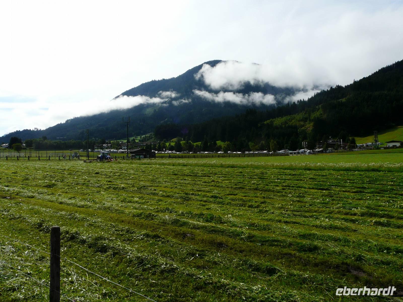 Der erste Tag startet zeitig. Bereits um 6 Uhr fährt unser Bus am Dresdener Flughafen gen Süden. Über Nürnberg und München, mit einem kurzen Abstecher Richtung Chiemsee, fahren wir nach Tirol. Während der gesamten Fahrt regnet es in Strömen und wir ahnen nichts Gutes. Doch ein echter Radfahrer lässt sich natürlich durch ein bisschen Wasser nicht abschrecken! Angekommen in Westendorf werden wir herzlich von Rosi im Gasthof „Aschenwald" begrüßt. Wenig später stehen wir in der großen Garage des Gasthofes und bestaunen anfangs noch etwas skeptisch unsere Fahrgeräte der nächsten Tage. Max, Mitarbeiter im Tourismusverband und praktischerweise auch Rosis bessere Hälfte, zeigt uns, wie man die E-Bikes bedient - Gangschaltung, Bremsen und natürlich die Funktionsweise der elektrischen Unterstützung. Er hilft uns, die Räder individuell einzustellen und so kann jeder auf dem Hof eine kurze Runde durch die Regen drehen und sich erstmals an das neue Gefährt gewöhnen. Die wichtigste Anweisung des Abends: Nicht vergessen, die Akkus über Nacht zu laden! Im Anschluss finden wir uns im Gastraum ein, wo ein typisches Tiroler Menü auf uns wartet. In gemütlicher Runde lassen wir den ersten Abend unserer Reise ausklingen.
