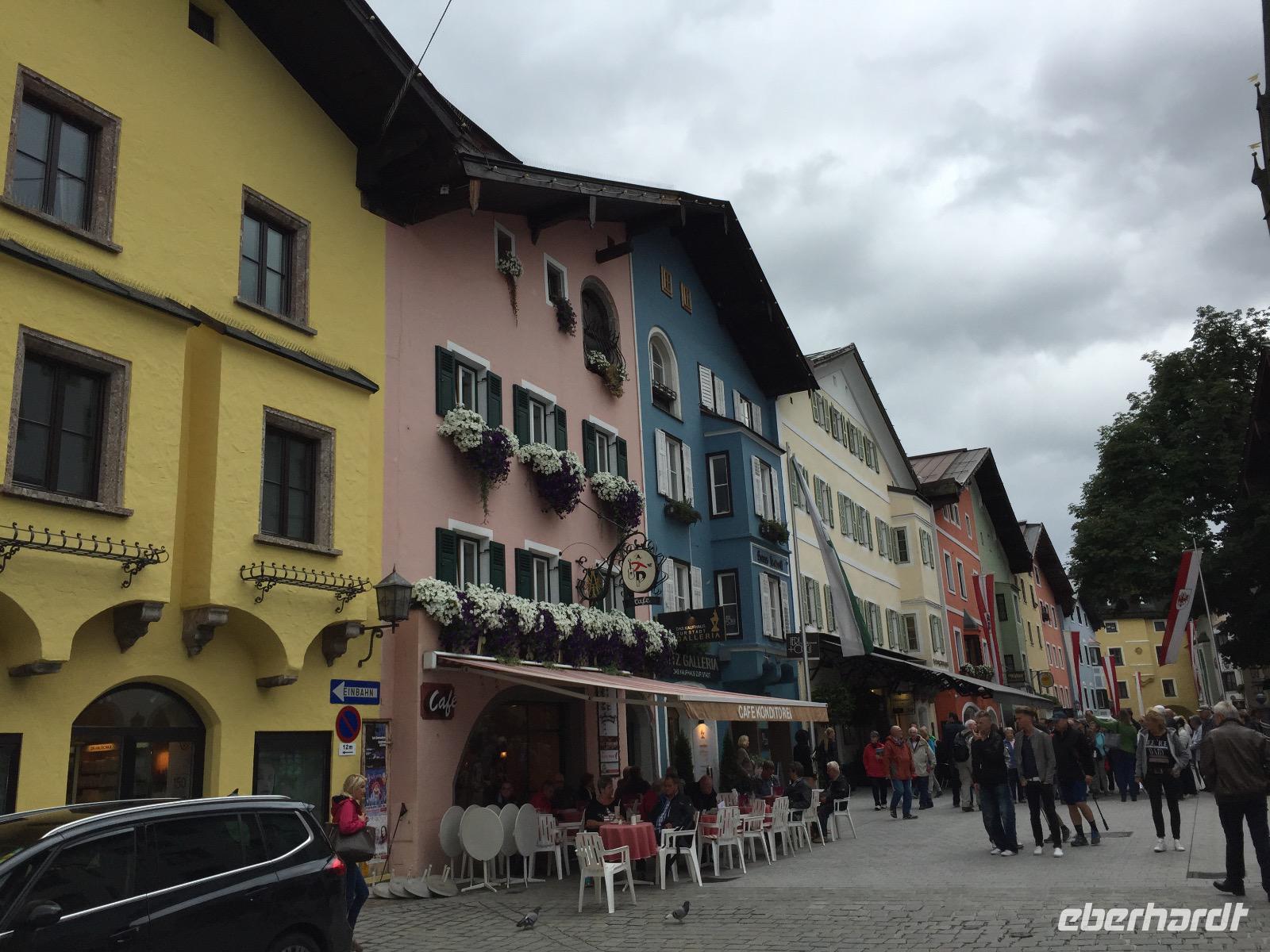 Heute lernen wir unseren örtlichen Radl-Guide Andreas Maier aus Westendorf kennen. Er hat für den Beginn eine einfache Strecke ohne starke Steigungen, die sich gut zum Einüben eignet, ausgesucht. Auf dem Radweg Brixental geht es über Brixen im Thale und Kirchberg nach Kitzbühel. Die kleine, aber sehr bekannte Alpenstadt liegt inmitten von Bergen und bietet zahllose gute Pisten, unter anderem im Südwesten die Berggruppe Hahnenkamm-Steinbergkogel, wo jedes Jahr das Hahnenkamm Rennen, das sportliche Großereignis der Region stattfindet. In Kitzbühel auf dem Podest zu stehen, ist einer der größten Erfolge, die ein Alpinskifahrer erreichen kann. Jetzt im Sommer fällt es schwer, sich vorzustellen, wie auf diesem relativ engen Raum zwischen Gebäuden, Wald und Steilhängen die Infrastruktur der Ziellinie mit tausenden von Zuschauern Platz findet. Andreas führt uns durch das Ortszentrum und wir erfahren die wichtigsten geschichtlichen Ereignisse, unter anderem die Geschichte von den Kitzbüheler Freiheitskämpfern, welchen eine Bronzeplastik unterhalb der Pfarrkirche „Zum heiligen Andreas" gewidmet ist. Wir besichtigen die barocken Kirchen, deren Türme das Ortsbild prägen und radeln nach einer Stärkung aus unseren Brotdosen wieder in Richtung Westendorf.