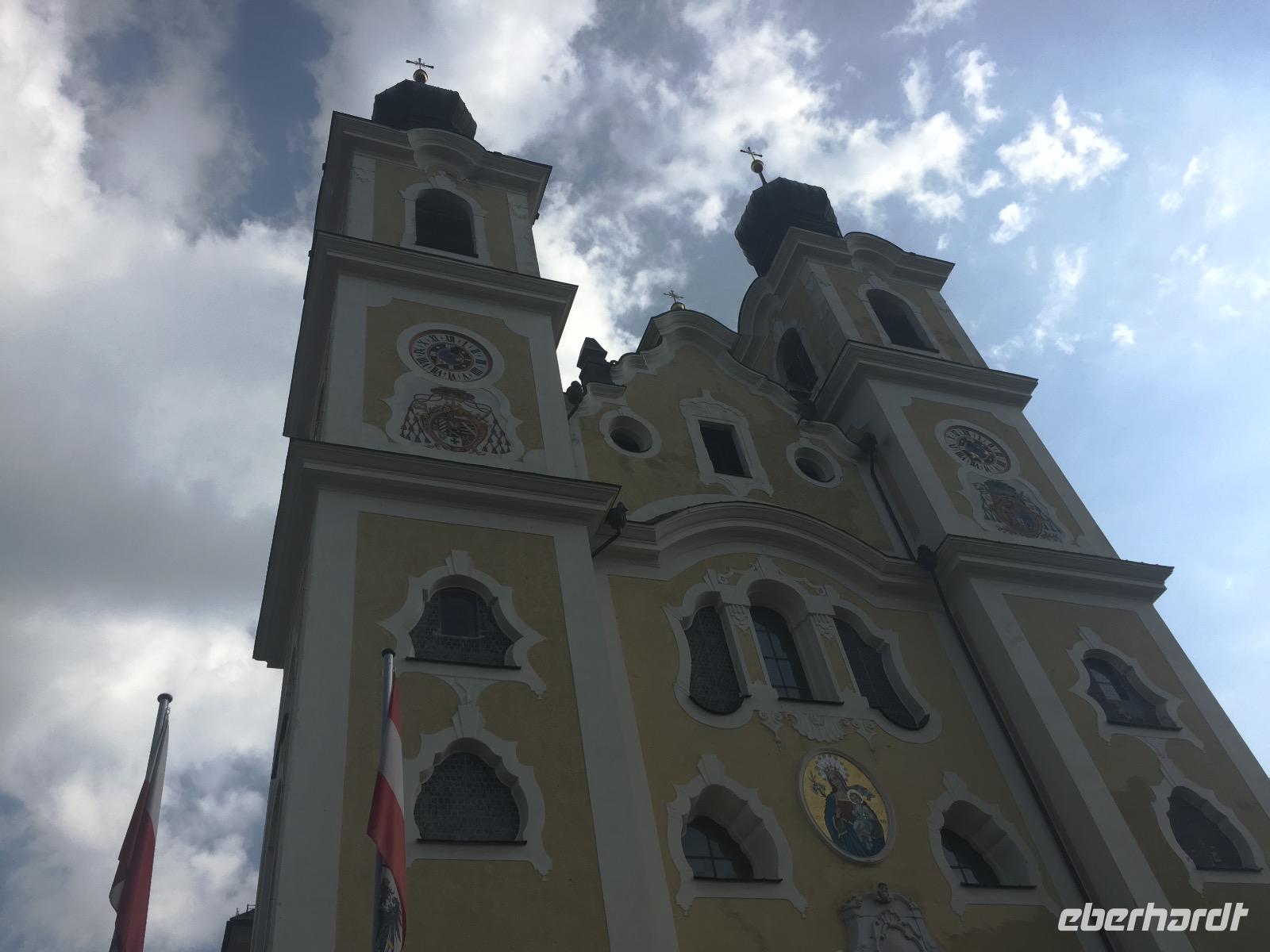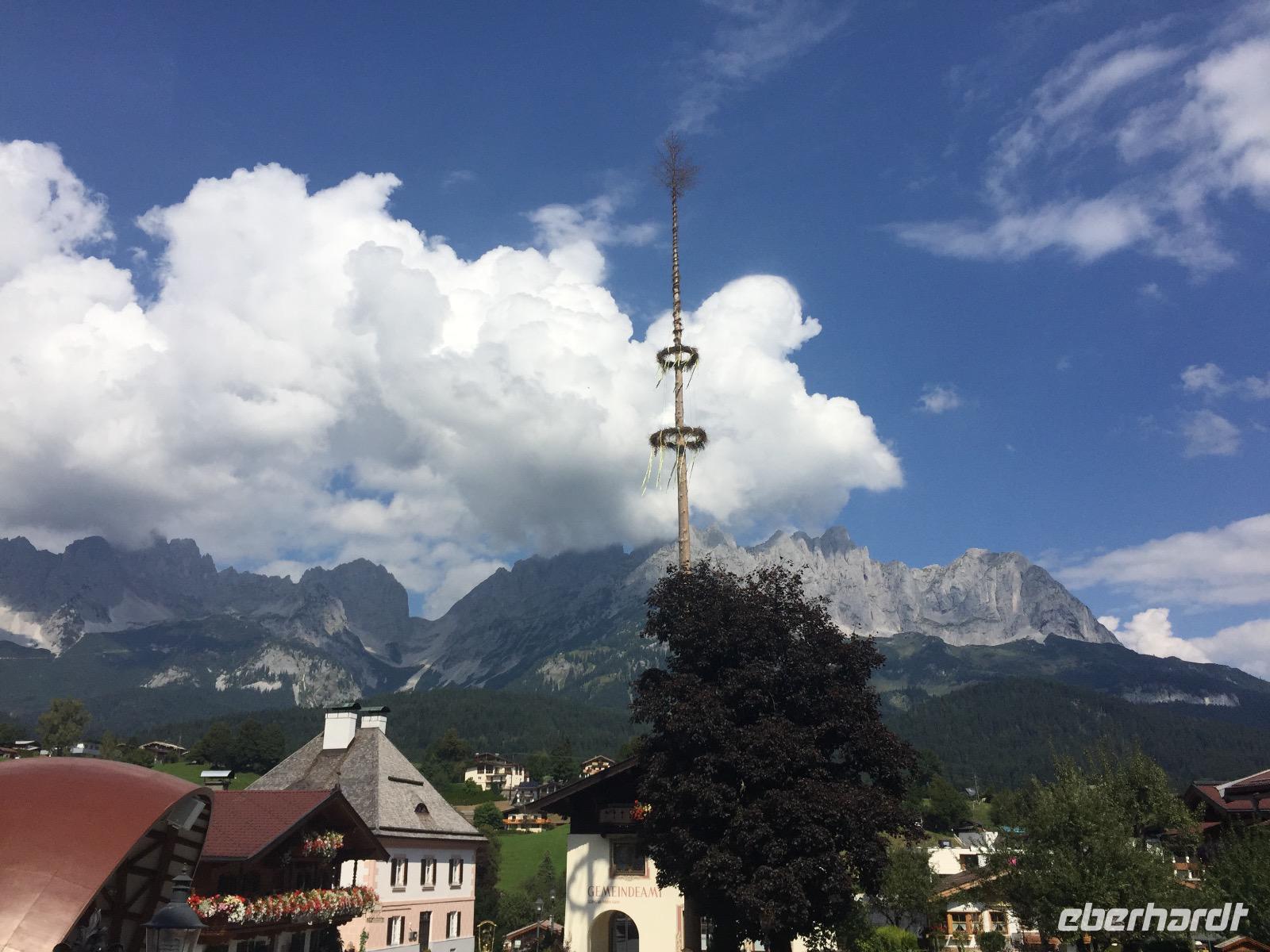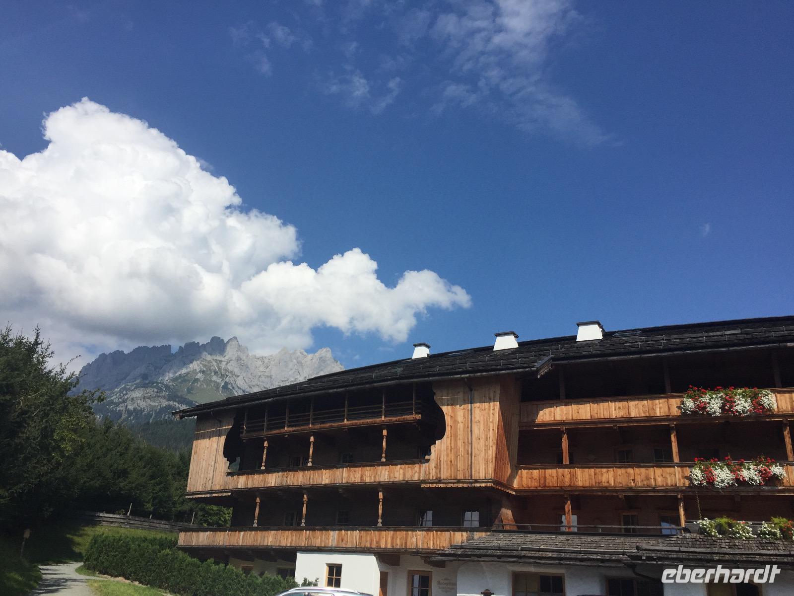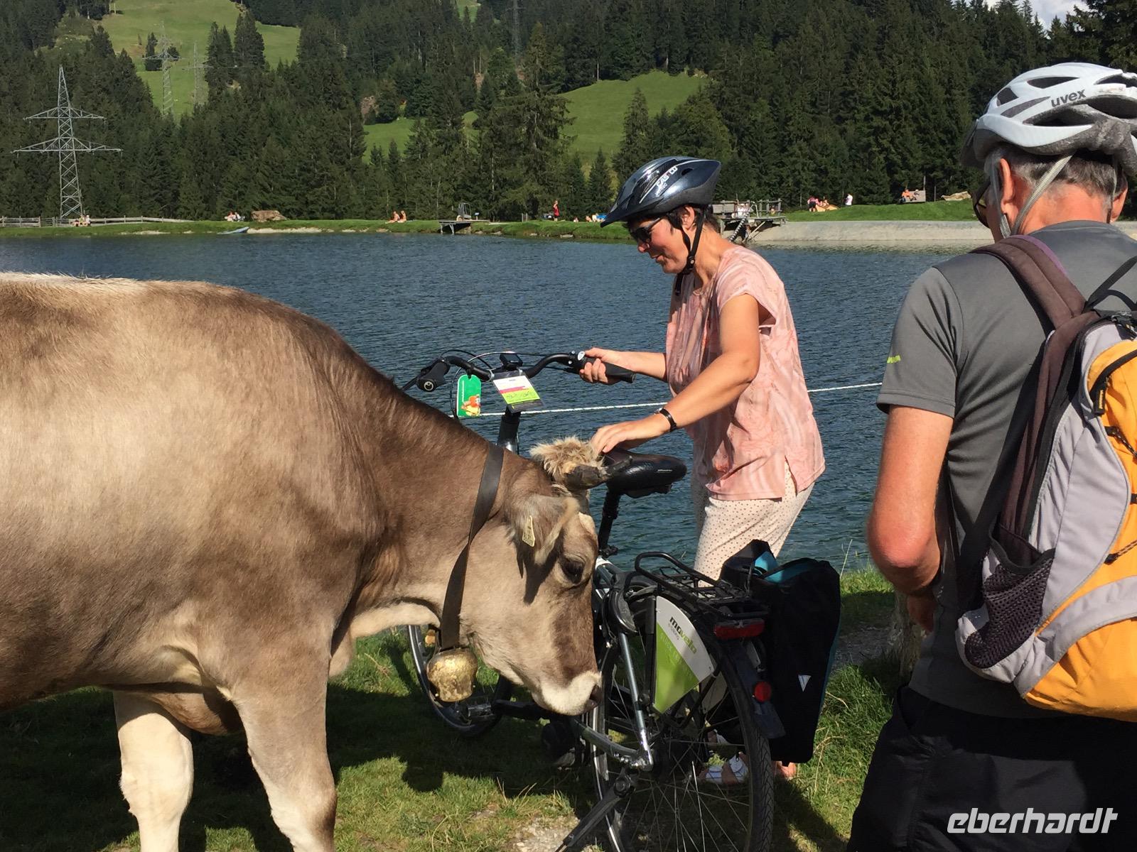 Heute steht die längste Tour auf dem Programm: Von Westendorf über Itter, Söll, Ellmau, Going, Reith, vorbei an Kirchberg und Brixen zurück nach Westendorf. Den ersten Stopp machen wir in Hopfgarten und besichtigen die in den letzten Jahren renovierte Hopfgartner Pfarrkirche, die auch „Dom des Brixentales" genannt wird. Das barocke, doppeltürmige Gotteshaus ist das weithin sichtbare Wahrzeichen von Hopfgarten. Die anschließende Etappe nach Itter ist der längste und steilste Anstieg der Tagestour. Über Söll erreichen wir Ellmau und statten der „Heimat des Bergdoktors" einen kurzen Besuch ab. In Going, mit Blick auf den Wilden Kaiser, legen wir unsere Mittagspause ein und bestaunen die Deckenmalerei der örtlichen Kirche. Ganz und gar nicht beeindruckt sind wir vom berühmten „Stanglwirt", dem Luxushotel mit ländlichen Touch. Lieber radeln wir weiter und genießen den Blick auf das grandiose Bergmassiv und die grünen Wiesen und Täler. Da es heute recht warm ist, sehnen sich alle nach einem Badestopp am Schwarzsee. Andreas führt uns dort in ein nettes Kaffeehaus, anschließend geht ein Teil der Gruppe schwimmen, während die anderen die „Riesen-Karpfen" vom Schwarzsee bestaunen. Der Heimweg folgt der bereits bekannten Route vorbei an Kirchberg und Brixen zum Gasthaus Aschenwald.