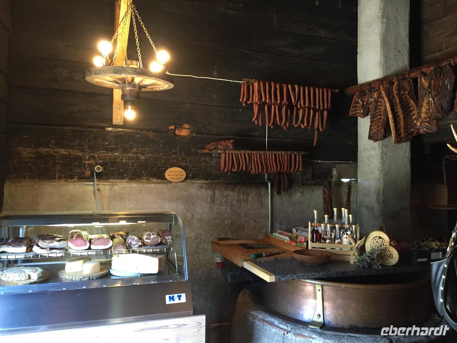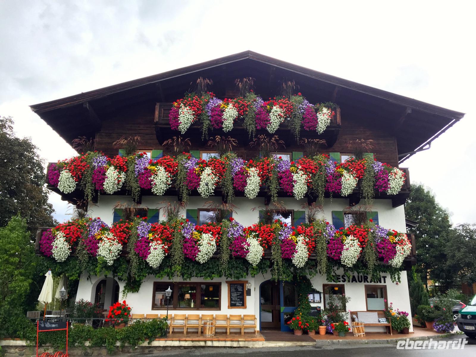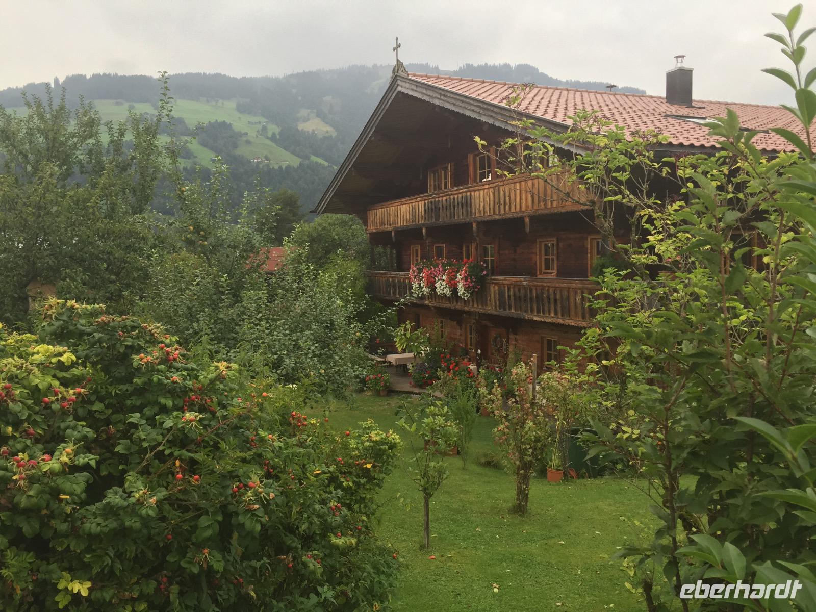 Am Morgen regnet es zunächst, deshalb verschieben wir die heutige Radtour auf den radfreien Donnerstag. Radlguide Andreas ist flexibel, wird kurzerhand zum Wanderguide und schlägt eine kleine Tour vor, um die Umgebung von Westendorf zu erkunden. Um zehn Uhr hat es bereits aufgehört zu regnen, blaue Streifen zeigen sich am Horizont, wir packen unsere Schirme in den Rucksack - müssen sie aber den ganzen Tag nicht auspacken, denn es bleibt trocken! Gleich hinter dem Gasthof geht's auf Landwirtschaftswegen über die Wiesen zum Ortsteil Moosen, dann entlang der Brixentaler Ache über den schmucken Ortsteil Feichten mit üppigem Blumenschmuck an den Balkonen. Um die Mittagszeit legen wir eine kurze Pause beim „Kogler- Bauernladen" in der Au ein und verkosten schmackhaften Bergkäse, pikante Bauernsalami und wohltuenden Birnen-Edelbrand. Anschließend umrunden wir den Golfplatz Westendorf, nehmen einen Anstieg zum sogenannten „Wohlfühlweg" und erreichen von Südwesten her das Zentrum von Westendorf. Nach vier aktiven Stunden gönnen wir uns eine Auszeit im Café Elisabeth bei Kaffee und exzellentem Kuchen! Einige beschließen den sportlichen Tag mit einem Saunagang, bevor wir uns beim Dreigangmenü in der Gaststube alle wieder treffen. Auf einem langen Bord über der Theke sind unzählige Pokale aufgereiht. Zunächst vermuten, wir, dass die Gaststätte auch Vereinslokal ist. Nach wenigen Tagen stellt sich jedoch heraus, dass alle von der Wirtin Roswita Aschenwald, einer sehr bekannten Skiläuferin und zweimaligen österreichischen Meisterin der 70er und 80er Jahre, erkämpft sind! Kompliment, liebe Rosi!!