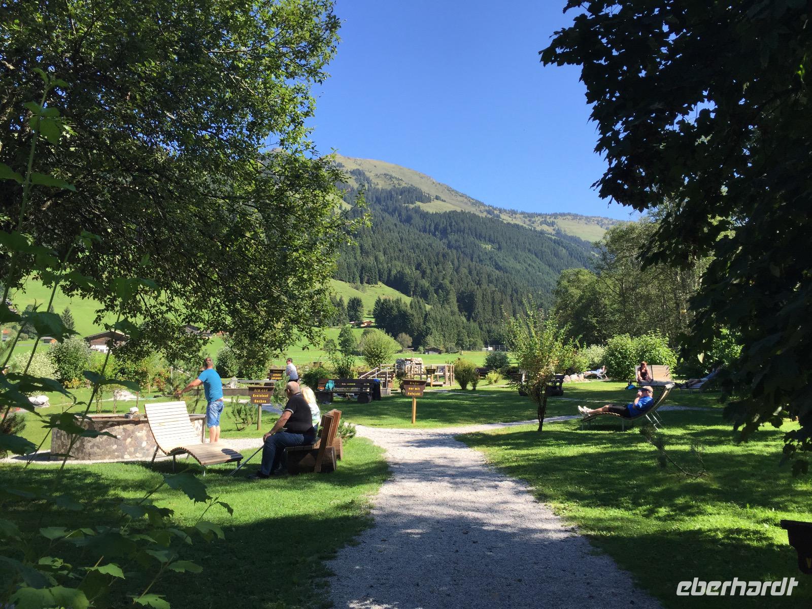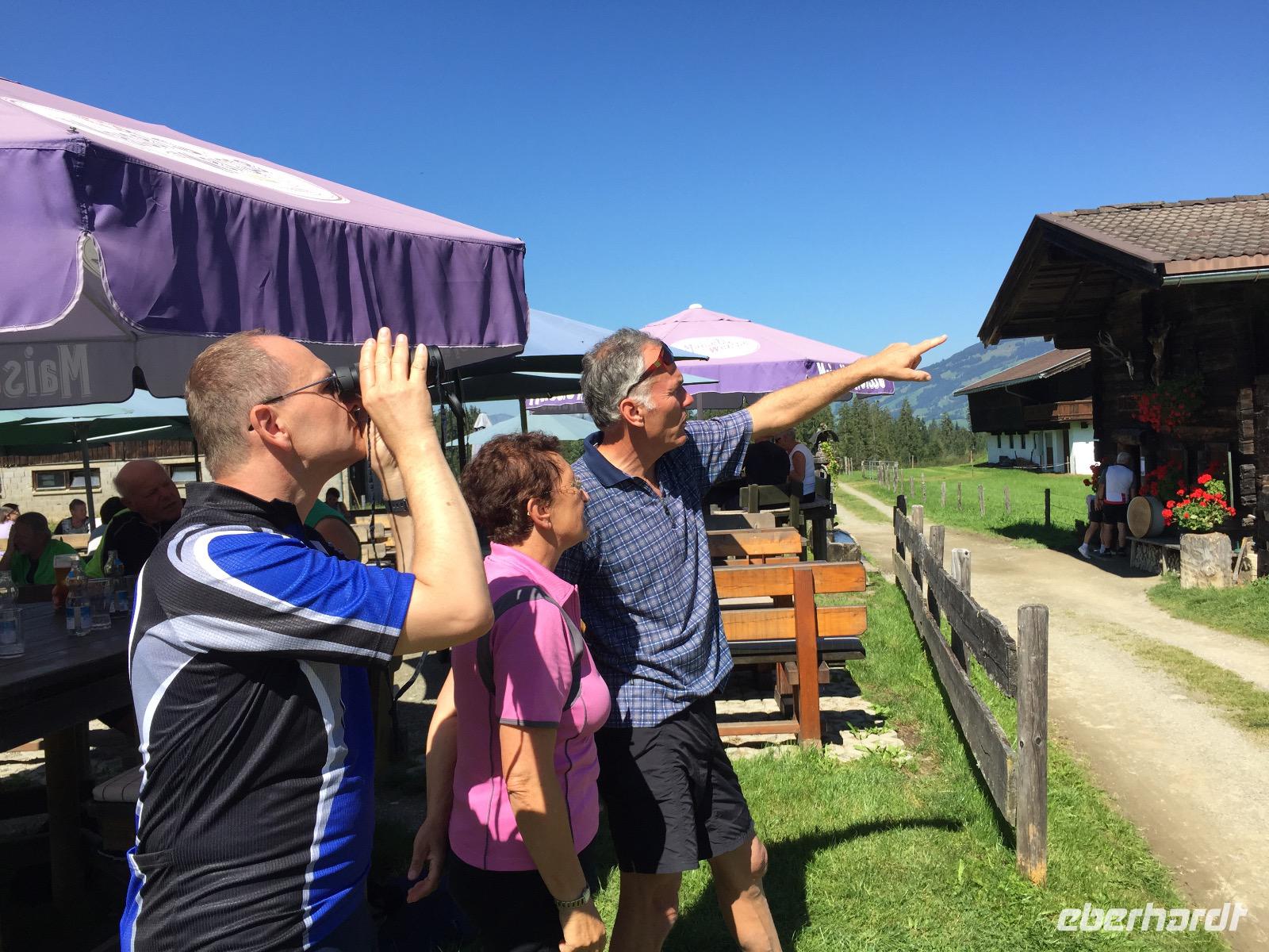 Tirol zeigt sich ab heute von seiner Sonnenseite! Über Wirtschaftswege radeln wir nach Kirchberg wo wir rechts ins Spertental abbiegen. Wir folgen dem Radweg entlang der Aschauer Ache nach Aschau, vorbei an der Oberlandhütte, und radeln in den Unteren Grund. Einen ersten Stopp legen wir am Kasplatzl ein, probieren den guten Kas bevor wir den steilen Anstieg zur Labalm meistern. Zehn Teilnehmer schaffen den Anstieg per Rad, lediglich einer muss absteigen und ein kleines Stück zu Fuß absolvieren. Dafür gibt es zur Belohnung leckere Kas- bzw. Speckknödl und eine herrliche Aussicht auf den markanten Rettenstein. Auf dem Rückweg wird eine zweite Rast am „Kneippwasser" in der Aschau eingelegt, alle genießen die vielfältigen Möglichkeiten zur Entspannung. Rasch geht der Rückweg, wir fahren bergab Richtung Kirchberg und machen einen letzten Kaffee-Stopp am Fischerstadl am „Erlensee" in Brixen.