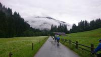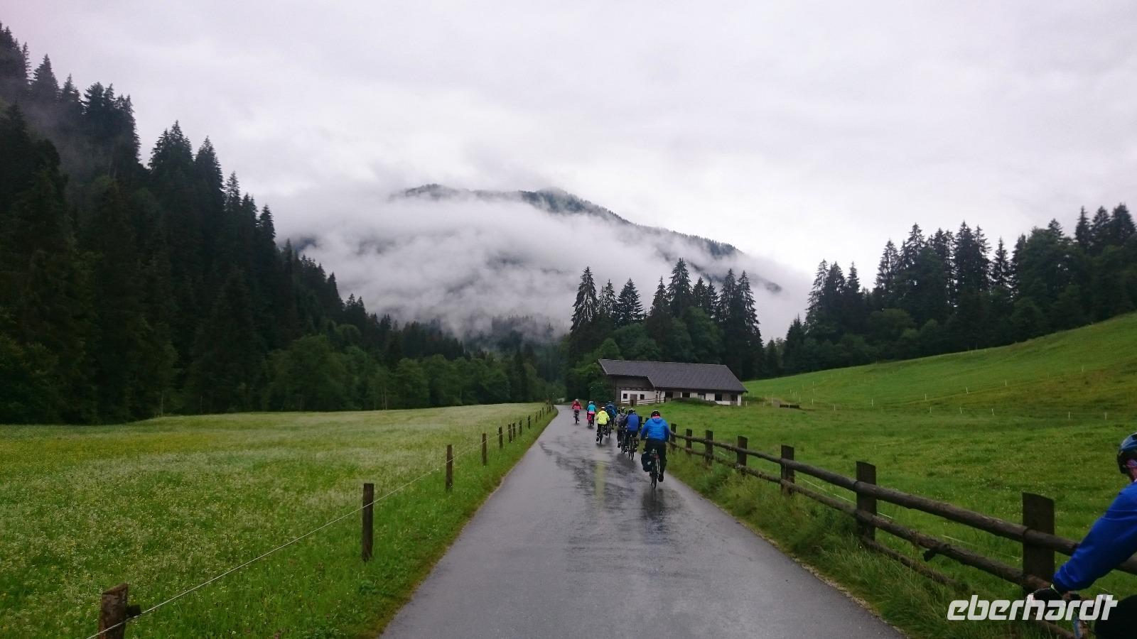Nach dem Frühstück fuhren wir durch Westendorf. Heute versprach das Wetter leider nichts Gutes. Dick eingepackt - von oben bis unten verschweißt waren die meisten gut verpackt und geschützt für die strengen Wetterbedingungen. An zahlreichen Golfplätzen vorbei fuhren wir eigentlich stetig bergauf. Über die Jägerhütte ging es zur Gamskogelhütte. Der Weg dorthin war sehr schön, aber schwierig zu fahren. Der andauernde Regen hatte die Schotterfahrbahn recht aufgeweicht. Es war seht schön schlammig. Der Schlamm spritze vorn und hinten an den Rädern hinauf. Dort angekommen genossen wir für einen Moment die frische Natur. Doch da die Hütte auch versperrt war und der Regen noch immer nicht gänzlich aufgehört hatte fuhren wir bergab zur Jägerhütte zurück. Dort nahmen wir die Abbiegung in die andere Richtung. Ein ziemlich steiler, schottriger Berg wartete auf uns. Mit maximalem Krafteinsatz kämpfte man sich nach oben. Aber der Anstieg war nicht zu lang. Schnell kamen wir auch auf Alm Straubing in Hinterwindau. Wir kehrten in die urige Holzhütte ein und wärmten uns am Ofen. Der Regen ließ nach und die Kleidung konnte etwas trocknen. Die Wirtin servierte uns dann eine deftige Brettljause mit zahlreichen Leckereien. Nach der kräftigen Stärkung ging es zurück ins Tal Brixen. Dort mussten wir uns erst den Schlamm von den Klamotten und den Satteltaschen fischen, bevor wir in den Gasthof Aschenwald gingen.
