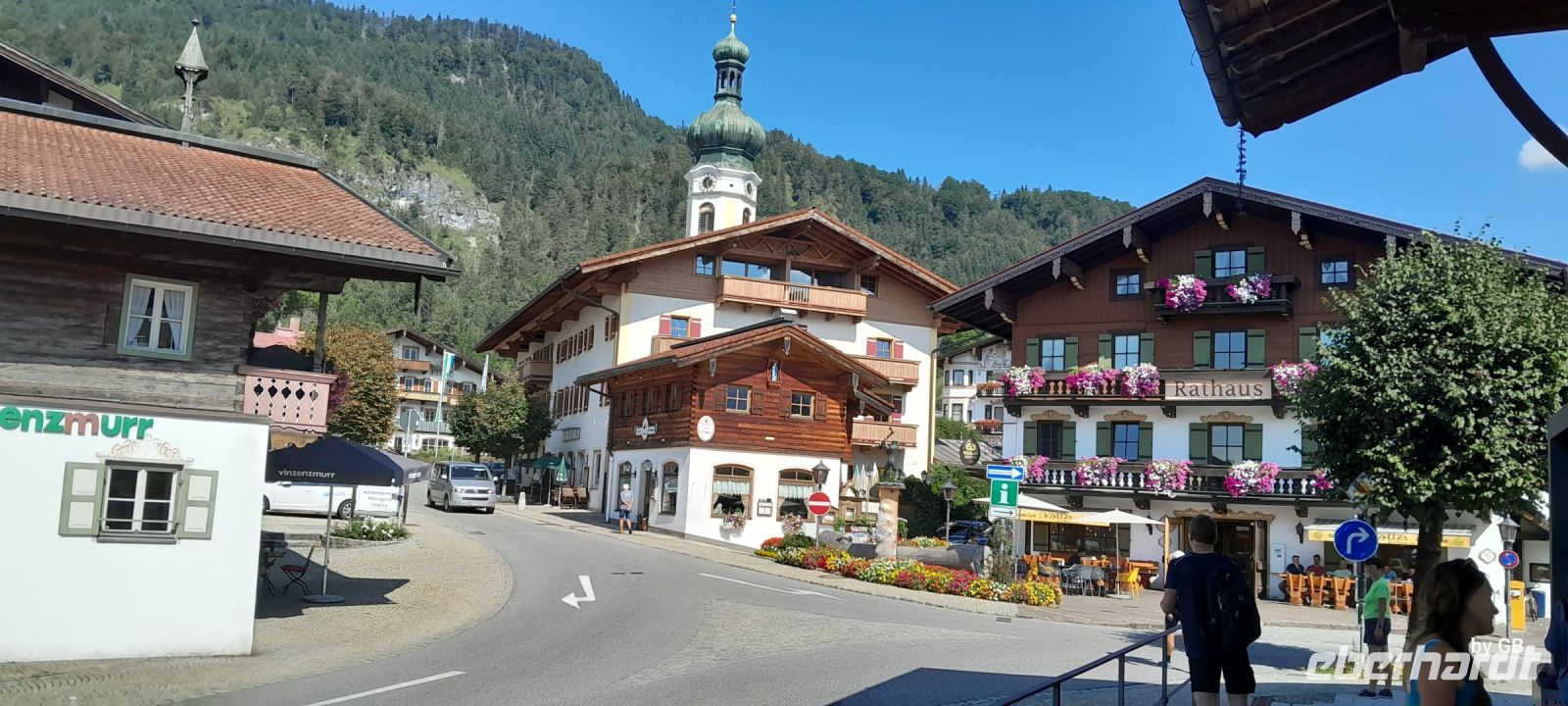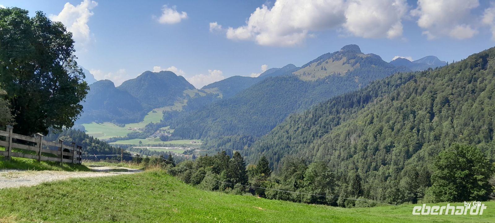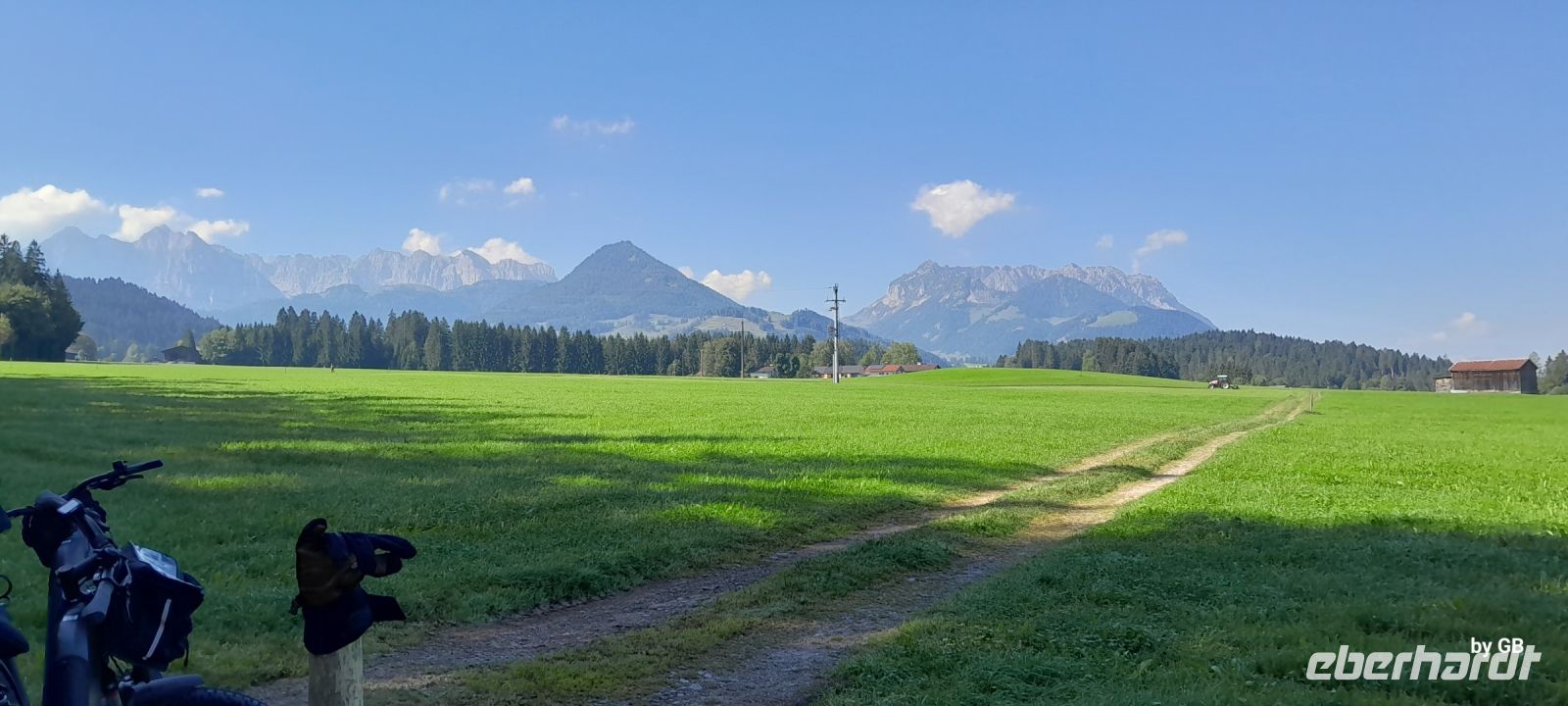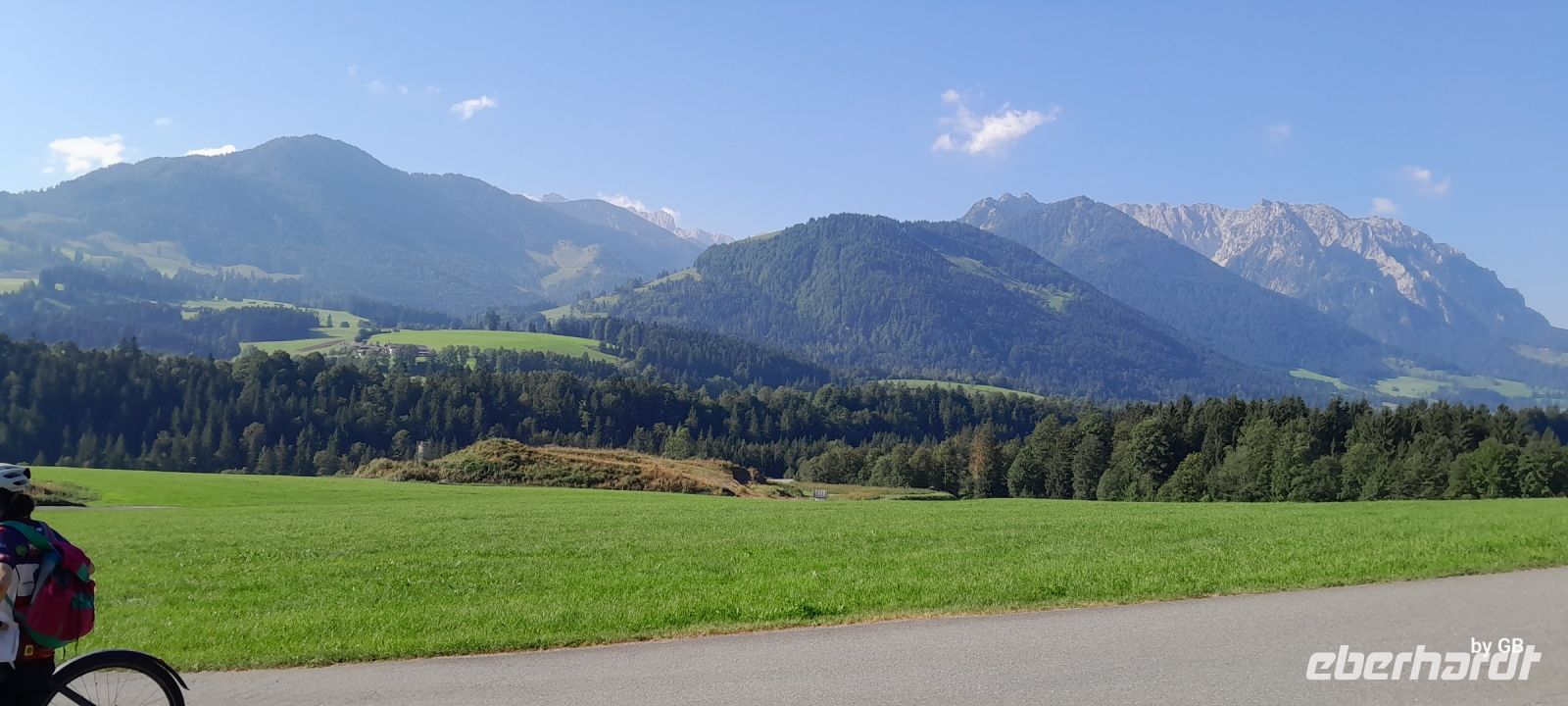 Unser Radguide holte uns erneut am Hotel ab. Gemeinsam radelten wir in Richtung Kössen. Ein einzigartiger Blick auf den Wilden- sowie den Zahmen Kaiser konnten wir bewundern. Einen kurzen Stop legten wir am Lift in Hochkössen ein, um die Landungen der Paragleiter zu beobachten. Anschließend radelten wir bis auf 900 Meter hinauf zur Jausestation Mühlberghof. Dort warteten hübsch angerichtete Jauseplatten mit regionaler Wurst, Käse und Brot auf uns. Wir konnten bei herrlichem Sonnenschein draußen sitzen und die Bergwelt um uns herum genießen. Der Radguide führte uns nach der Pause weiter aus Österreich hiinaus nach Deutschland, in die Bayrische Gemeinde Reit im Winkl. Für viele ein Paradies, im Sportoutlet mitten im Ort shoppen zu gehen. Es gibt eine interessante barocke Kirche zu sehen, aber auch nette Cafés und Eisdielen. Nach ausreichender Pause radelten wir wieder unter Romans Führung zurück nach Walchsee.