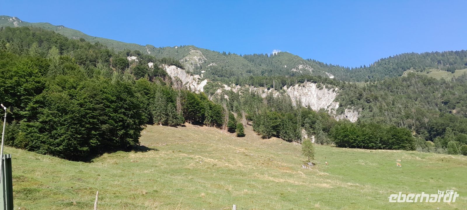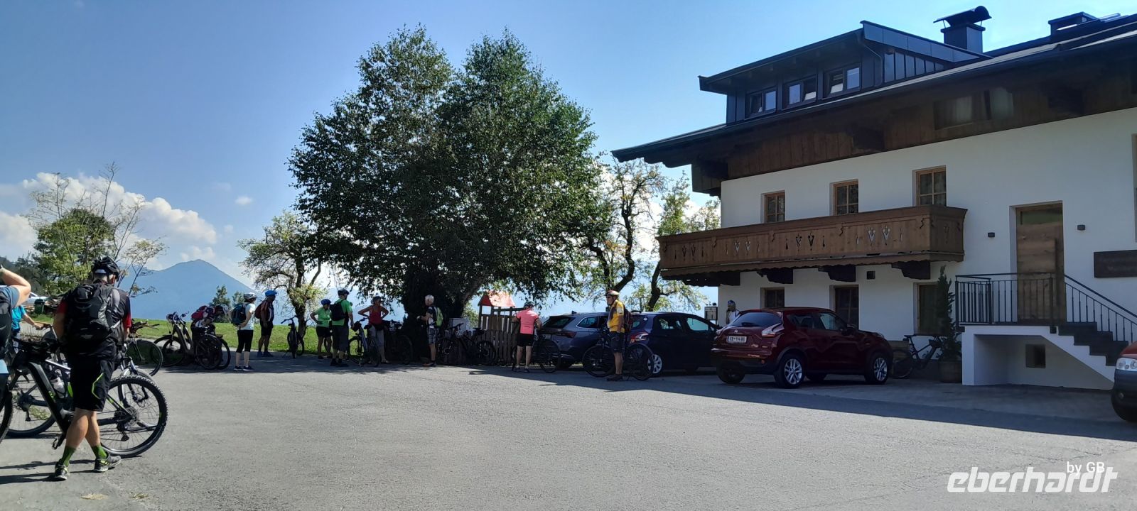Romen führt uns heute über Kössen, entlang der Großarche hinein ins Kaiserbachtal. Es geht ordentlich bergauf bis zur Fischbachalm. Wie gut, dass wir gut E-Bikes fahren! Die Mühe wir aber dann belohnt: Auf der Fischbachalm erwartet uns eine landestypische Jauseplatte, und für viele hoch ein leckerer Nachtisch. Aber nicht genug der Steigungen: Roman fährt mit uns noch weiter hinauf bis zur Griesner Alm. Dort hatte man nochmal eine tolle Aussicht auf das Bergmassiv des Wilden Kaisers.