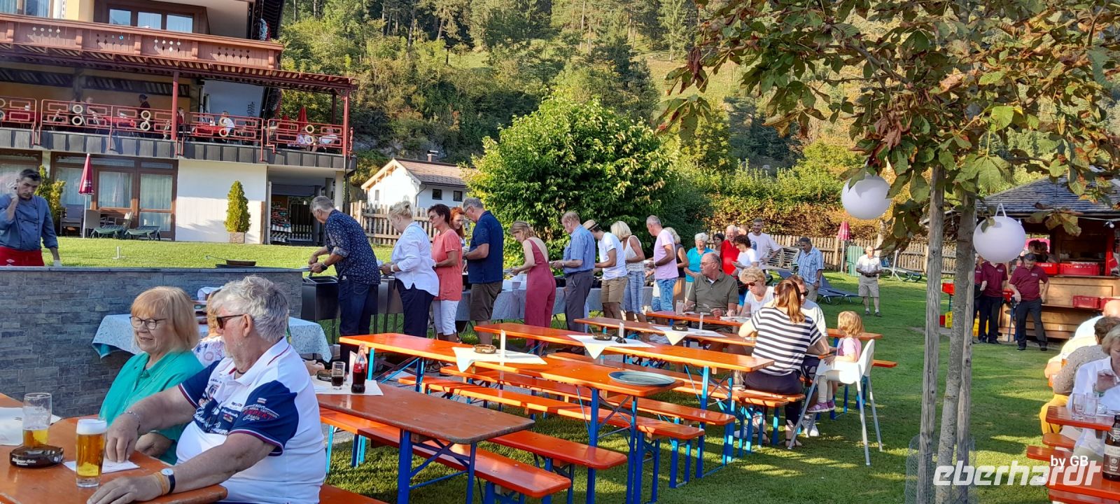Bis auf drei Reisegäste, die mit PKW oder Bahn angereist waren, stiegen wir alle in den Eberhardt Urlaubsbus nach Tirol, die ersten bereits in Dresden, die übrigen an den diversen Zustiegsstationen des Busses. Leider gab es auf der Strecke einige Staus, sodass wir mit ca 2-stündiger Verspätung unser Hotel erreichten. Letztlich konnten wir alle gegen 14.00 h unsere Zimmer beziehen. Um 15.00 h trafen wir uns dann alle auf der tollen Terrasse des Hotel-Restaurants zu einem Begrüßungs-Sekt und anschließendem Kaffee und Kuchen. Unser Fahrrad-Guide Roman hatte ebenfalls Zeit, uns alle zu begrüßen und erste Informationen über die nächsten Tage zu geben. Dann war erst einmal Zeit, die tolle Aussicht über den See zu genießen oder gar ein erstes Bad im See zu wagen.