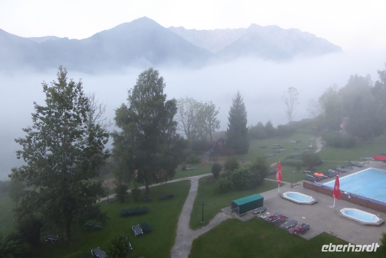 Aber die Wettervorsage, die schon am Vorabend abzurufen war, sollte zutreffen: Gegen 09.00 h fing es heftig an zu regnen. Alle Gäste, unser Guide Roman und RBGL George, tragen sich in der Hotellobby um zu beraten. Allerdings waren nur zwei bereit, auch im Regen zu radel: Roman und ich. Es herrschte die einhellige Meinung vor, dass man sich die wunderbaren Tage zuvor nicht durch diesen schlechten, klatschnassen Tag vermiesen lassen wollte. Also wurde unser Guide final verabschiedet, das Weißwurstessen abgesagt und die hoteleigene Kegelbahn gebucht.