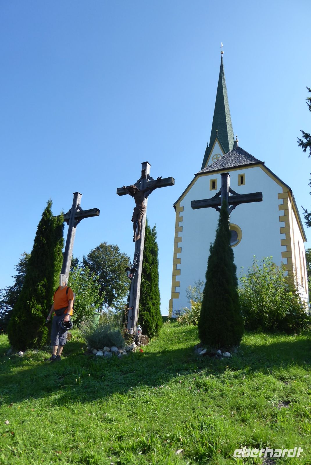 Weiter ging es zur gotischen St. Nikolaus Kapelle am Buchberg/ Ebbs. Eine kleine Kirche, von der man eine tolle Aussicht über Ebbs ins Inntal bis nach Kufstein hatte. Da wir schon einen ersten steilen Aufstieg hinter uns hatten, gab es als Stärkung ein Getränk und einen Schokoriegel. Weiter ging es über hügeligen Wege an der Südseite des Walchsees Richtung Kössen mit einem weiteren Pause beim Riedlwirt. Gestärkt fuhren wir von Riedlwirt zurück nach Walchsee, wo uns im Hotel bereits wieder das Kuchenbuffet mit dazugehörigem Kaffee erwartete.
