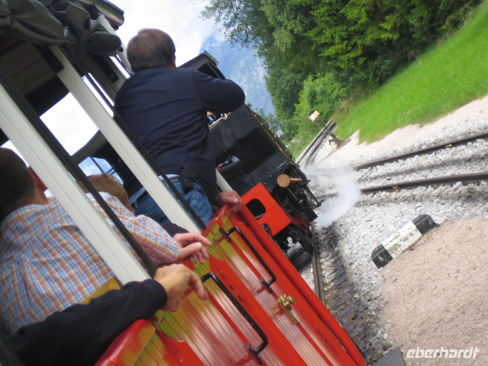 konnten. Jetzt war unsere Reisegruppe komplett und unser Ziel hieß - Kirchberg in Tirol. Vorbei an Nürnberg und Ingolstadt erreichten wir München mit einem Blick auf die futuristische Allianzarena. Bei unserer letzten Rast am Rasthof Irschenberg zeigten sich die Alpen und gaben einen Ausblick auf die uns in Tirol erwartete Landschaft. Vorbei an Kufstein am grünen Inn erreichten wir am Nachmittag unser 4 * Hotel „ Bräuwirt“ in Kirchberg. Nach dem Zimmerbezug war noch etwas Zeit für ein erstes Kennenlernen des Ortes. Die Zimmer waren zur Zufriedenheit aller und das Abendessen, welches im großen Rettensteinzimmer serviert wurde, auch. Am Sonntag erwartete uns der erste Höhepunkt unserer Reise - eine Fahrt mit der historischen Aachensee - Dampf - Zahnradbahn zum Aachensee.