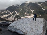 Unser dritter Tag war der erste Tag mit Panoramafahrt. Ziel war das Timmelsjoch auf 2.474 m Höhe, das gleichzeitig auch die Grenze zu Italien ist. Bevor wir es jedoch erreichten, ging es vorbei an blühenden Wiesen und dem bekannten Wintersportort Sölden. Auf dem Weg begegneten uns immer wieder Biker und so manches Grauvieh behinderte unseren Bus (Foto). Je höher es ging, umso mehr Schneefelder musste die Straße passieren. Die Hochalpenstraße ist 12 km lang, verfügt über 12 Kehren und eine maximale Steigung von 10%. Sie gehört zu den höchsten befahrbaren Pässen in Europa.