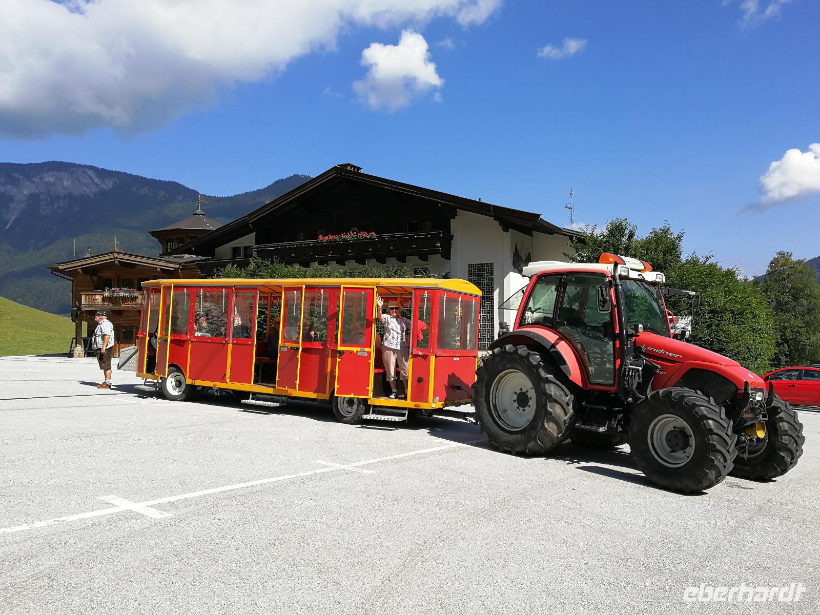 Heute haben wir eine schöne Fahrt um die Hohe Salve vor uns. Nach dem Frühstück fahren wir über Itter nach Söll. Dort spazieren wir durch den schönen Ort und zur Kirche, bevor wir das kurze Stück zur Gondelbahn fahren. Dort kommt er schon an, der Peter vom Gruberhof mit seinem Traktor. Ganz tirolerisch sieht er aus, mit Filzhut, Lederhose und kariertem Hemd. Am Traktor ist ein guter Hänger mit Sitzbänken angebracht und wir fahren in diesem hinauf in die Berge Tirols. Vorbei an grünen Wiesen geht's auf zum Gruberhof. Das ist ein tolles Erlebnis. Oben angekommen, erwartet uns ein uriger Gasthof, wo selbst die Großen wieder zu Kindern werden und mit Minitraktoren herumfahren. Bei frischer Bergmilch oder einem kühlen Bier genießen wir den Ausblick. Später erzählt Peter uns noch vom Bergdoktor, welcher hier oben gedreht wird. Er bringt uns nun wieder sicher mit seinem Traktor zurück ins Tal. Weiter geht es vorbei an Scheffau nach Ellmau, von woaus wir hinauf zur Wochenbrunner Alm fahren. Ganz nah unter dem Wilden Kaiser liegt dieser Gasthof, wo wir mit einer guten Jause begrüßt werden. Anschließend spazieren einige entlang des Bergbaches durch den schönen Wald, andere kneippen oder genossen die Aussicht von der Terrasse. Weiter geht es durch Going zum Stanglwirt, wo wir in den Gastraum mit Blick in den Kuhstall schauen. Weiter geht es durch Reith und vorbei am Schwarzsee nach Kitzbühel. Anschließend spazieren wir durch Kitzbühel und suchen die Reichen und Schönen. Am Abend verwöhnt uns Rosi wieder mit gutem Abendessen im Gasthof.
