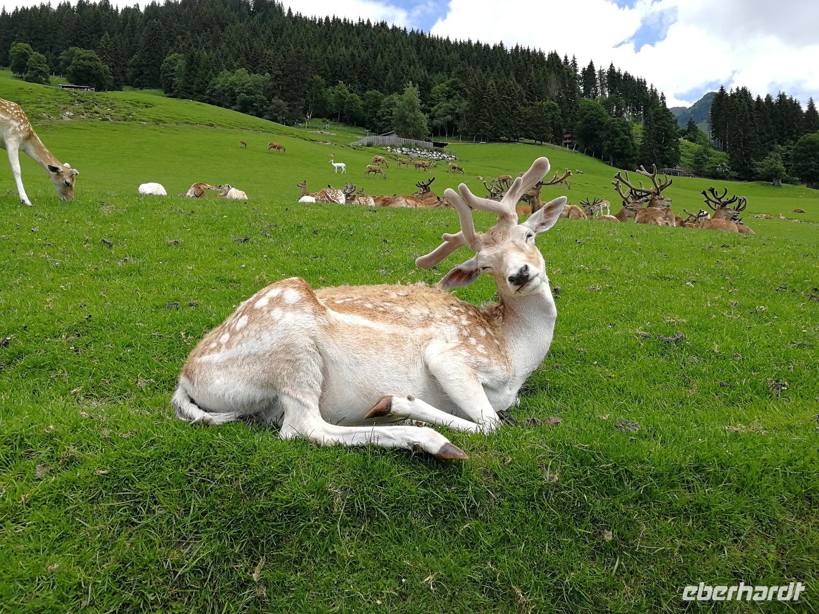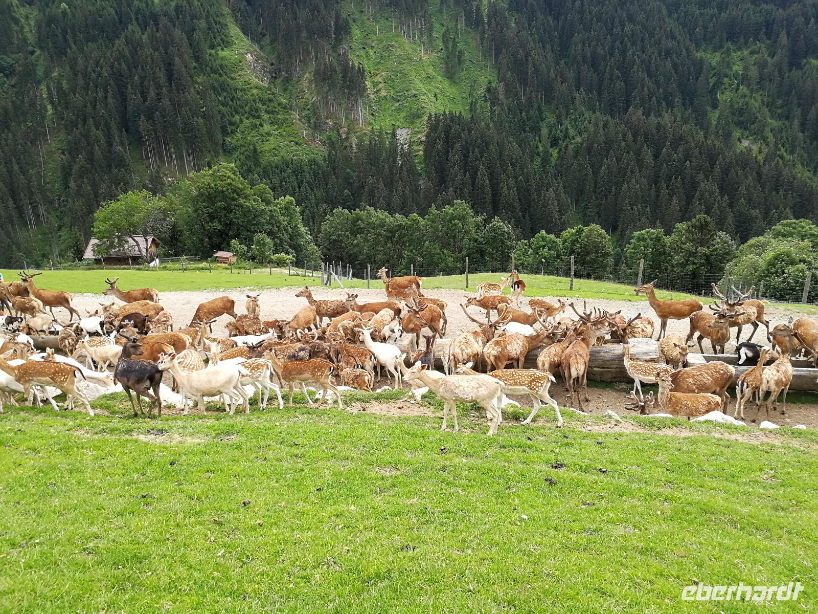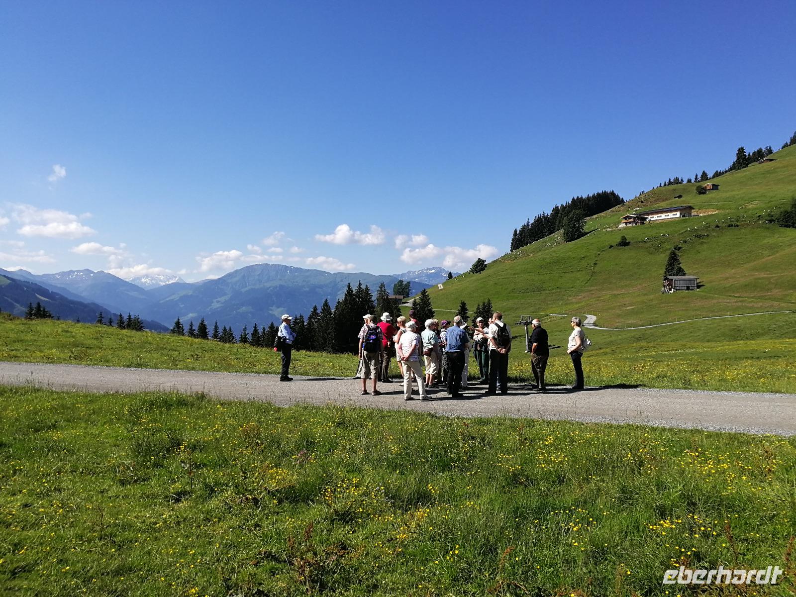 Heute fahren wir ins nahegelegene Brixen im Thale, wo wir mit der Gondel hinauf nach Hochbrixen fahren. Die nette Bergsteigerin Regina fährt mit uns hinauf nach Hochbrixen, dort spazieren wir mit ihr gemütlich zum Filzalmsee. Regina ist eine „Kräuterhexe", denn sie hat sehr viel Wissen über die Kräuter der Berge. Sie erklärt uns die verschiedenen Bergblumen und Kräuter, es ist sehr interessant so viel Neues zu erfahren. Am Filzalmsee treten wir im Moorbecken herum und staunen über diesen wunderschönen See. Einige Gäste unternehmen eine kleine Wanderung mit Regina und Mandy bis zur Frankalm, wo wir uns in dieser urigen Hütte ein kühles Bier oder eine Buttermilch schmecken lassen. Einige Gäste bleiben am See und entspannen auf den wunderbaren Holzliegen. Später treffen wir uns alle an der Almhütte bei der Gondelstation wieder und einige lassen sich ein kleines Mittagessen schmecken. Mit der Gondel geht es wieder hinab nach Brixen im Thale, wo Peter bereits mit leckerem Kaffee auf uns wartet. Weiter geht es mit dem Bus vorbei an Kitzbühel zum Wildpark Aurach. Dort erleben wir um 14 Uhr die Wildtierfütterung, bei der Hirsche, Rehe und Esel sowie Ziegen gefüttert werden. Ein großes Spektakel! Dieser Wildpark ist wunderbar gelegen in den Bergen der Kitzbüheler Alpen und wir genießen die Aussicht auf diese Berglandschaft. Anschließend lassen wir uns noch einen Kaffee und Eisbecher im Stadl neben dem Wildpark schmecken. Später fahren wir zurück in unseren Gasthof und genießen am Abend einen Grillteller und zum Nachtisch einen leckeren Kaiserschmarn.