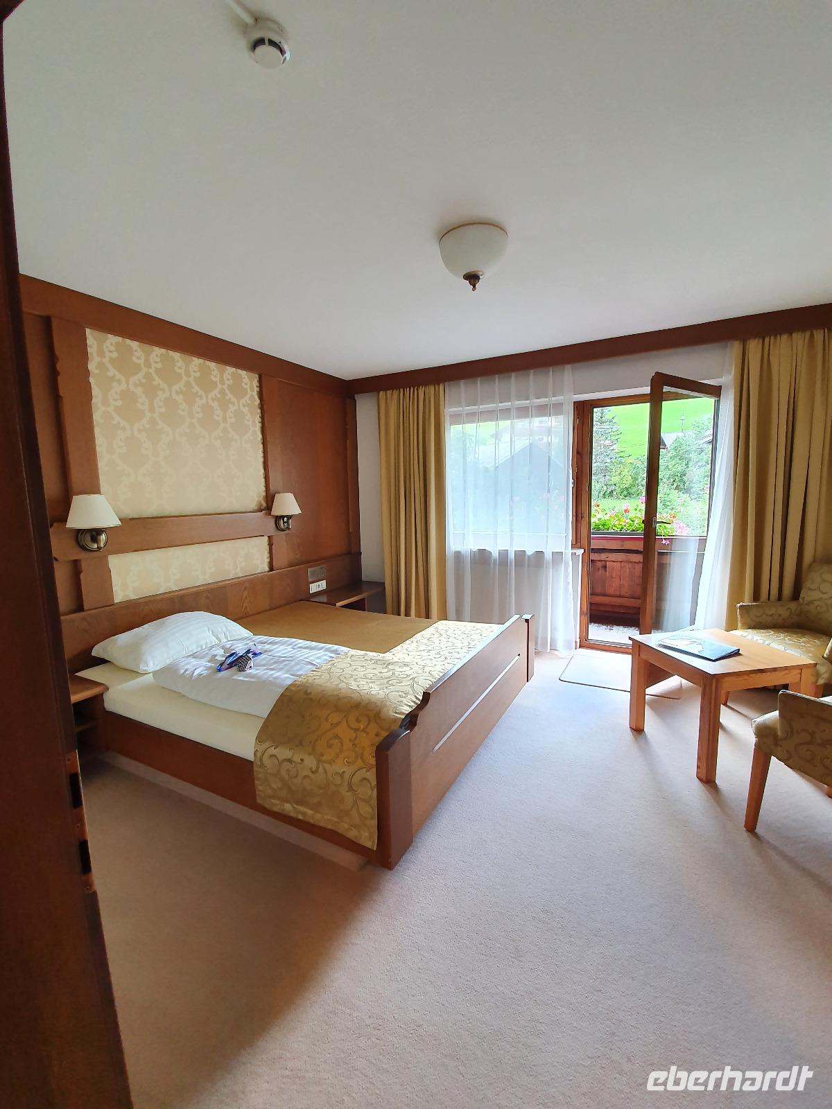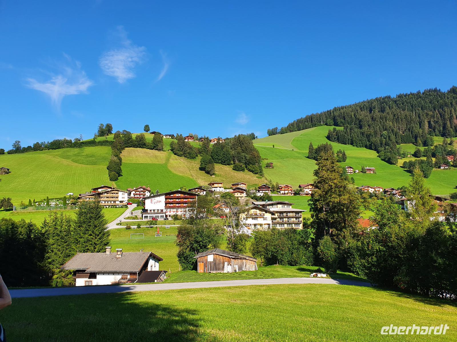 Bereits um 4 Uhr startete ein Teil der Reisegruppe mit dem Bus vom Dresdner Flughafen nach Tirol. Nach mehreren Zwischenstopps und um weitere Gäste einzuladen, kamen wir gegen 12 Uhr in Wörgl an. Dort wurde unsere Gruppe von einem Taxi erwartet, welches uns innerhalb kürzester Zeit in unser Hotel Elan in Oberau brachte. Willem, der Wirt des Hauses, hat uns bereits draußen vor dem Hotel freudig in Empfang genommen. Jeder Einzelne hatte erst einmal drei Stunden Zeit für sich, um in Österreich in Ruhe anzukommen und die Umgebung zu erkunden. Da vier Gäste unserer Wandergruppe selbstständig mit dem Auto anreisten, trafen wir uns allesamt um 16 Uhr im Hotelrestaurant zum Kaffeetrinken. Ich (Sophia, die Reisebegleiterin) überraschte die Gäste mit gefüllten Eberhardt-Brotdosen, die sie täglich als Lunchpaket nutzen konnten. Nach einem ersten Kennenlernen entwickelten sich kleine Grüppchen, die die Zeit bis zum Abendessen gemeinsam verbrachten. Uns erwartete ein leckerer Schweinebraten mit Sauerkraut und Kartoffeln - ein vegetarisches Gericht wäre natürlich auch möglich gewesen. Wir waren an diesem Abend alle sehr müde von der Anreise, sodass wir recht zeitig die Hotelzimmer aufsuchten.