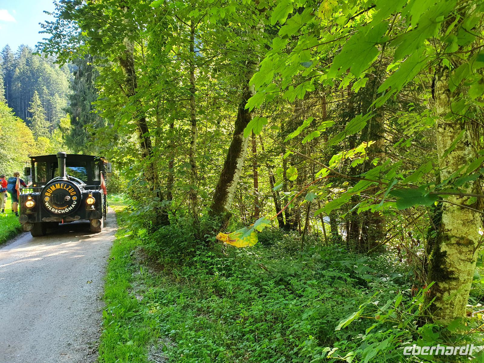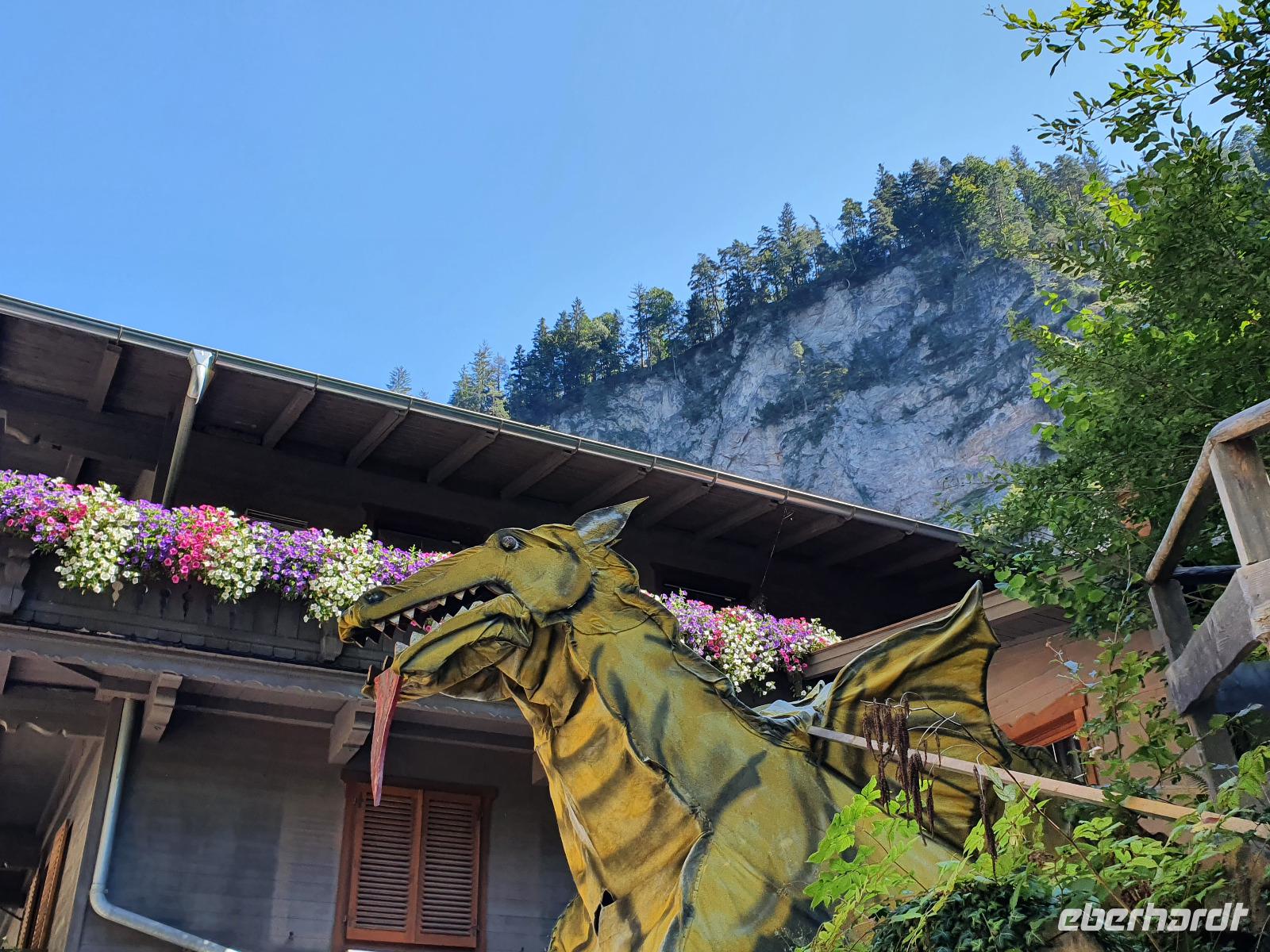 Am Morgen begrüßte uns ein weiterer Wanderleiter, der Rainer. Rainer ist ein ausgebildeter Bergwanderführer und kennt sich in seiner Heimat, der Wildschönau, bestens aus. Zusammen fuhren wir mit dem Taxi nach Mühltal, von woaus wir die Wanderung über sieben Kilometer Richtung Kundler Klamm entlang der Wildschönauer Ache auf uns nahmen. Mal wieder hatten wir das Glück bei strahlendem Sonnenschein das Bergpanorama genießen zu können. Wer von Mühltal bis zum Eingang der Kundler Klamm nicht zu Fuß gehen wollte, hatte die Möglichkeit, den Bummelzug zu nutzen. Die restlichen 2,5 Kilometer in die Klamm hinein mussten jedoch selbstständig erlaufen werden. Unsere Gruppe hielt tapfer durch und schaffte die gesamte Strecke ohne Hilfe des Zuges. Vor dem Eingang der Klamm unterrichtete uns Rainer darüber, wie die Kundler Klamm entstanden ist und weshalb über den ganzen Weg verteilt Drachenskulpturen aus Holz zu sehen sind. Die Geschichte besagt, dass es vor vielen Jahren in der Wildschönau einen See gab, in dem ein Drache lebte. Eines Tages kam es jedoch zu einem Streit zwischen dem Drachen und der Menschen, sodass es zu einem heftigen Kampf kam. Der Drache wurde hierbei schwer verletzt und schlug mit seinem Schwanz so heftig auf die Felsen, dass sie auseinanderbrachen. So entstand die Klamm durch die das Wasser des Sees abfloss.