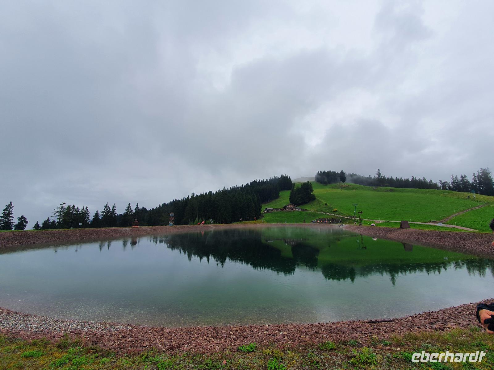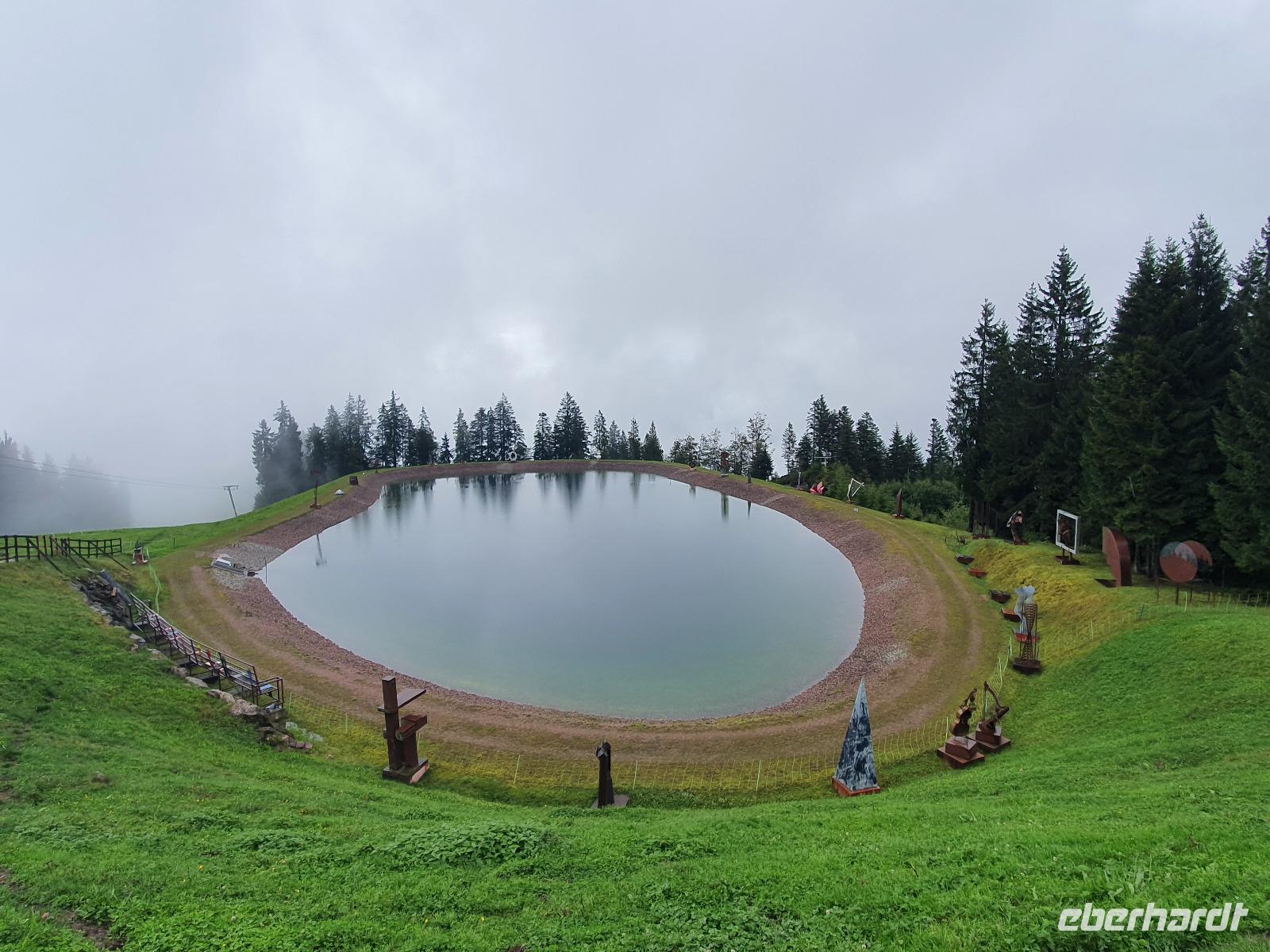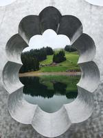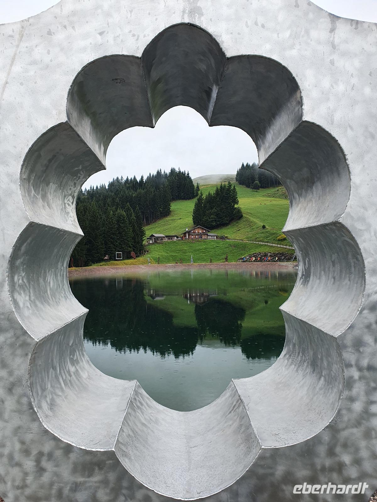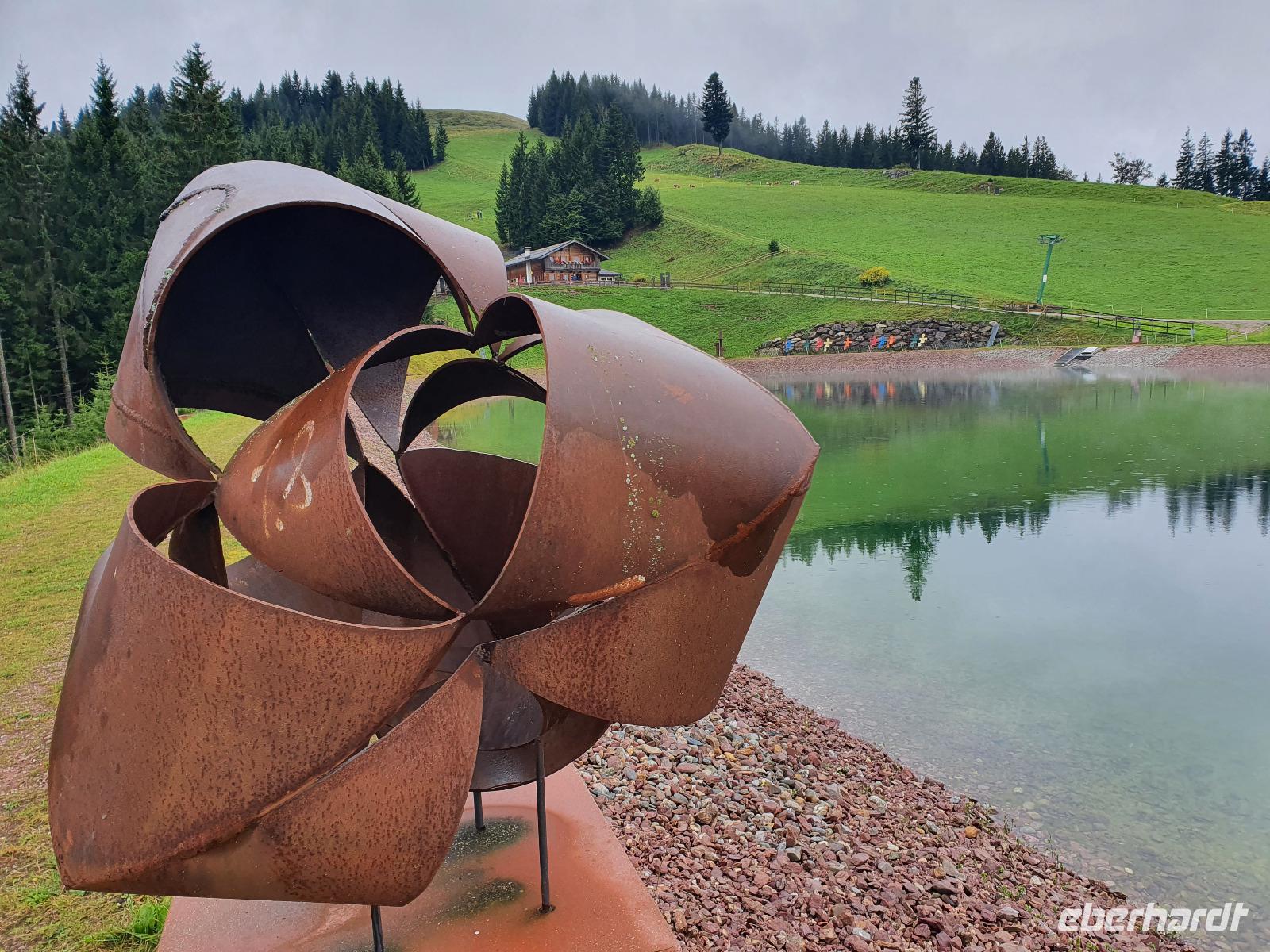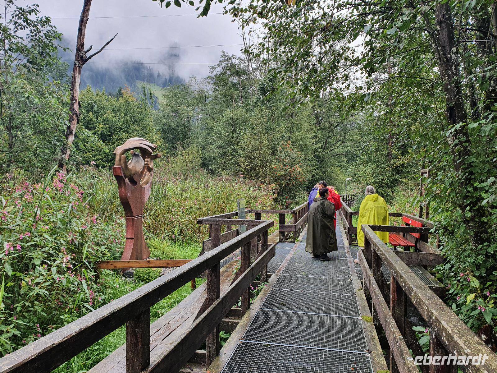 Wanderleiter Rainer holte uns am Hotel ab und führte uns über Oberau mit Besichtigung der Antoniuskapelle, dem Schuster-Haus und der Parrkirche weiter über den gemütlichen Spazierweg "Besinnungsweg oder auch Franziskusweg". Auf dieser Strecke Richtung Niederau sind neun Bronzestationen vom Bildhauer Hubert Flörl erschaffen worden, die die Strophen des Lobgesanges des heiligen Franziskus an die Sonne, an das Universum, an den Wind und das Wetter, an das Wasser, an das Feuer, an die Welt mit ihren Samen und Früchten, an die Liebe und an den Tod zeigen. In Niederau haben wir den Berglift auf das Markbachjoch hinauf genommen. Leider war dieser Tag etwas verregnet, sodass uns eine tolle Aussicht über die Bergwipfel verwehrt blieb. Die Wandergruppe machte sich auf den Weg zum Mittermoosen Bergteich, um den 30 Skulpturen von internationalen Künstlern rundherum aufgestellt sind.