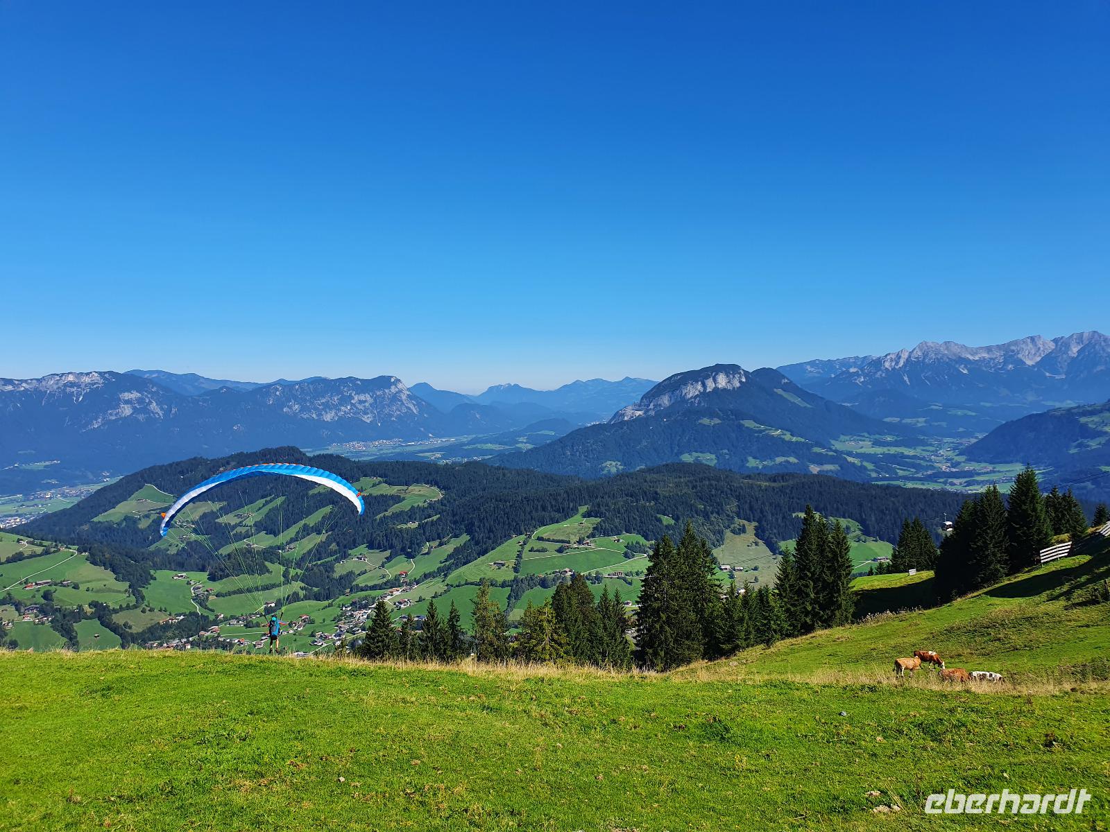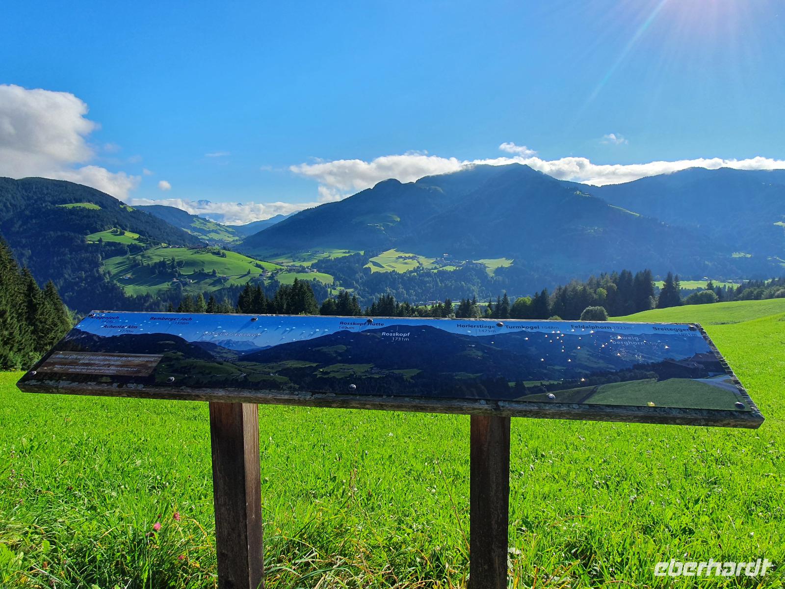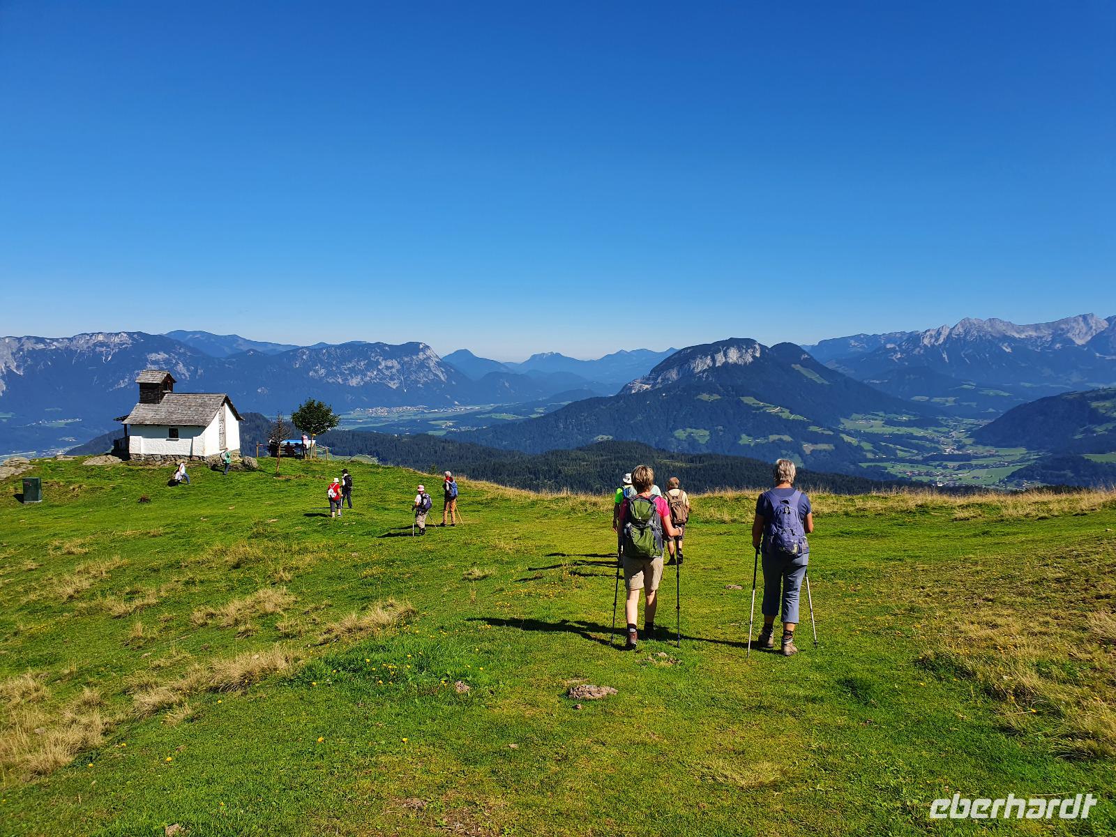 Auf unserer letzten Wanderung begleitete uns wieder der liebe Hans. Wir fuhren gemeinsam nach Niederau zur Seilbahn des Markbachjochs. Auf 1500 Metern Höhe angekommen konnten wir bereits den Rosskopf, den Wilden Kaiser sowie das Feldalphorn bestaunen. Nach einem kleinen Abstecher zur Markbachjochkapelle bewunderten wir die mutigen Paragleiter, die sich am Startplatz tummelten. Weiter ging es vorbei an der Käsealm in Richtung Rosskopfhütte, wo sich einige eine frische Buttermilch oder einen selbst gemachten Joghurt gönnten.