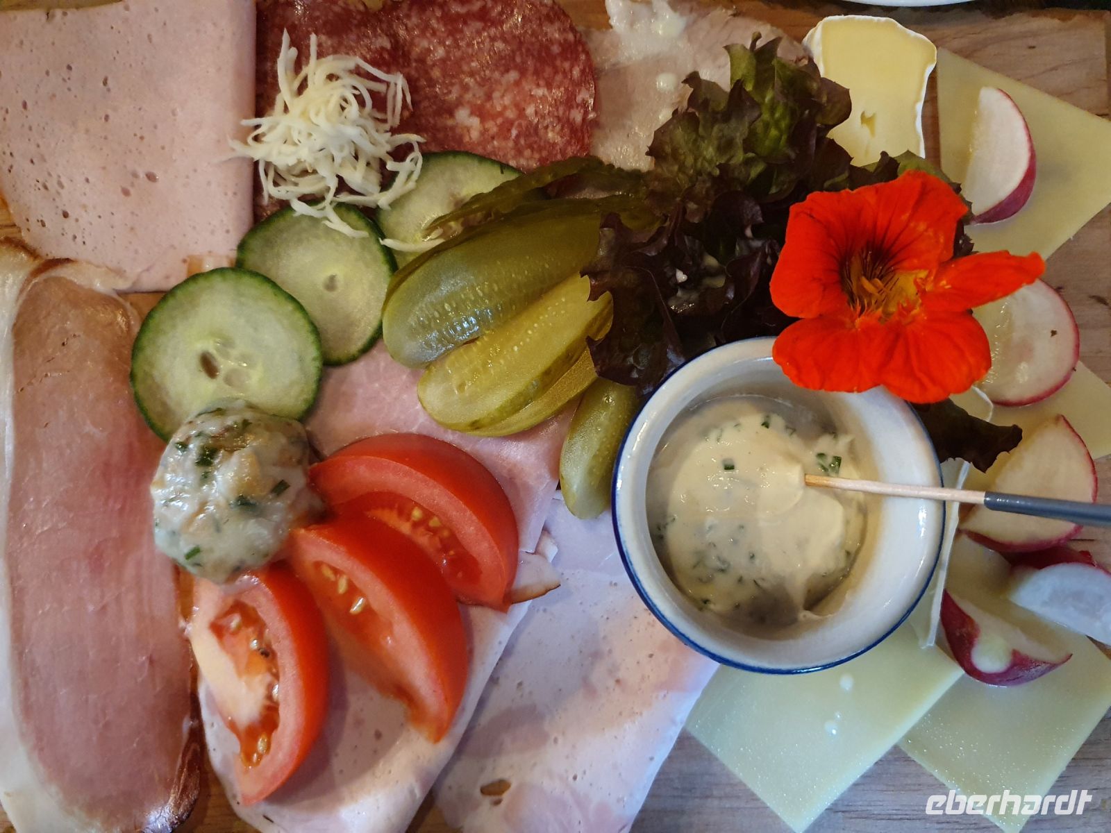 Nun ja, auch heute sollte es einige Regenschauer geben. Also packten wir erneut unsere Regenkleidung ein. Heute ging es nämlich hinauf zum Mühlberghof. Vorbei an Kössen radelten wir bis auf 900 Meter zu unseren allerliebst vorbereiteten Jauseplatten. In der gemütlichen Stube mit Ofen ließen wir uns die regionalen Köstlichkeiten und heißen Getränke schmecken.