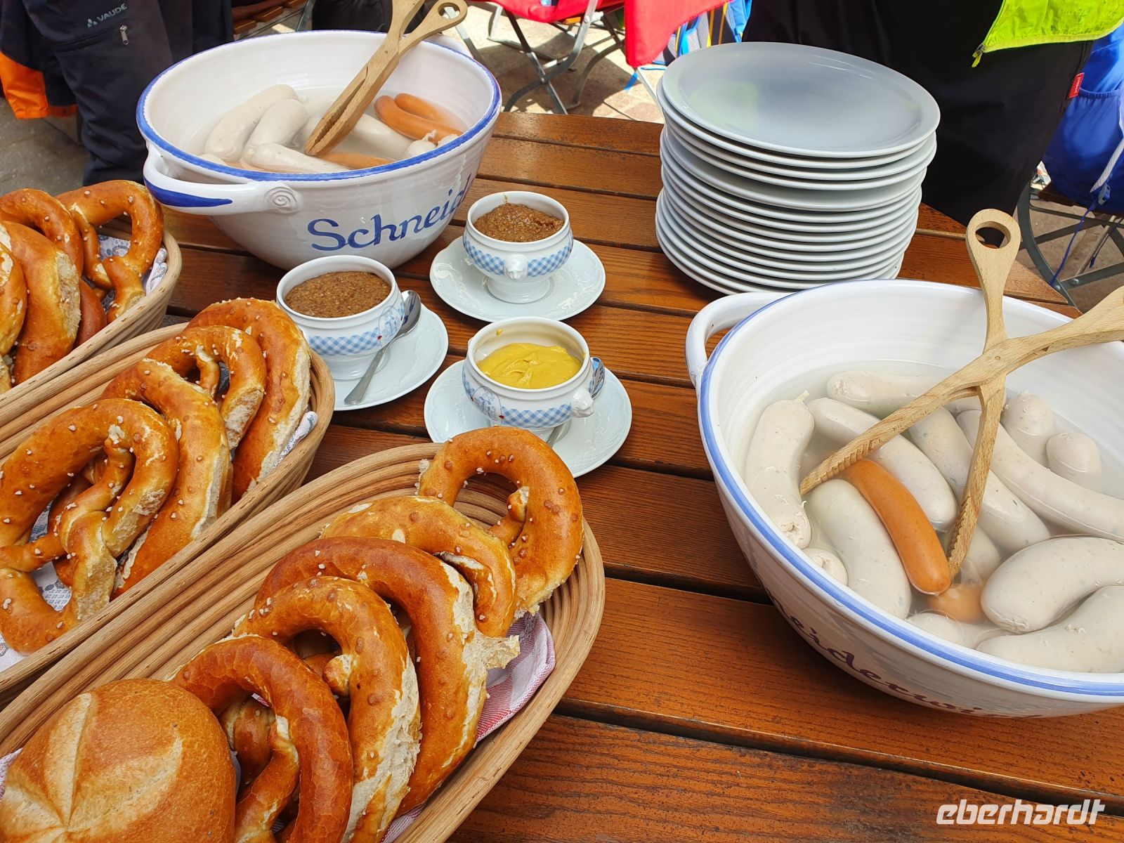 Jede Gelegenheit wurde genutzt, um endlich einmal das Gebirge in seiner vollen Pracht bestaunen zu können. Bei einem Fotostopp stärkten wir uns mit Schokolade und ein Schnäpschen. Anschließend führte uns unser Radguide weiter entlang des Inns zum Schneiderwirt. Dort erwarteten uns zwei riesige Schüsseln mit Weißwürsten und Wiener Würstchen. Herrlich! Wir konnten wunderbar schlemmen. Mit vollen Bäuchen spazierten wir durch den gemütlichen Ort und schauten uns die wunderbar geschmückten Hausfassaden an.