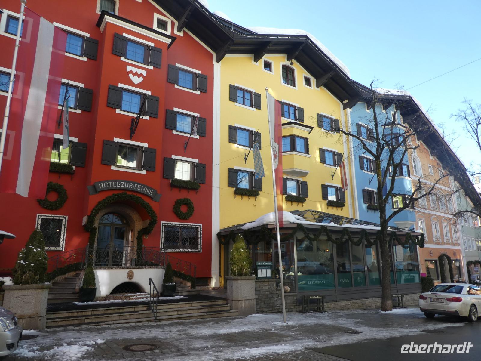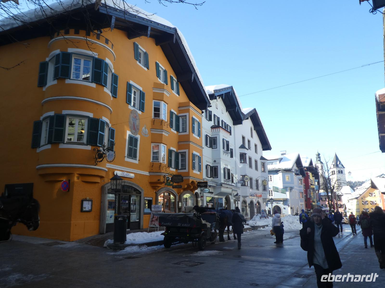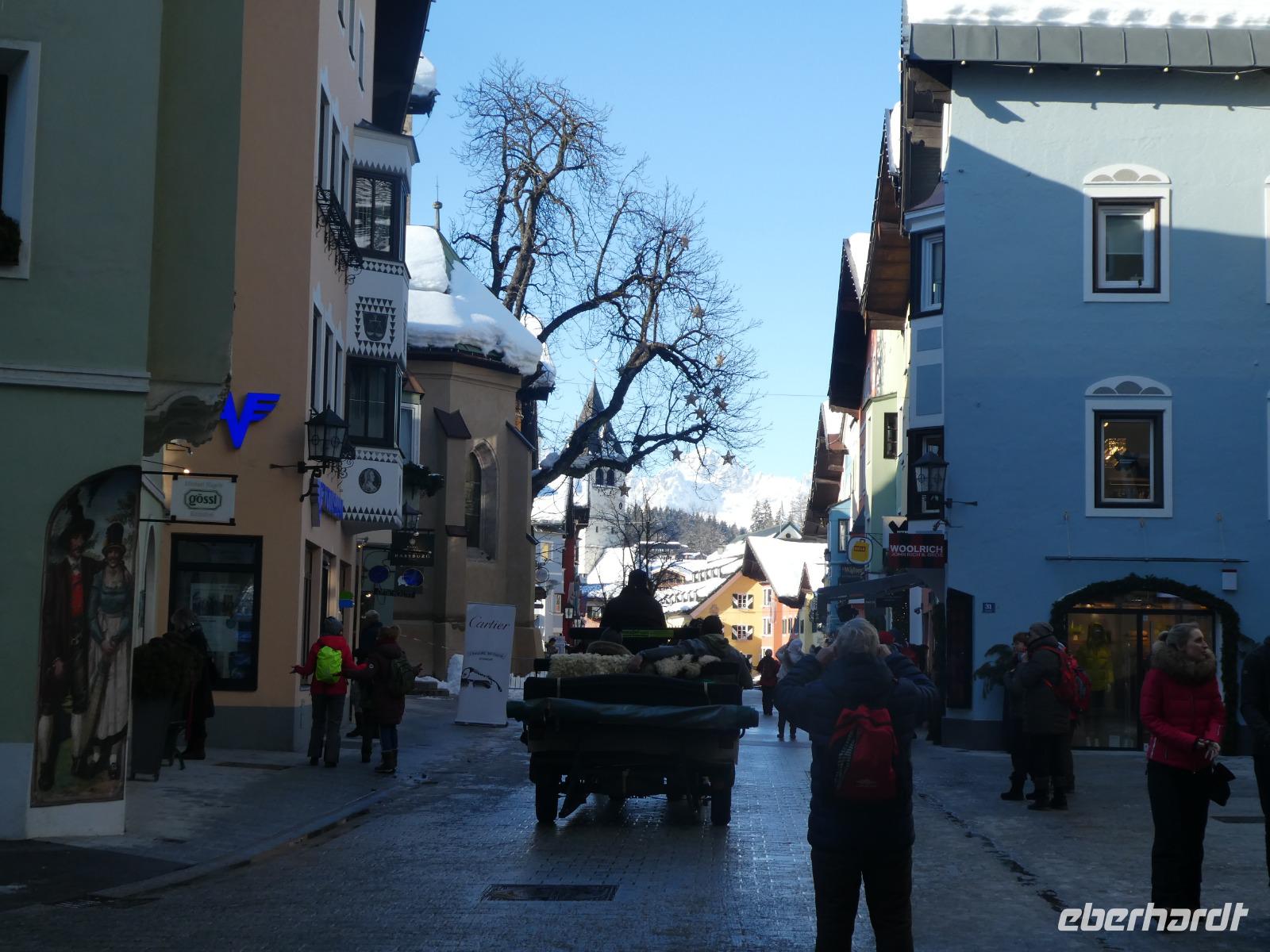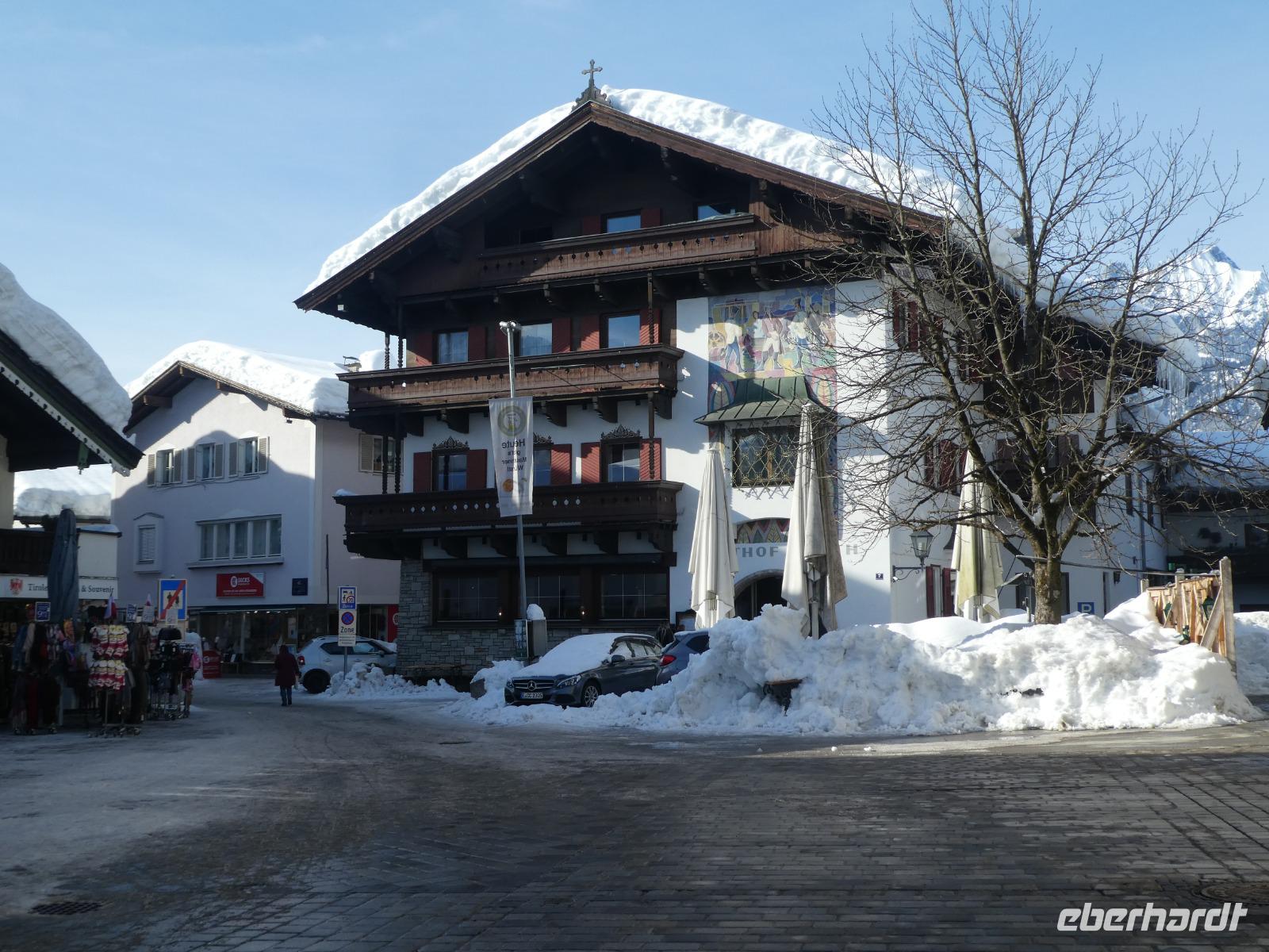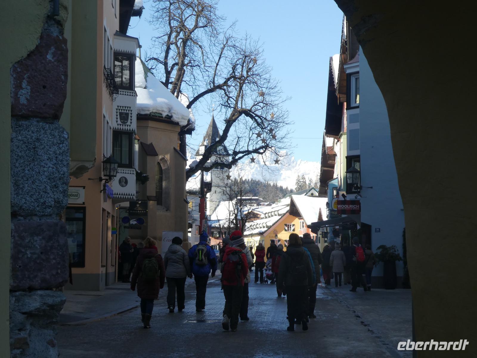 Die Wettervorhersage stimmte für heute. Ein Blick aus dem Fenster und die Sonne versuchte sich durch zusetzten. Mit dem Zug fuhren wir nach Kitzbühel zur Hahnenkammbahn und tatsächlich die Sonne und der blaue Himmel kamen zum Vorschein. Die Gondel brachte uns bequem zur Bergstation. Es erwartete uns ein Traumwetter. Der Schnee glitzerte und machte Lust auf einen schönen Spaziergang. Der Hahnenkamm ist besonders bekannt durch das berühmte Hahnenkammrennen auf der „Streif". Es ist die gefährlichste und eine der steilsten Pisten der Welt. Leider wurden noch die letzten Utensilien des Rennens mit dem Hubschrauber abgeholt. So konnten wir den Blick vom Starthaus aus nicht betrachten. Wir genossen den Blick auf das verschneite Kitzbühel und die umliegenden Berge. Gemeinsam liefen wir mit immer wieder schönen Blicken zum Berggasthof Sonnenbühel. Es war alles schön eingedeckt und man wartete auf die gut betuchten Besucher, die zu Mittag schon einen Tisch reserviert hatten. Wir ließen uns einen Glühwein oder Jagatee schmecken und setzten unseren Spaziergang fort. Es ging noch etwas bergauf und wir erreichten den Berghof. Wir kehrten ein zum Mittagessen oder ließen im Liegestuhl einfach die Seele baumeln. Anschließend erreichten wir wieder die Bergstation und fuhren zurück nach Kitzbühel. Nach einem kleinen Spaziergang erreichten wir die Altstadt und unternahmen einen Bummel oder kehrten zum Kaffeetrinken ein. Ein schöner Tag ging langsam zu Ende. Zum Abendessen kehrten wir im Gasthof Bären zum Abendessen ein.