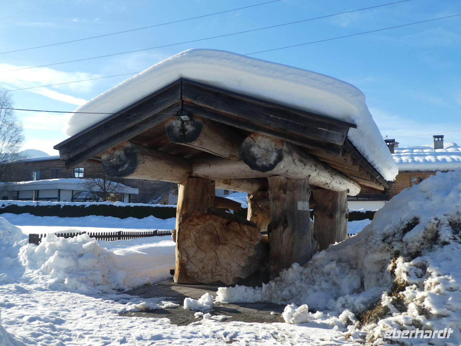 Mit dem Zug fuhren wir bequem nach Brixen im Thale. Nach einem kleinen Spaziergang durch den Ort erreichten wir die Bergbahn Hochbrixen. Mit der Gondel ging es nach oben immer mit dem Blick auf die Hohe Salve. Wir besuchten das Iglu Dorf und erhielten eine Führung. Zuerst sahen wir den „Speiseraum" der natürlich aus Eis bestand sowohl die Tische und auch die Bänke. Am Abend kann wird dort ein Fondue gereicht. Wir tauchten weiter in das innere ein und sahen verschiedene Eisskulpturen die von verschiedenen Künstlern geschaffen wurden. Jedes Jahr gibt es ein anderes Motto. Auch heiraten kann man dort. Natürlich schauten wir uns auch noch die „Schlafräume" in dem Iglu an. Dort können bis zu vier Personen pro Iglu übernachten. Nach dieser interessanten Führung holten wir uns an der Eisbar einen Glühwein. Durch die schön verschneite Landschaft spazierten wir zum Fleckalmsee und weiter zur Fleckalm wo wir einkehrten. Zurück am Iglu Dorf nutzen wir die Gelegenheit im Liegestuhl zu relaxen und die Reise Revue passieren zu lassen. Zum Abschluss unseres Urlaub wurden wir mit dem Taxi abgeholt und fuhren nach Waidring in den Alpengasthof Unterweißbach. Nach einem deftigen Essen sorgten zwei junge Musiker für Spaß und gute Laune. Ein schöner Abschluss unserer Winterreise in Tirol.
