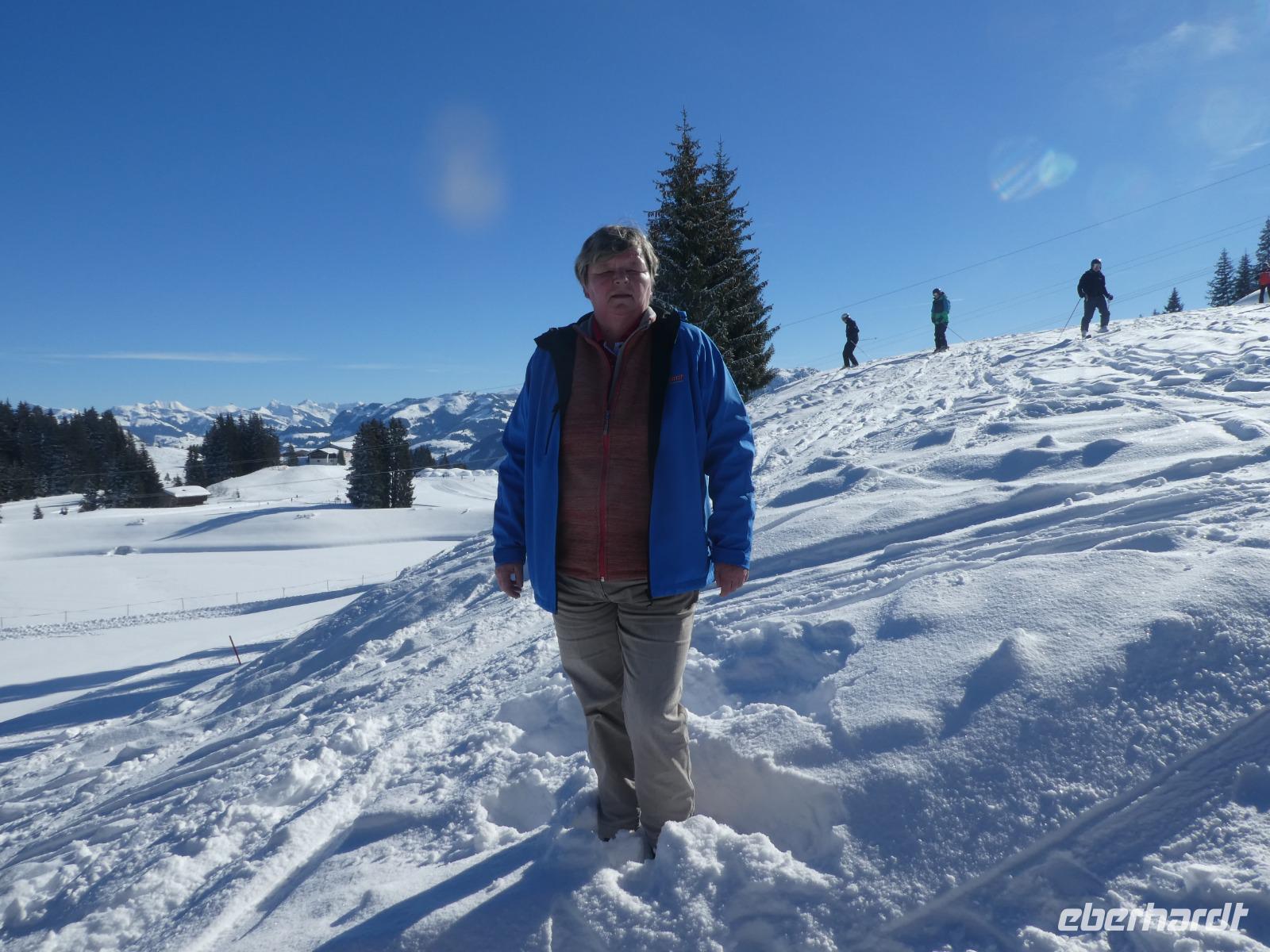 Mit dem Bus fuhren wir nach Oberndorf. An der Touristeninformation wartete schon Joseph der örtliche Reiseleiter und andere Gäste auf uns. Wir unternahmen eine wunderschöne Wanderung in das Bichlach. Dabei eröffnete sich immer wieder ein schöner Blick auf den schneebedeckten Wilden Kaiser. Wir kamen an einigen schönen Häusern vorbei so auch am ehemaligen Wohnhaus von Franz Beckenbauer. Wir erreichten den Gasthof Bichlhof und konnten die Sonne auf der Terrasse genießen. Zurück in Oberndorf kehrten wir im Gasthof Neuwirt zum Mittagessen ein. Gut gestärkt spazierten wir zum Müllnerhof. Während einer Hofführung konnten wir in einem der ältesten Bauernhöfe der Region hinter die Mauern schauen und einen Blick in den Kuhstall werfen. Wir erfuhren wissenswertes über die Arbeit auf einem Biobauernhof. Natürlich schauten wir uns auch im Hof den „Größten Holzbrunnen der Welt" an. Im Keller des Bauernhofes wurden wir mit frischem Brot belegt mit Schinken und Käse und einem Obstler empfangen. Dort befindet sich eine Destilationsanlage, ein Räucherofen und ein Holzbackofen die noch in Betrieb sind. Im Hofladen konnte gestöbert werden und dass eine oder andere wurde natürlich auch gekauft. Mit dem Zug fuhren wir zurück nach St. Johann. Von dort liefen wir zur Talstadion der Harschbichel Bergbahn. Jeden Dienstag veranstalten die Skilehrer eine interessante Ski Show. Untermalt wurde sie mit Lichteffekten und Musik. Ein schöner Abschluss eines ereignisreichen Tages.