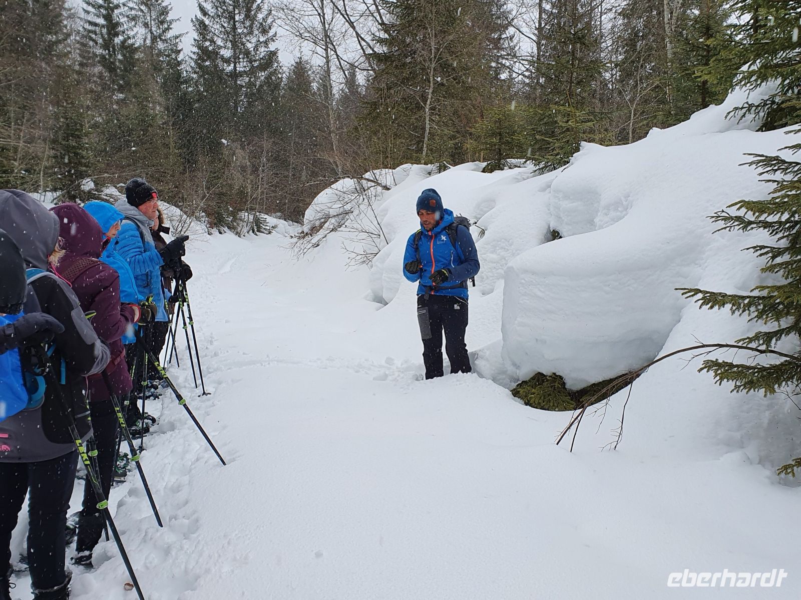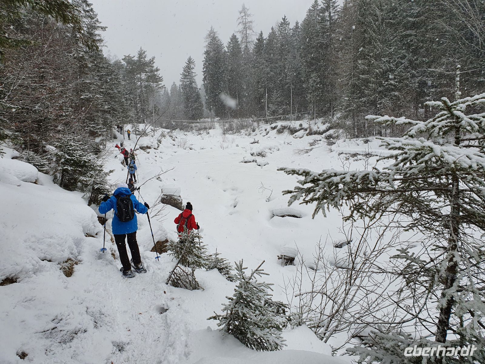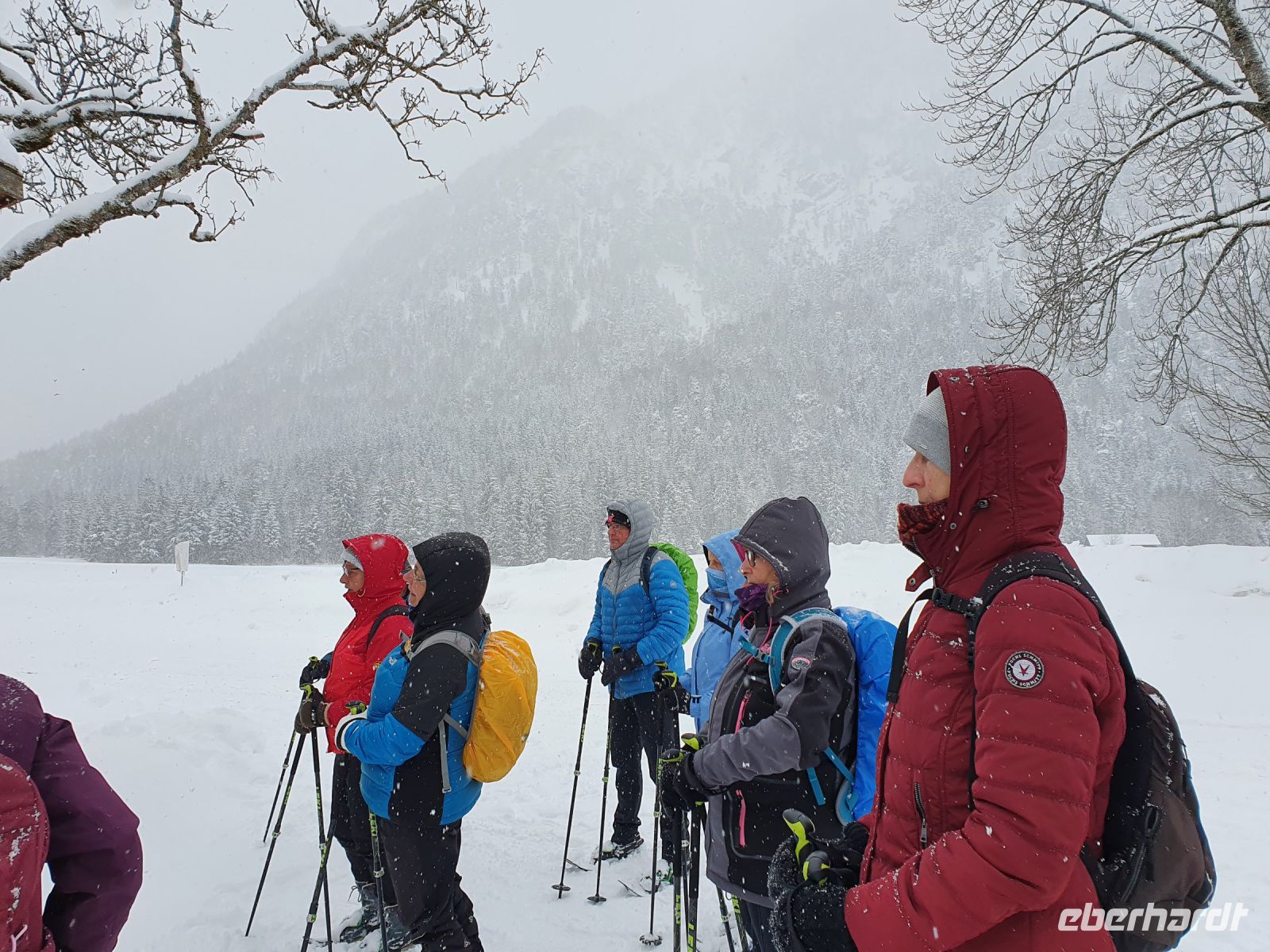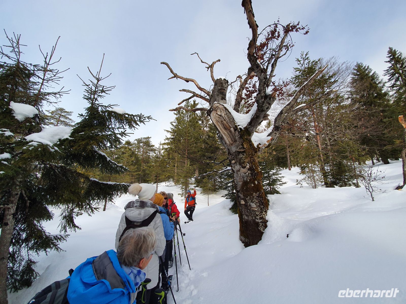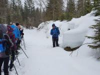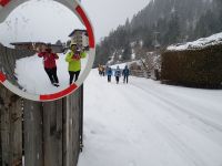 Unsere nächsten 3 Schneewanderungen begannen immer in Pertisau am Langlaufstüberl. Dorthin gelangten wir ganz bequem mit dem Linienbus und unserer Gästekarte als Ticket. Auf allen 3 Wanderungen wurden wir vom Ranger Sebastian begleitet und er hatte es besonders bei den ersten beiden Touren sehr schwer. Es schneite ununterbrochen und er musste im hohen Schnee die Spur legen für uns. Da zu dem starken Schneefall auch noch Sturm kam, gingen unsere Schneeschuhtouren oft durch den Wald, oder in geschützten Flussbetten. Es war ein unvergessliches Erlebnis, in dem frischen, hohen Schnee mit unseren Schneeschuhen unterwegs zu sein. Aber es war auch anstrengend und so kehrten wir meist nach den Touren im Langlaufstüberl ein. Unsere erste Tour führte in die Tristenau, einmal um das Gelände des Golfplatzes herum. Spuren von Wildtieren sahen wir kaum, weil sie immer gleich wieder zugeschneit wurden. Aber Sebastian konnte uns eine Fichtengallwespe zeigen und viel Interessantes zum Wald in diesem Gebiet berichten. Am Nachmittag wanderten wir ohne Schneeschuhe durch Pertisau zum Museum Vitalberg. Dort wird die Geschichte des Ölschieferabbaus sehr anschaulich erzählt. Jeder bekam ein Audiogerät und so konnten wir in aller Ruhe durch die Ausstellungsräume schlendern und am Schluss noch einen interessanten Film sehen. Auf grund des immer noch anhaltenden Schneefalls wurde es bald dunkel und so konnten wir im Zentrum von Pertisau noch die großen beleuchteten Figuren bestaunen. Dann gings mit dem Bus zurück nach Achenkirch und zum Abendessen in unserer Sportpension Geissler.