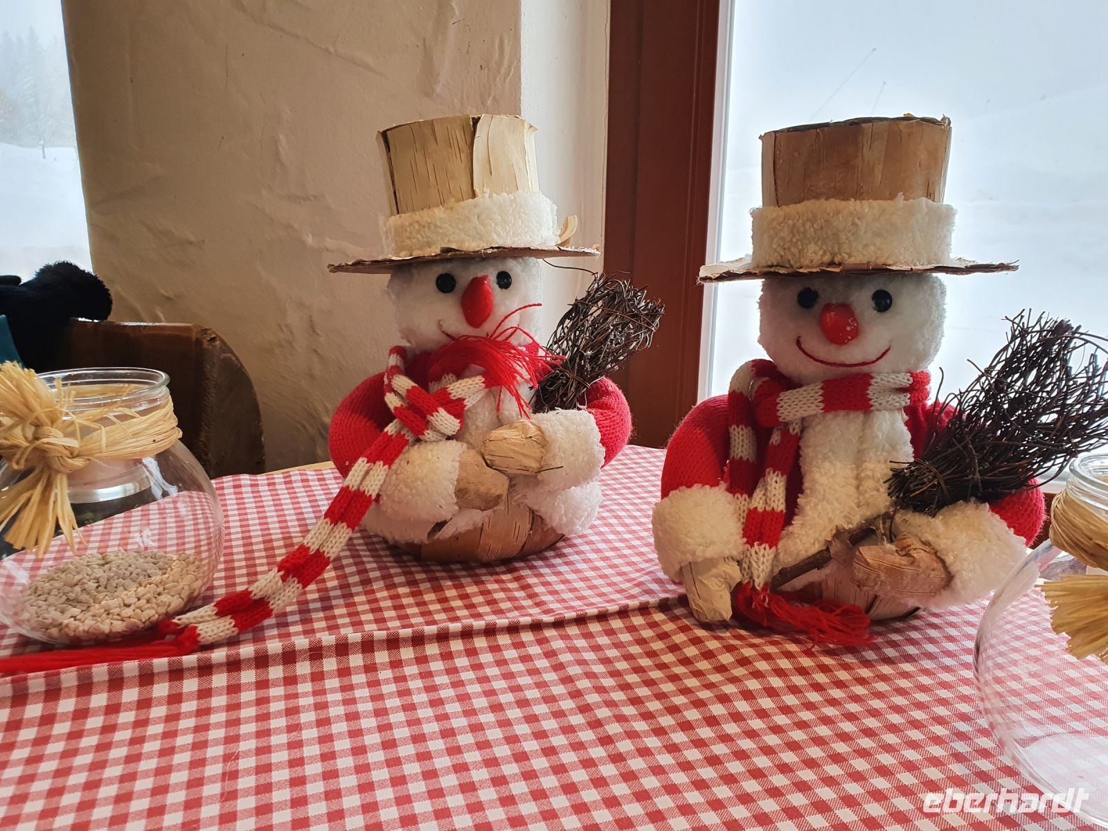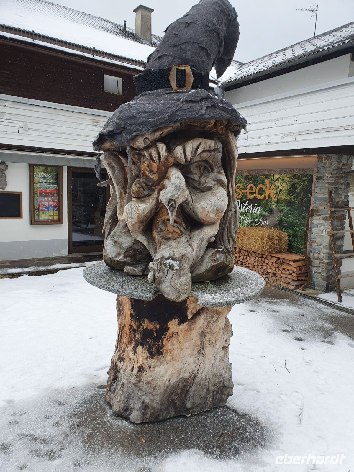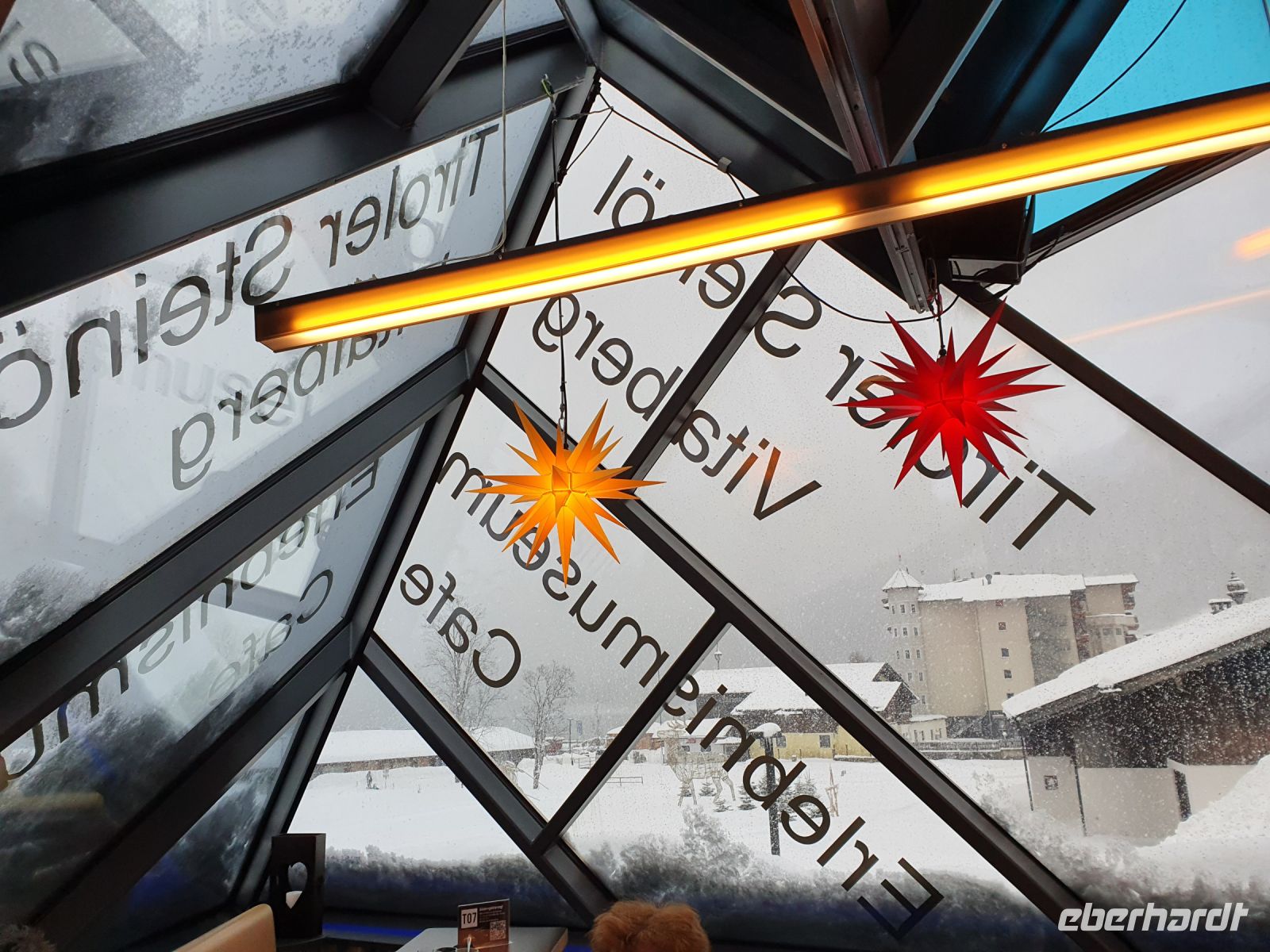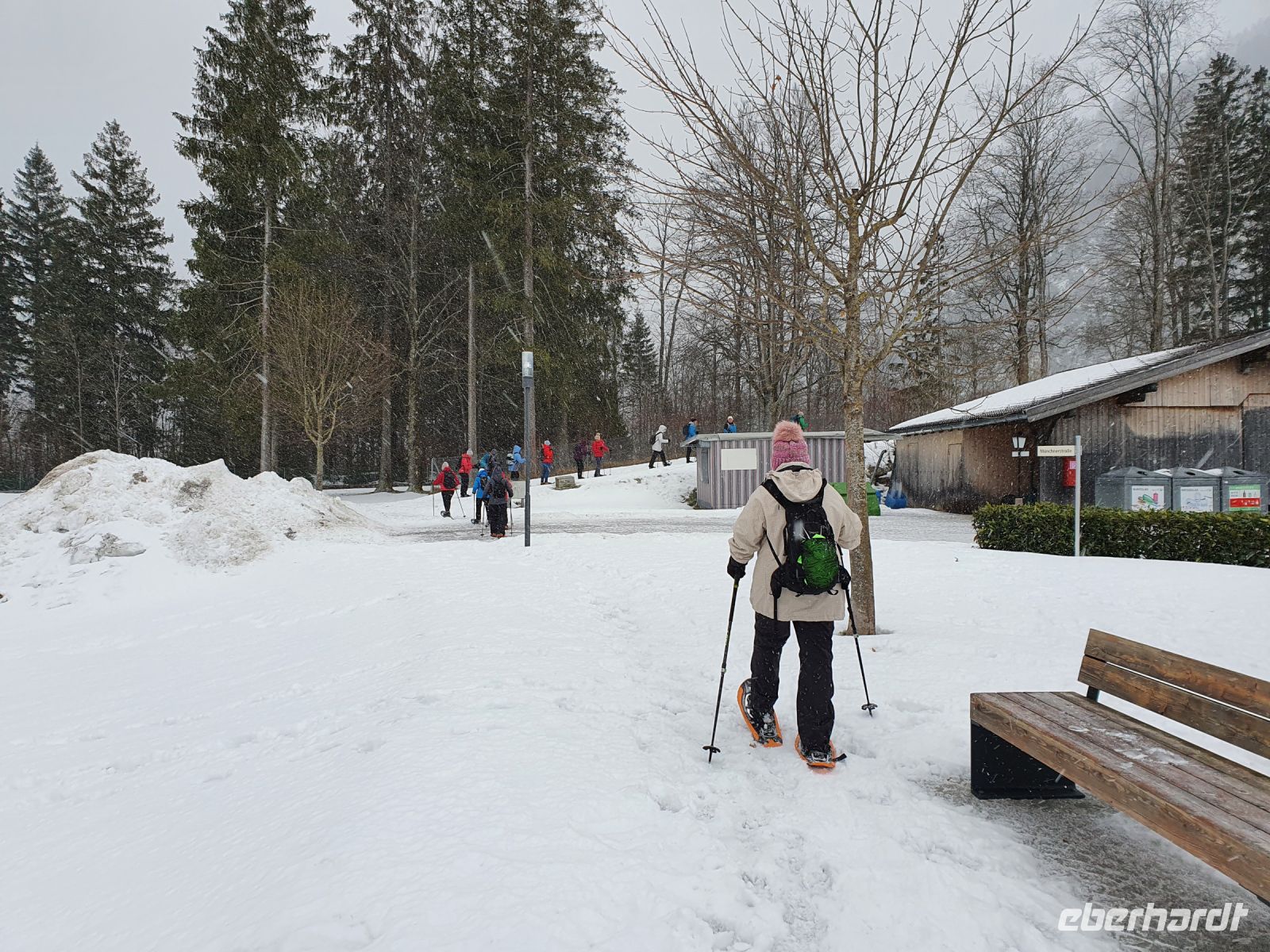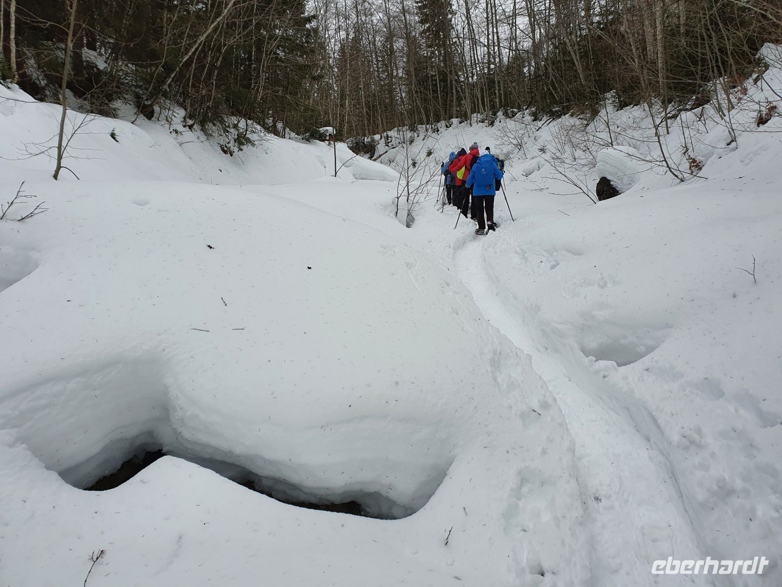 Unsere nächsten 3 Schneewanderungen begannen immer in Pertisau am Langlaufstüberl. Dorthin gelangten wir ganz bequem mit dem Linienbus und unserer Gästekarte als Ticket. Auf allen 3 Wanderungen wurden wir vom Ranger Sebastian begleitet und er hatte es besonders bei den ersten beiden Touren sehr schwer. Es schneite ununterbrochen und er musste im hohen Schnee die Spur legen für uns. Da zu dem starken Schneefall auch noch Sturm kam, gingen unsere Schneeschuhtouren oft durch den Wald, oder in geschützten Flussbetten. Es war ein unvergessliches Erlebnis, in dem frischen, hohen Schnee mit unseren Schneeschuhen unterwegs zu sein. Aber es war auch anstrengend und so kehrten wir meist nach den Touren im Langlaufstüberl ein. Unsere erste Tour führte in die Tristenau, einmal um das Gelände des Golfplatzes herum. Spuren von Wildtieren sahen wir kaum, weil sie immer gleich wieder zugeschneit wurden. Aber Sebastian konnte uns eine Fichtengallwespe zeigen und viel Interessantes zum Wald in diesem Gebiet berichten. Am Nachmittag wanderten wir ohne Schneeschuhe durch Pertisau zum Museum Vitalberg. Dort wird die Geschichte des Ölschieferabbaus sehr anschaulich erzählt. Jeder bekam ein Audiogerät und so konnten wir in aller Ruhe durch die Ausstellungsräume schlendern und am Schluss noch einen interessanten Film sehen. Auf grund des immer noch anhaltenden Schneefalls wurde es bald dunkel und so konnten wir im Zentrum von Pertisau noch die großen beleuchteten Figuren bestaunen. Dann gings mit dem Bus zurück nach Achenkirch und zum Abendessen in unserer Sportpension Geissler.
