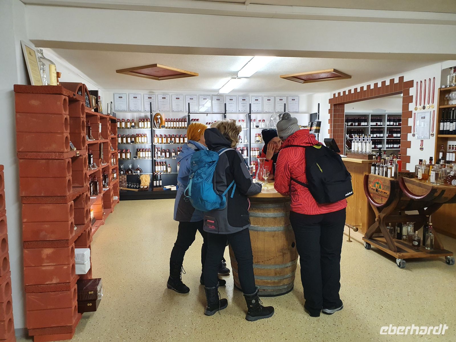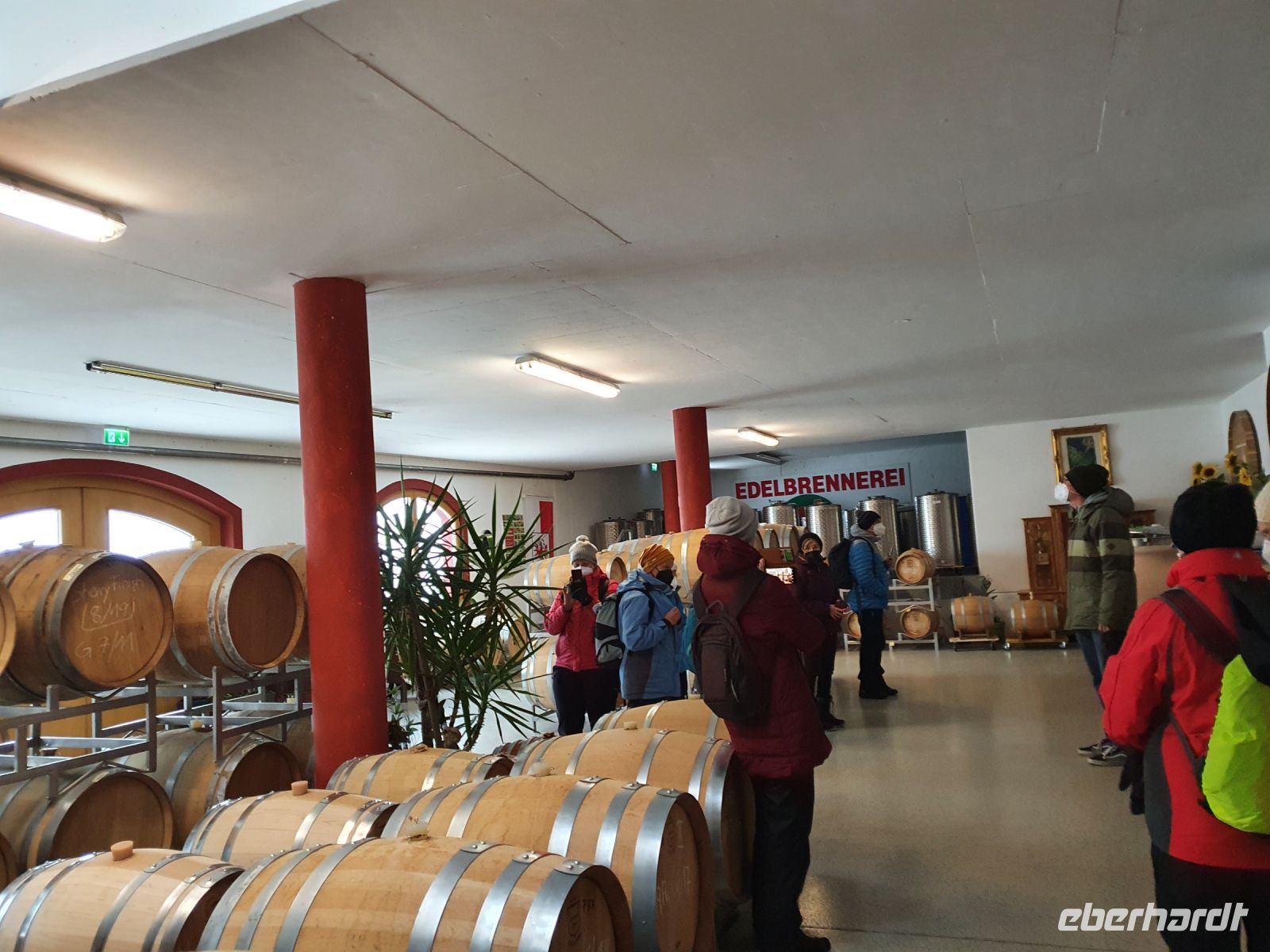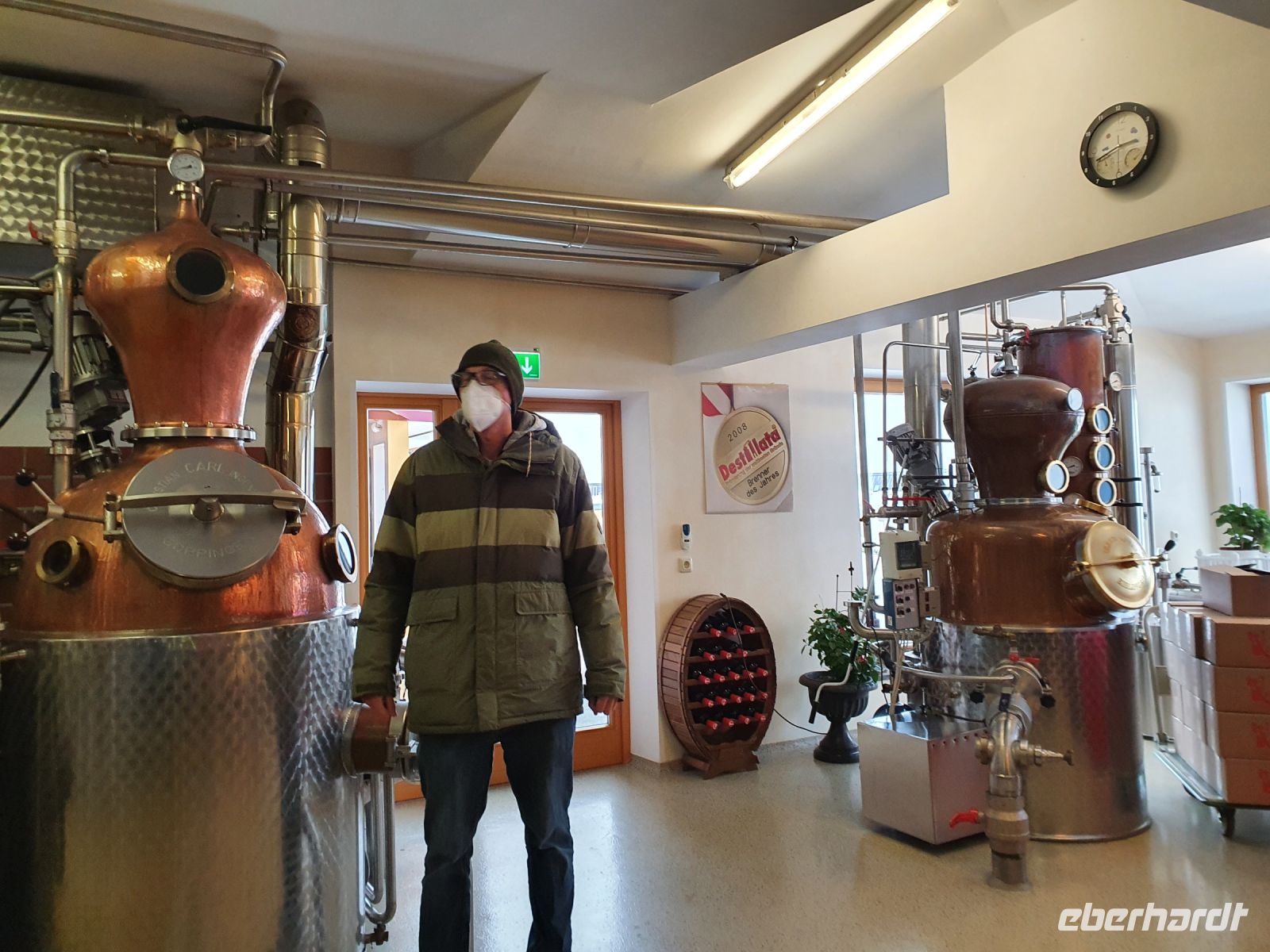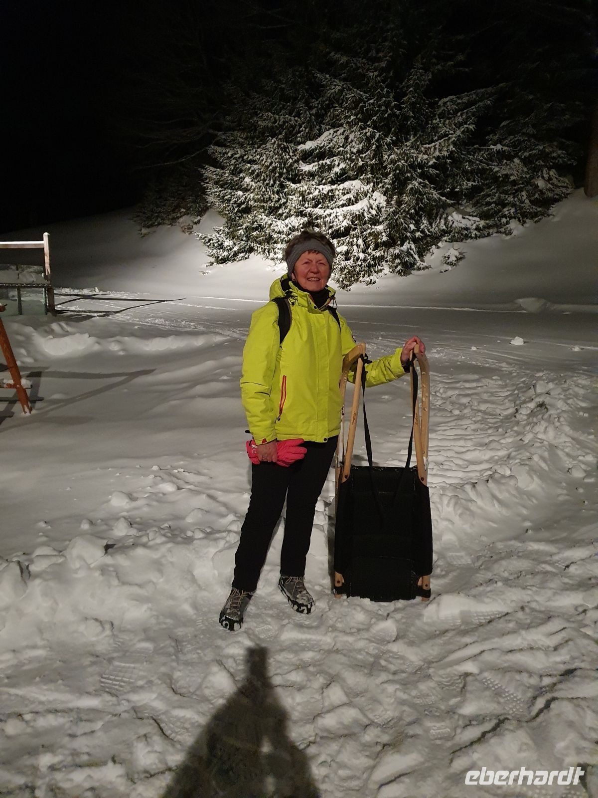Es schneite immer noch, als wir wieder zu unserer Schneeschuhwanderung ab Pertisau aufbrachen. Inzwischen hatte man einige Täler wegen Lawinengefahr gesperrt. Sebastian war immer sehr gut informiert, wo unbeschwertes Gehen möglich war und so führte er uns im Flussbett des Falzthurnbaches bergauf. Wieder ging es durch sehr hohen frischen Schnee und diesmal lernten wir die Hochwasserschutzeinrichtungen im Bachbett kennen. Auch zeigte uns Sebastian das "Werk" eines Schwarzspechtes und berichtete von der langen Zunge dieser Vögel und wie sie so die Schädlinge aus dem Baum "bergen" können. Nach einer kurzen Stärkung fuhren wir mit dem Bus nach Maurach und besuchten dort die Edelbrennerei Kostenzer. Der Junior Chef führte uns zu den Brennanlagen und in den Keller, wo zahlreiche Fässer lagerten. Danach probierten wir die edlen Brände und Liköre. Und ja, der Unterschied zu den im Supermarkt gekauften Spirituosen wird zu erschmecken. Aber diese Brände hatten auch einen anderen, höheren Preis. Recht beschwingt gings dann zurück zur Bushaltestelle und mit dem Bus nach Achenkirch. Da hatten wir kurz Zeit zum Umziehen und/oder Ausruhen und kurz vor 18 Uhr brachen wir auf zu Fuss zur Talstation der Christlum Lifte. Ich nahm die vorbestellten Schlitten in Empfang und löste die Tickets - nachdem wieder alle Impfpässe kontrolliert waren - und dann gings auch schon hinauf zum Christlum. Fast alle hatten einen Schlitten dabei, nur 4 entschieden sich, auch bergab doch lieber wieder dem Sessellift zu nehmen. In der Christlumalm stärkten wir uns bei einem zünftigen Abendessen und dann wurde es ernst. 4 wanderten wieder hinauf zur Bergstation des Lifts und alle mit Schlitten fuhren die 3,5 km lange Rodelstrecke hinunter ins Tal. Es war ein toller Spass und Gott sei Dank waren nicht zu viele Rodler unterwegs. Wir gaben die Schlitten zurück und spazierten zurück zum Hotel.
