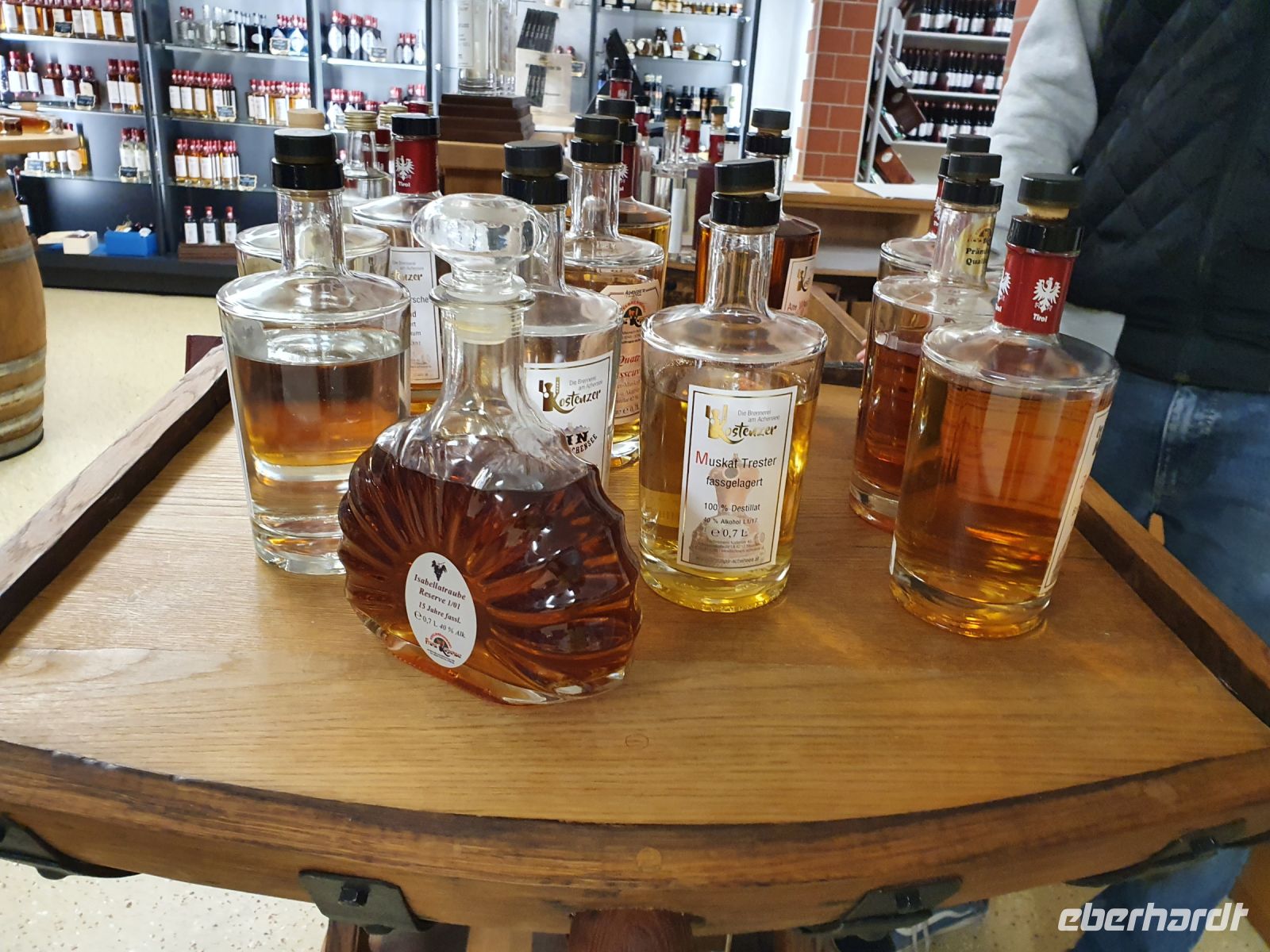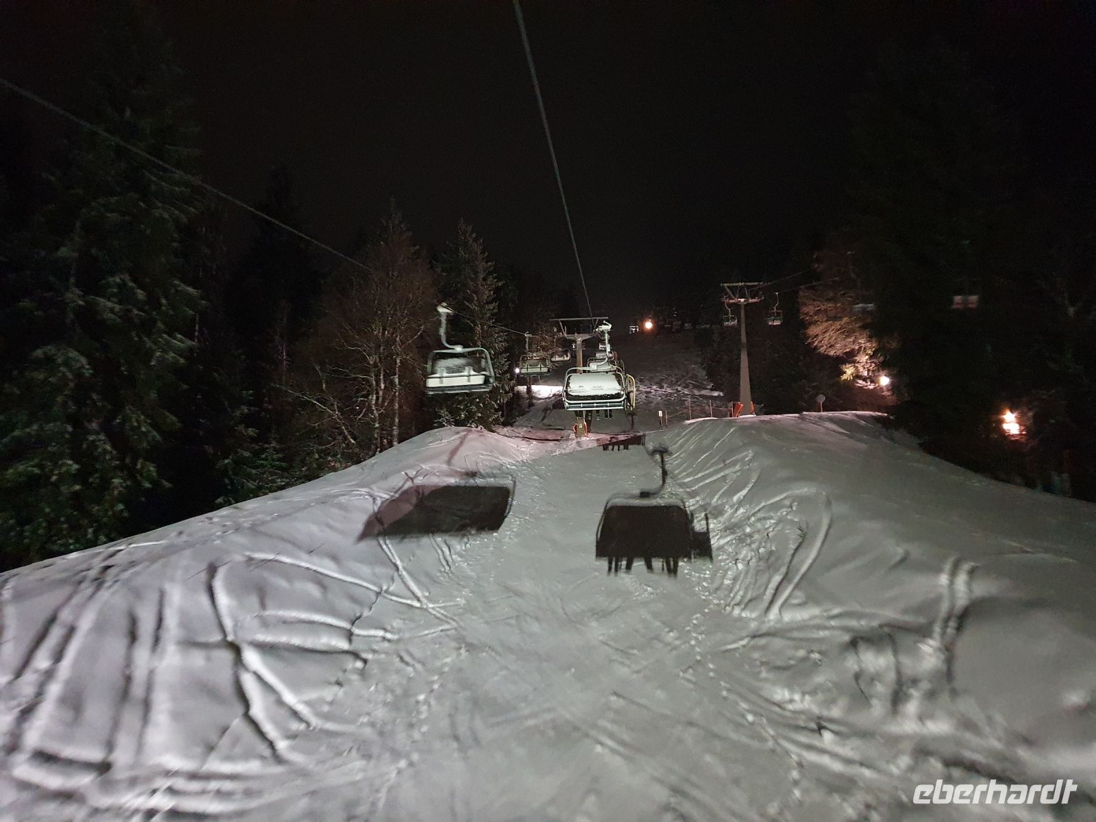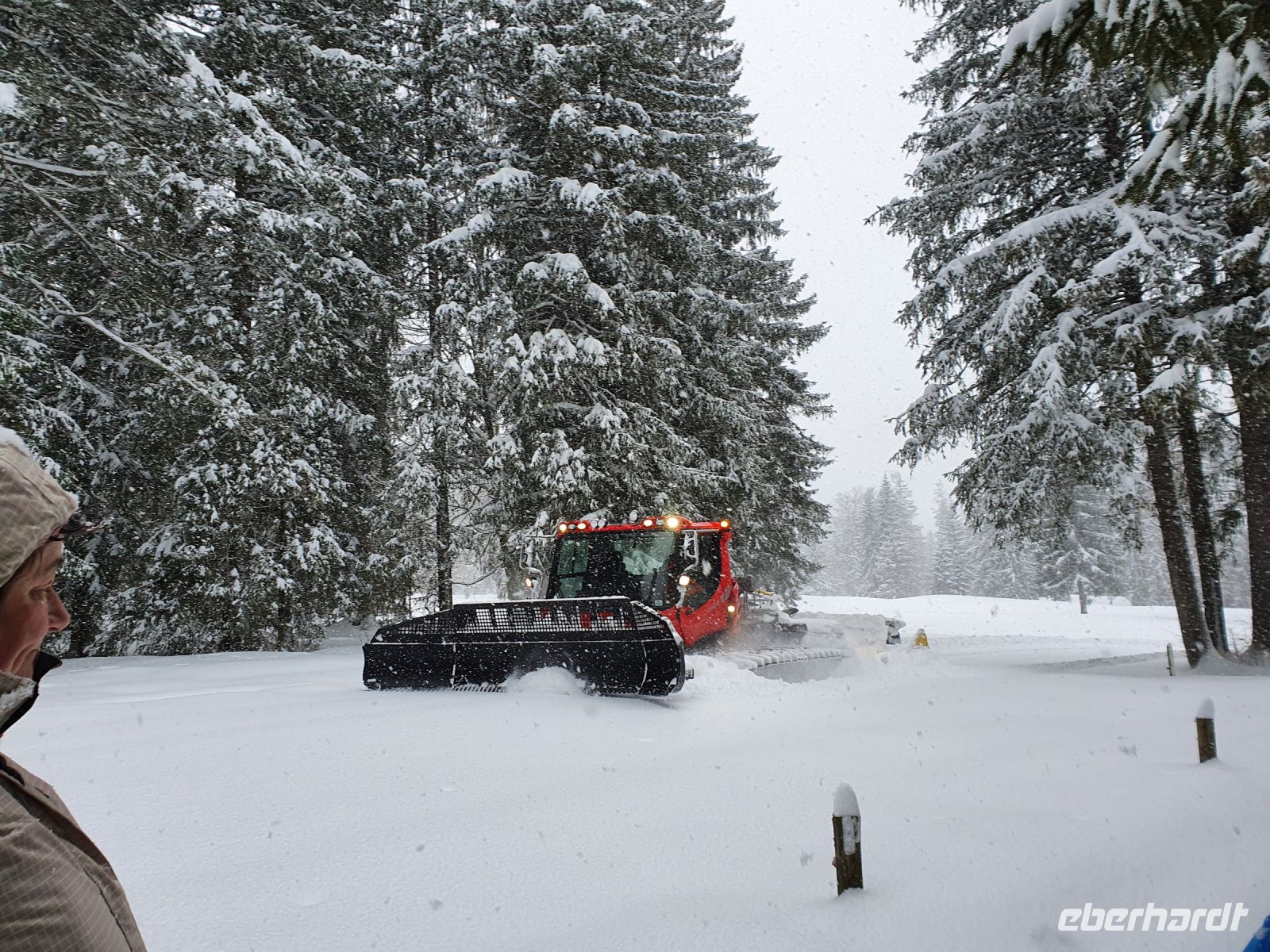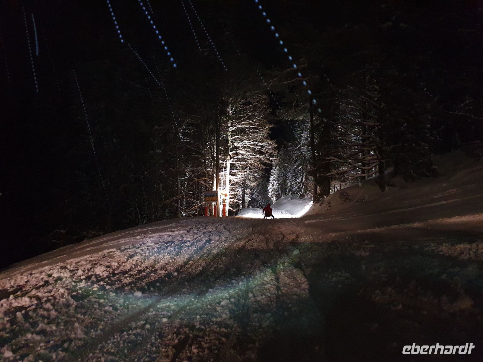 Es schneite immer noch, als wir wieder zu unserer Schneeschuhwanderung ab Pertisau aufbrachen. Inzwischen hatte man einige Täler wegen Lawinengefahr gesperrt. Sebastian war immer sehr gut informiert, wo unbeschwertes Gehen möglich war und so führte er uns im Flussbett des Falzthurnbaches bergauf. Wieder ging es durch sehr hohen frischen Schnee und diesmal lernten wir die Hochwasserschutzeinrichtungen im Bachbett kennen. Auch zeigte uns Sebastian das "Werk" eines Schwarzspechtes und berichtete von der langen Zunge dieser Vögel und wie sie so die Schädlinge aus dem Baum "bergen" können. Nach einer kurzen Stärkung fuhren wir mit dem Bus nach Maurach und besuchten dort die Edelbrennerei Kostenzer. Der Junior Chef führte uns zu den Brennanlagen und in den Keller, wo zahlreiche Fässer lagerten. Danach probierten wir die edlen Brände und Liköre. Und ja, der Unterschied zu den im Supermarkt gekauften Spirituosen wird zu erschmecken. Aber diese Brände hatten auch einen anderen, höheren Preis. Recht beschwingt gings dann zurück zur Bushaltestelle und mit dem Bus nach Achenkirch. Da hatten wir kurz Zeit zum Umziehen und/oder Ausruhen und kurz vor 18 Uhr brachen wir auf zu Fuss zur Talstation der Christlum Lifte. Ich nahm die vorbestellten Schlitten in Empfang und löste die Tickets - nachdem wieder alle Impfpässe kontrolliert waren - und dann gings auch schon hinauf zum Christlum. Fast alle hatten einen Schlitten dabei, nur 4 entschieden sich, auch bergab doch lieber wieder dem Sessellift zu nehmen. In der Christlumalm stärkten wir uns bei einem zünftigen Abendessen und dann wurde es ernst. 4 wanderten wieder hinauf zur Bergstation des Lifts und alle mit Schlitten fuhren die 3,5 km lange Rodelstrecke hinunter ins Tal. Es war ein toller Spass und Gott sei Dank waren nicht zu viele Rodler unterwegs. Wir gaben die Schlitten zurück und spazierten zurück zum Hotel.