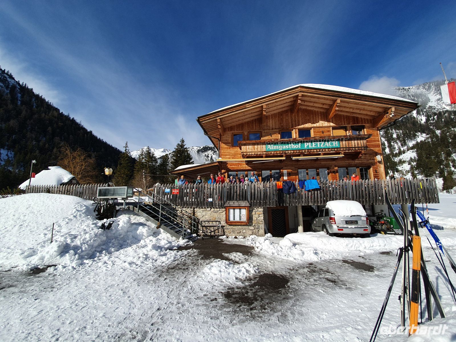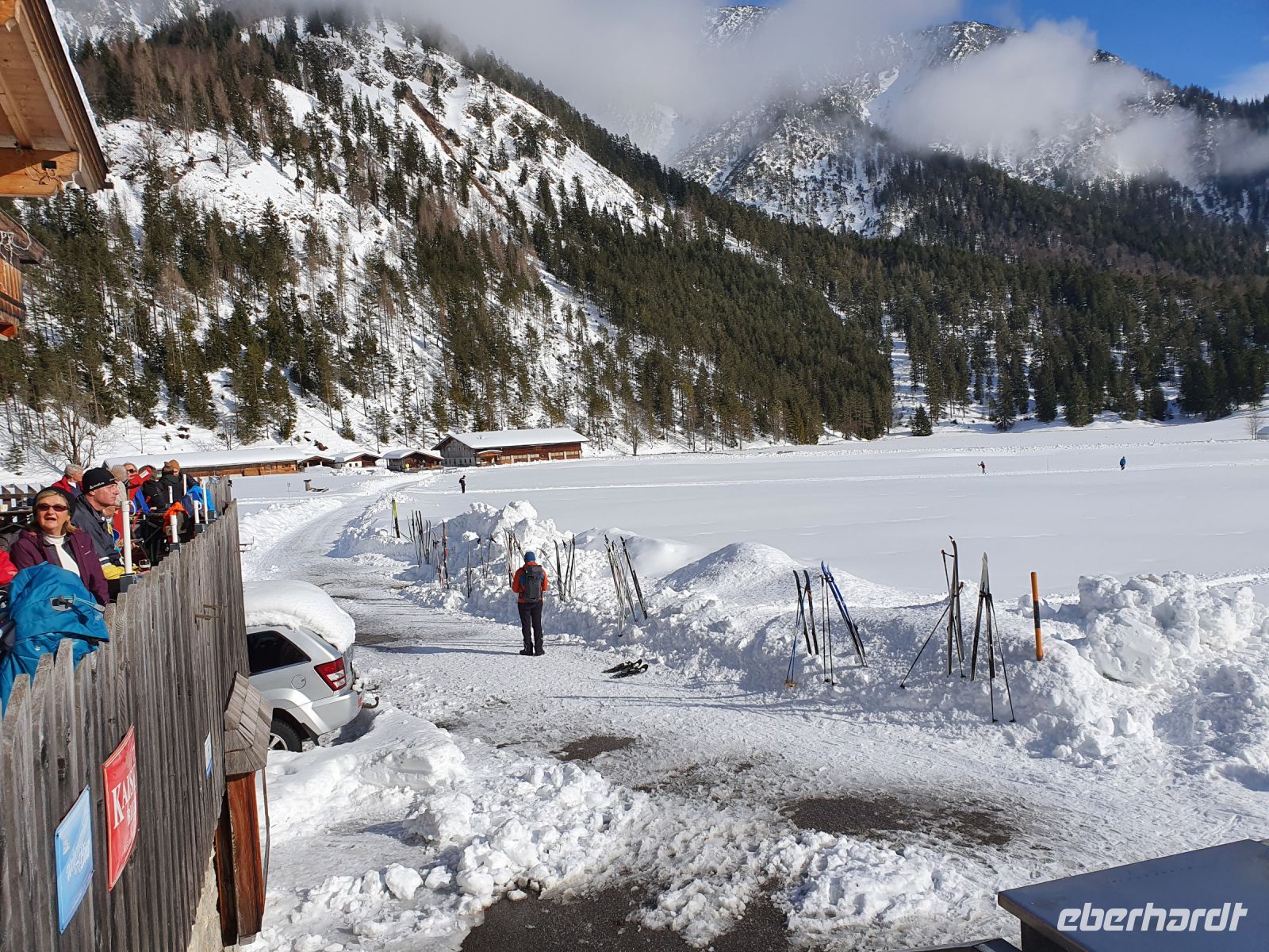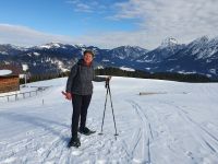 Schon der erste Blick am Morgen aus dem Fenster liess unsere Herzen höher schlagen. Es schneite nicht mehr und die Sonne vertrieb den Nebel aus dem Tal. Noch einmal nahmen wir den Bus nach Pertisau und dort erwartete uns Sebastian zu unserer letzten gemeinsamen Tour. Bei Sonnenschein waren auch deutlich mehr Menschen unterwegs mit Langlaufski, zu Fuss und wir wieder mit Schneeschuhen. Die heutige Tour war deutlich länger und ging auch schon mal bergan und bergab durch den Wald im Pletzachtal. Sebastian berichtete über die Fütterung der Wildtiere. Unser Ziel war die Pletzachalm, wo wir einkehrten und in der Sonne auf der Terrasse sassen. Zurück gingen wir unten im Flussbett des Pletzbaches und wieder zurück in Pertisau verabschiedeten wir uns von Sebastian und dankten ihm herzlich für seine Mühen im hohen Schnee und die vielen interessanten Informationen. Danach kehrten wir im Langlaufstüberl ein auf eine ausgiebige Jause. Wieder mit dem Bus fuhren wir zurück nach Achenkirch und nahmen unser Abendessen in der Sportpension Geissler ein.