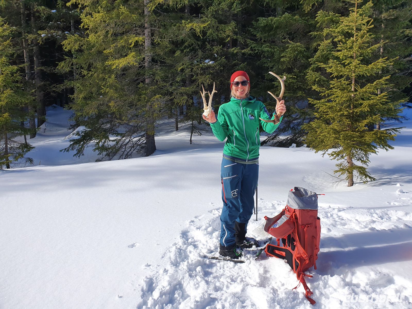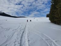 Bei unseren Schneeschuhwanderungen hatten wir das Pensum von Tag zu Tag gesteigert und heute nun folgte zum Abschluss unsere "Königsetappe". Nach dem Frühstück fuhren wir mit dem Bus gen Norden ans Ende von Achenkirch und dort startete am Wanderparkplatz Falkenmoos unsere Schneeschuhtour. Diesmal waren wir nur 9 Singles und Marina unsere Rangerin für die Tour. Wir hatten Übung und so ruckzuck unsere Schneeschuhe angelegt und schon gings steil bergan über den ersten Skihang. Weiter führte der Weg durch den Wald und auf einer Lichtung gab es die letzte Lektion zu den Wildtieren. Zur Demonstration hatte Marina das Geweih eines Hirsches, das Geweih eines Rehbocks sowie die Hörner von Gemsen dabei. Auch Füsse dieser Tiere und ihre Losungen konnten wir bestaunen. Dann gingen wir weiter und bald kam der letzte steile Hang in Sicht, den wir in großen Schleifen hinauf stiegen. Mit den Schneeschuhen anden Füssen, machte das richtig Spass, denn man rutschte nicht zurück und kam so gut voran. Endlich oben an der Falkenmoosalm wurden wir mit einer grandiosen Aussicht belohnt und natürlich gab es auch wieder etwas hochprozentiges und Trockenobst dazu. Nach vielen Fotos stiegen wir wieder bergab und waren glücklich über diesen gelungenen letzten Tag mit Schneeschuhen. AmParkplatz verabschiedetn wir uns von Marina und auch Lisa, die parallel mit einer anderen Gruppe unterwegs war. Wir wanderten ein Stück durch Achenkirch und fuhren weiter mit dem Bus zu unserem Hotel. Zuvor besuchten wir ein Sportgeschäft. Nun musste der Koffer gepackt werden und 18 Uhr trafen wir uns zum letzten gemeinsamen Abendessen.
