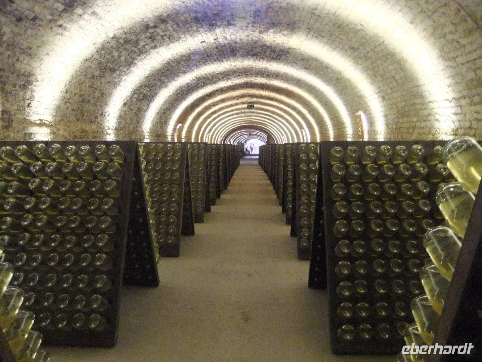 Am Nachmittag steht noch eine Führung durch die Schlumberger Kellerwelten auf dem Programm. Dabei begeben wir uns auf eine Reise von der Traube bis zum prickelnden Mousseux im Glas. Wir erfahren, was die Begriffe Degorgieren und Dosage bedeuten, und können einem „Rüttler" bei der Arbeit zusehen. Dann gibtt es für alle noch Gläschen „Schlumberger".