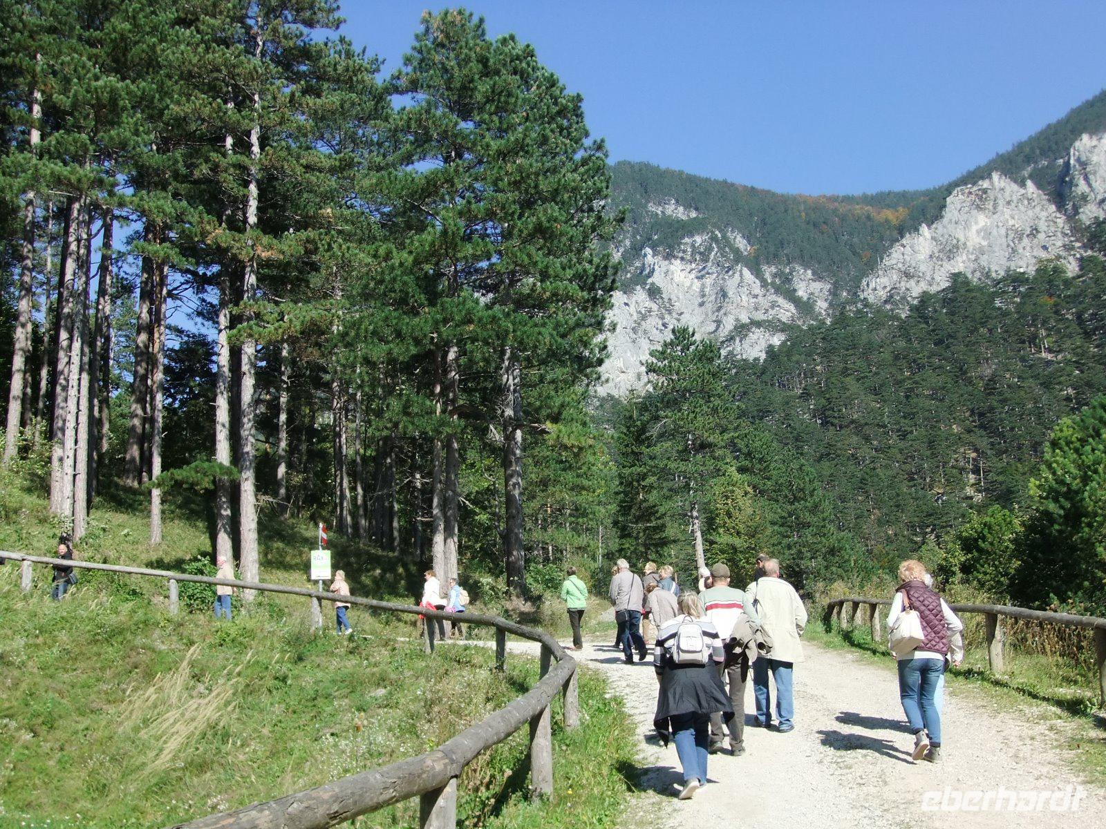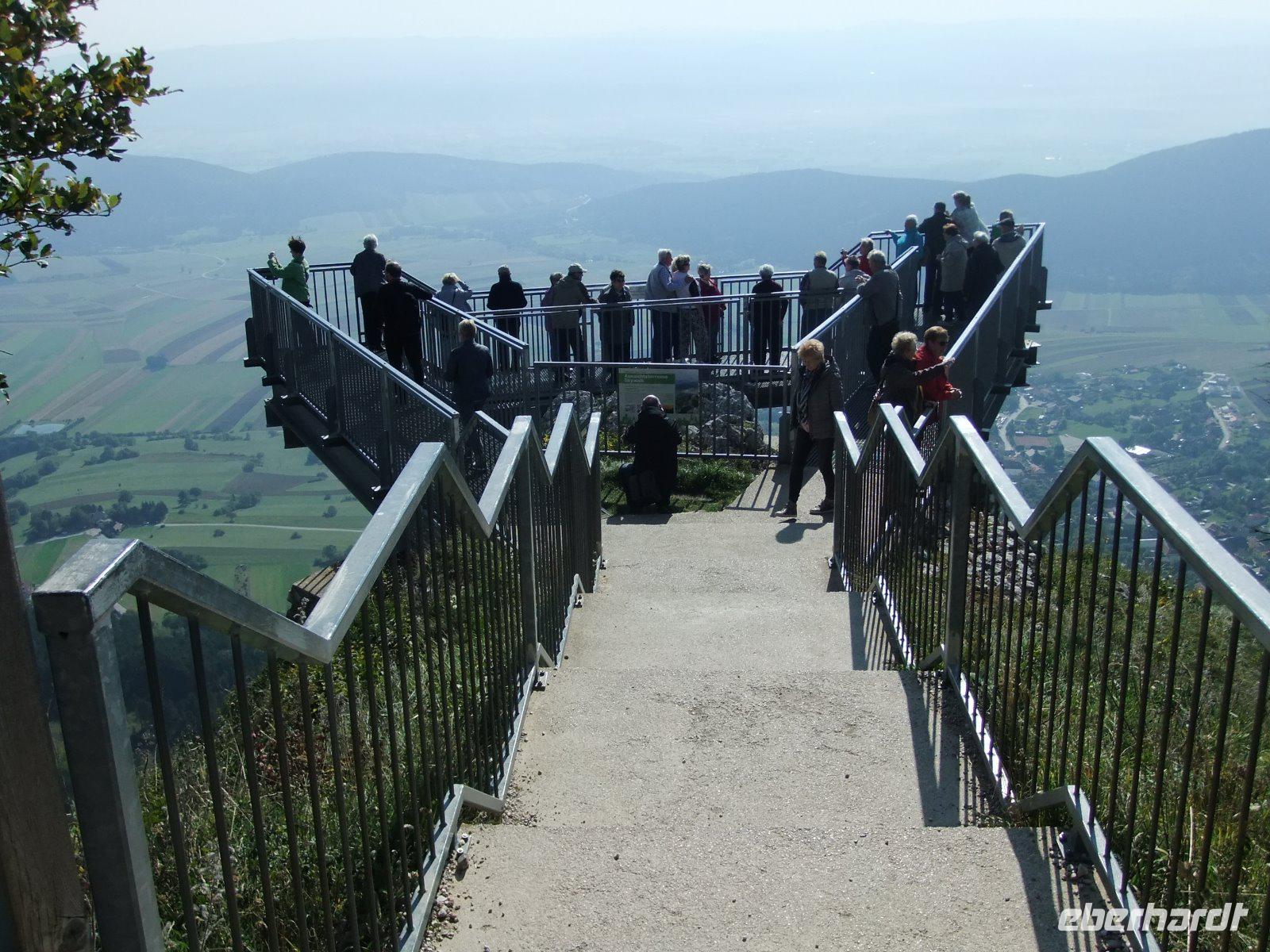 Heute wollen wir gleich zwei Berge „erklimmen". Die „Hohen Wand" ist unser erstes Ziel. Es handelt sich dabei um ein Bergmassiv, für das die steilen Felsabbrüche auf der Südseite namensgebend sind. Wir erreichen dieses Gebirgsmassiv über eine Straße mit engen Kehren. Oben angekommen, spazieren einige Gäste zum Wildgehege und beobachten die Hirsche, die allerdings recht müde sind. Die anderen Gäste gehen zum Aussichtsturm. Von dort kann man sogar die Miesenbacher Kirche sehen. Danach treffen wir uns am Streichelgehege bei den Alpakas wieder. Unser nächstes Ziel ist der Skywalk. 120 Meter über dem Boden wandeln wir auf dieser spektakulären Aussichtsterrasse. Unter uns der Abgrund, über uns die Gleitschirmflieger - ein schönes Erlebnis.