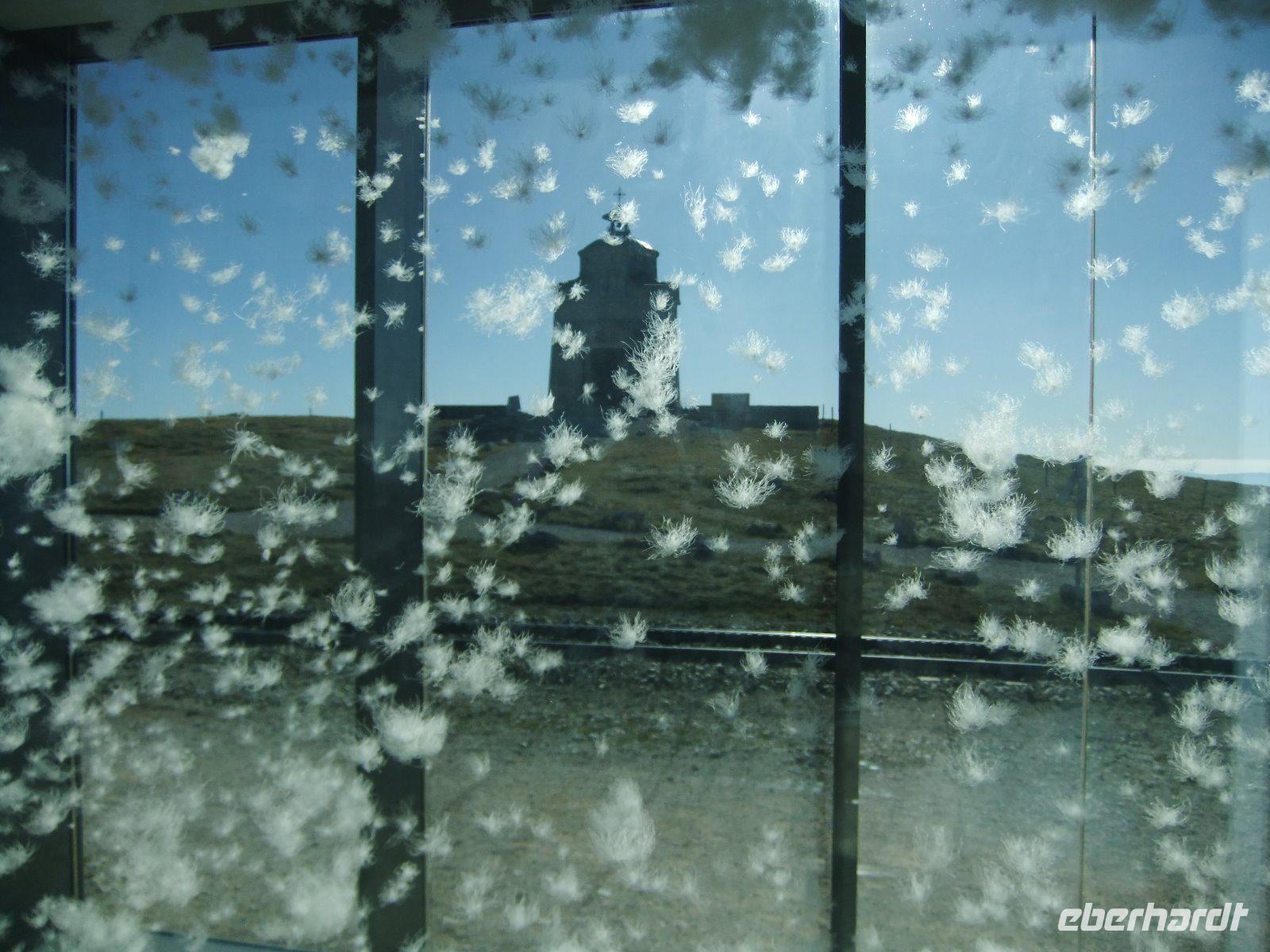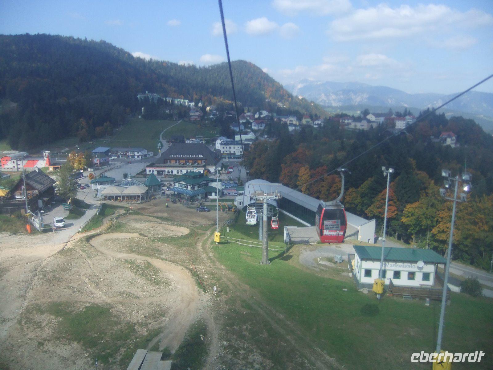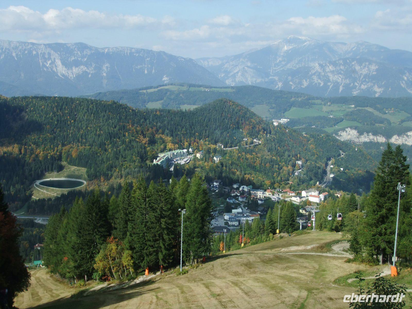 Weiter geht es zum Semmering und damit an die Grenze zwischen Niederösterreich und der Steiermark. Hier befindet sich die Talstation zum Hirschenkogel, den man auch „Zauberberg" nennt. Zunächst stärken wir uns am Bus mit Würstchen und Kartoffelbrei. Mit der Kabinenbahn fahren wir dann auf 1340 m Höhe. Die meisten Gäste steigen noch auf den hölzernen Aussichtsturm, von wo man einen besonders schönen Blick auf den Schneeberg und die Raxalpe genießt.