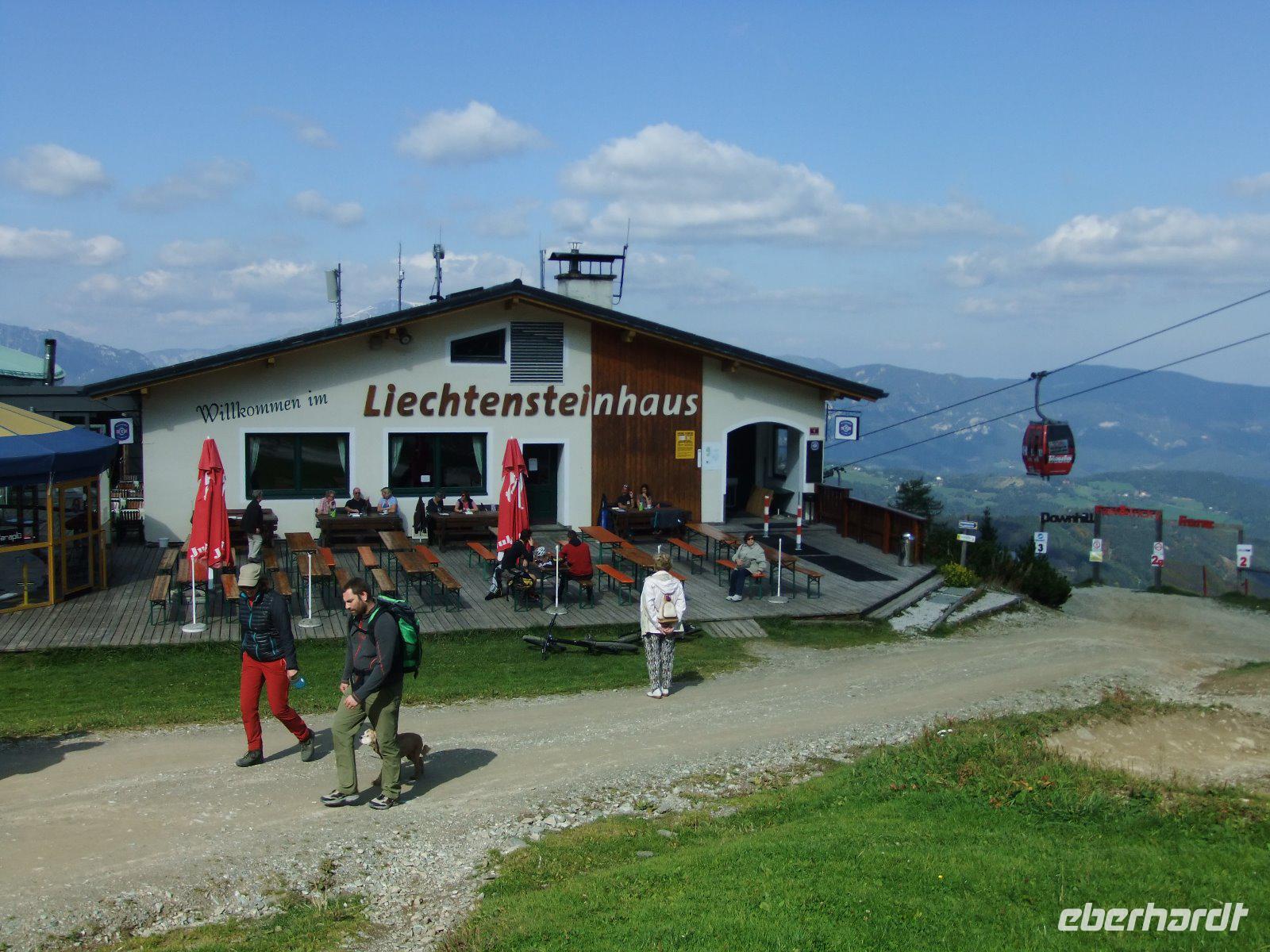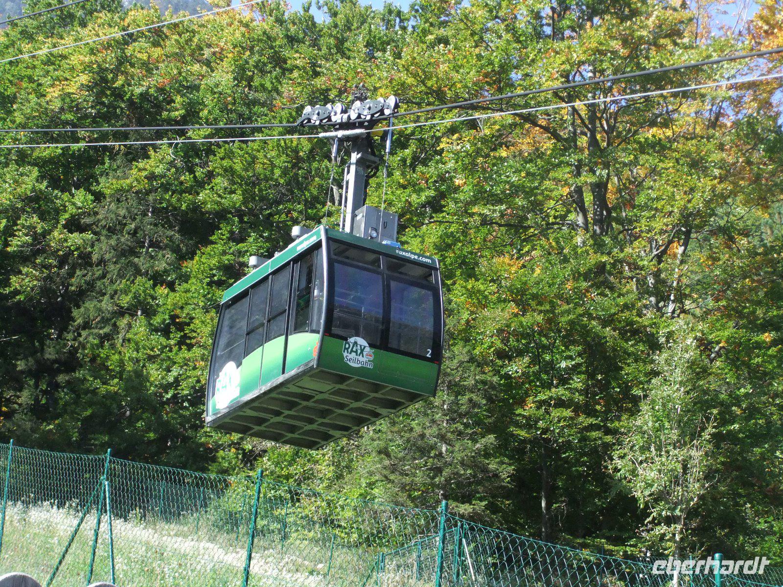 Nun wollen wir mit der Seilbahn noch auf die Raxalpe. Dafür brauchen wir acht Minuten, legen dabei 2160 Meter zurück, wobei die größte Entfernung zwischen Gondel und Boden 60 Meter beträgt. In 1546 m Höhe machen die meisten Gäste erst einmal Mittagspause auf der Terrasse des Berggasthofes. Wir lassen uns feurige Gulaschsuppe oder Raxalptoast schmecken. Einige wandern währenddessen zum Otto-Haus, andere nehmen einfach nur ein Sonnenbad oder genießen die herrliche Aussicht. Nach reichlich zwei Stunden geht es wieder hinunter zum Bus.
