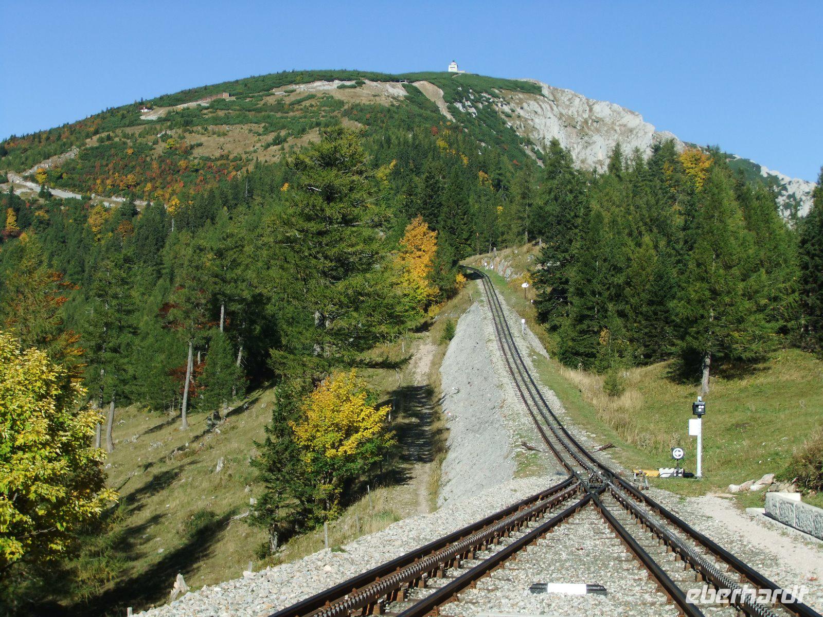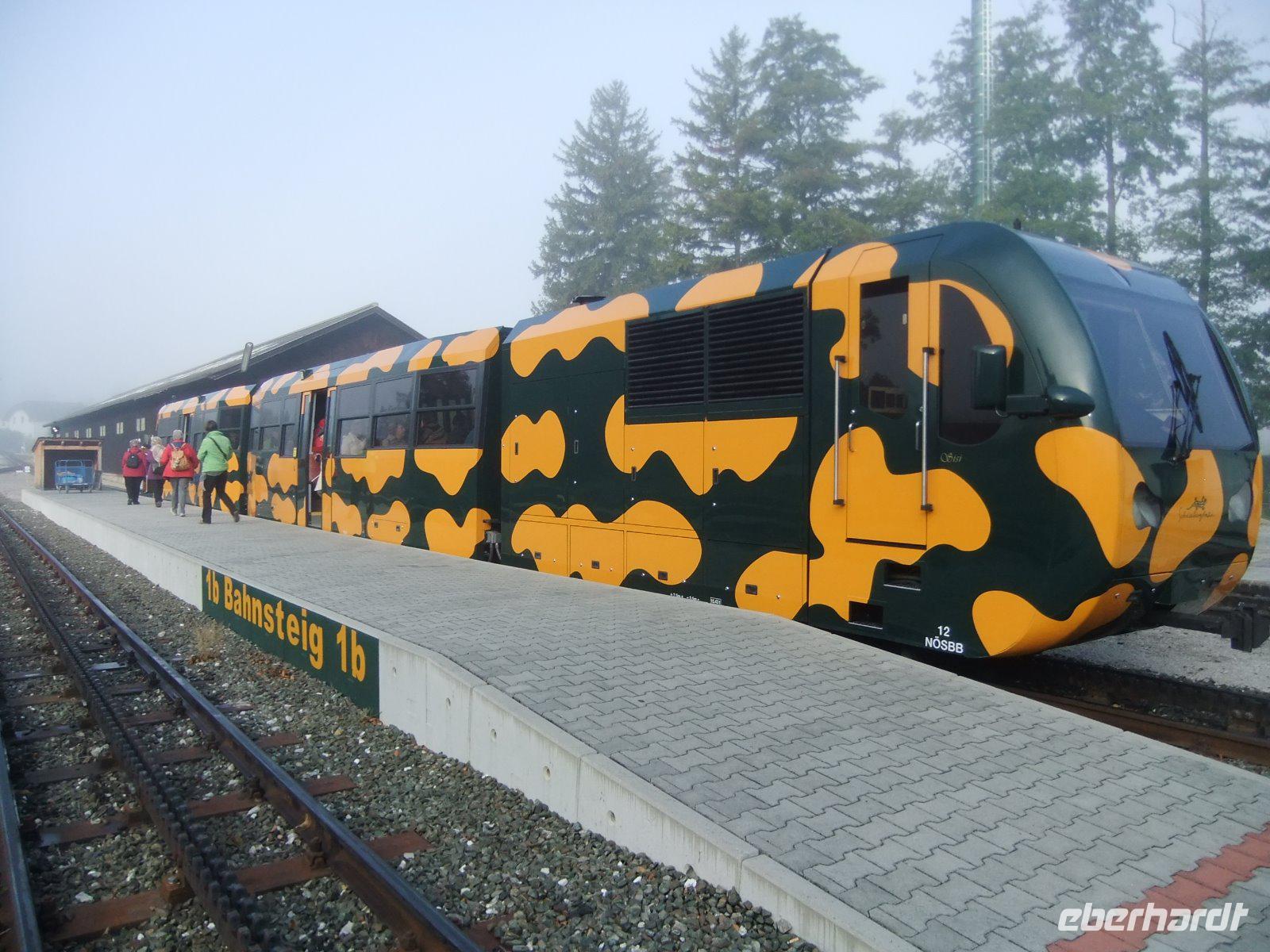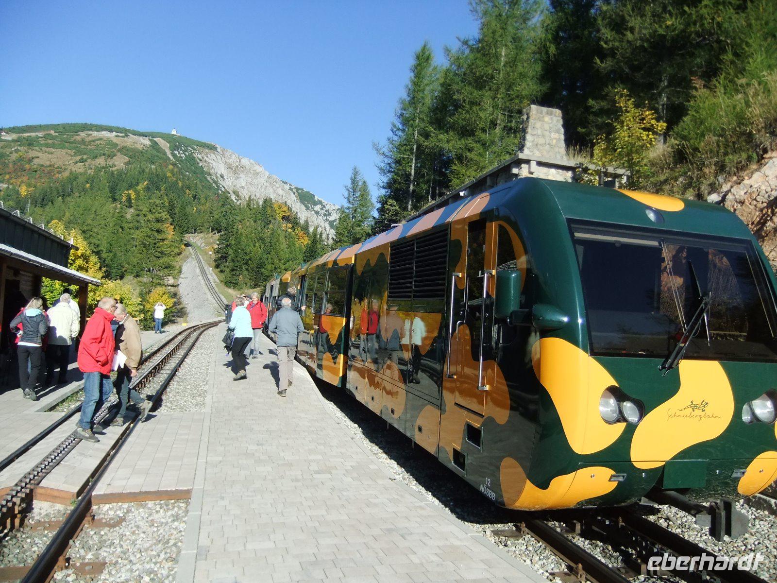 Mit dem Bus geht es über den Aschepass. Je höher wir kommen, umso schöner präsentiert sich das Wetter. Der Himmel zeigt sich strahlend blau. In Puchberg befindet sich der Bahnhof der Schneebergbahn. Diese über 100 Jahre alte Zahnradbahn - auch Salamanderbahn genannt - bringt uns in 40minütiger Fahrt auf 1.800 m Höhe. Unterwegs wird ein Halt am Baumgartnerhaus eingelegt. Hier gibt es die leckeren Schneebergbuchteln. Oben auf dem Schneeberg erwartet uns gleich ein Superlativ: Der Bergbahnhof ist der höchste Bahnhof Österreichs. Nur wenige Schritte, dann sind wir am Elisabethkircherl. Außerdem besuchen wir das Kaleidoskop mit multimedialen Vorführungen und die höchstgelegene Galerie des Landes. Hier erleben wir sogar ein „Schneetreiben". Einige Gäste spazieren dann auf dem „Paradies der Blicke"-Weg mit immer wieder herrlichen Ausblicken in die Bergwelt der Wiener Alpen. Zum Schluss schauen wir noch in das historische Berghaus neben dem Bahnhof. Dann fahren wir mit 19 km/h wieder hinunter nach Puchberg.